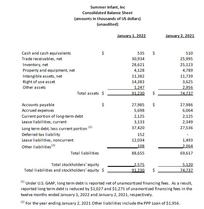 WOONSOCKET, R.I., March 16, 2022 – SUMR Brands ("SUMR Brands" or the "Company") (NASDAQ: SUMR), a global leader in premium infant and juvenile products, today announced financial results for the fiscal fourth quarter ended January 1, 2022.