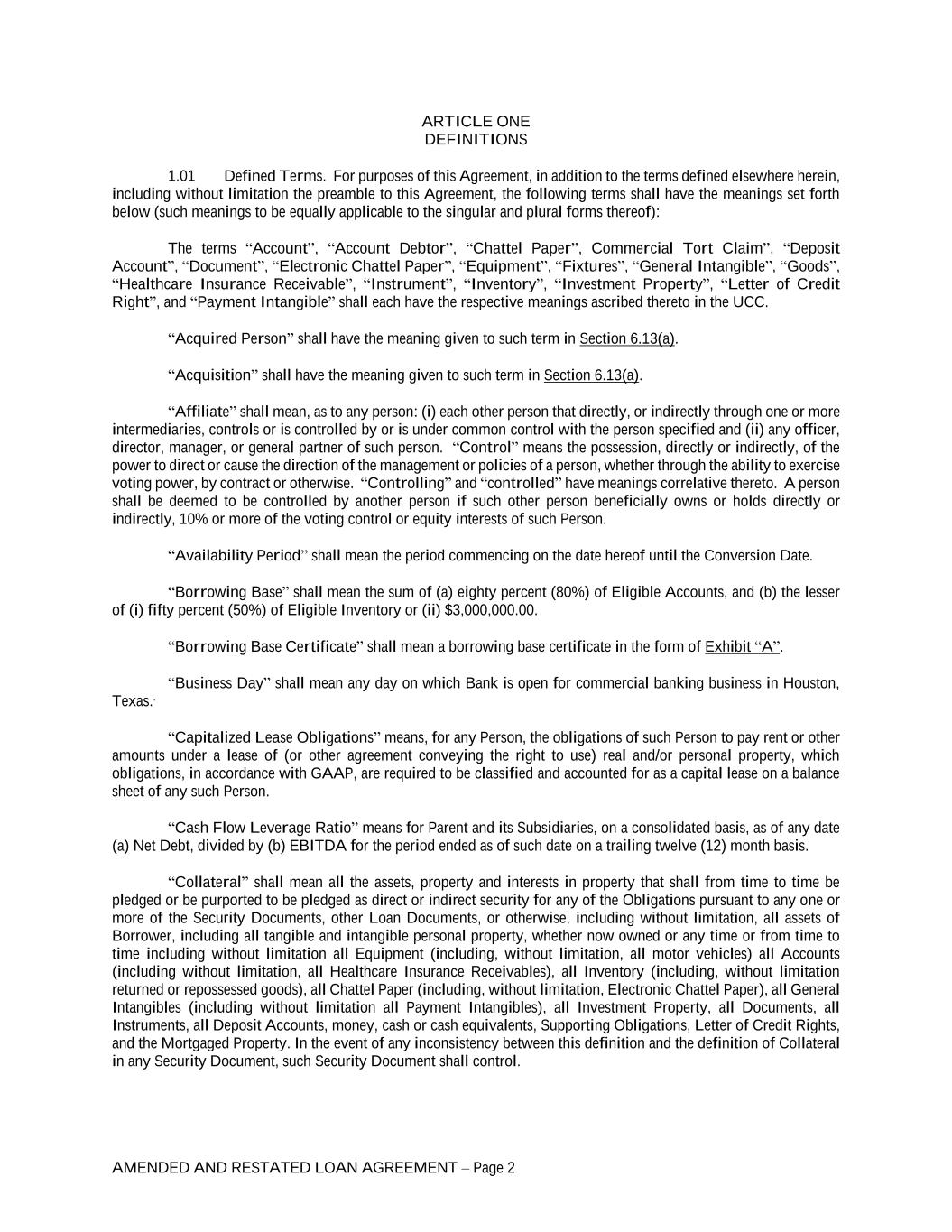 AMENDED AND RESTATED LOAN AGREEMENT – Page 2 ARTICLE ONE DEFINITIONS 1.01 Defined Terms. For purposes of this Agreement, in addition to the terms defined elsewhere herein, including without limitation the preamble to this Agreement, the following terms shall have the meanings set forth below (such meanings to be equally applicable to the singular and plural forms thereof): The terms “Account”, “Account Debtor”, “Chattel Paper”, Commercial Tort Claim”, “Deposit Account”, “Document”, “Electronic Chattel Paper”, “Equipment”, “Fixtures”, “General Intangible”, “Goods”, “Healthcare Insurance Receivable”, “Instrument”, “Inventory”, “Investment Property”, “Letter of Credit Right”, and “Payment Intangible” shall each have the respective meanings ascribed thereto in the UCC. “Acquired Person” shall have the meaning given to such term in Section 6.13(a). “Acquisition” shall have the meaning given to such term in Section 6.13(a). “Affiliate” shall mean, as to any person: (i) each other person that directly, or indirectly through one or more intermediaries, controls or is controlled by or is under common control with the person specified and (ii) any officer, director, manager, or general partner of such person. “Control” means the possession, directly or indirectly, of the power to direct or cause the direction of the management or policies of a person, whether through the ability to exercise voting power, by contract or otherwise. “Controlling” and “controlled” have meanings correlative thereto. A person shall be deemed to be controlled by another person if such other person beneficially owns or holds directly or indirectly, 10% or more of the voting control or equity interests of such Person. “Availability Period” shall mean the period commencing on the date hereof until the Conversion Date. “Borrowing Base” shall mean the sum of (a) eighty percent (80%) of Eligible Accounts, and (b) the lesser of (i) fifty percent (50%) of Eligible Inventory or (ii) $3,000,000.00. “Borrowing Base Certificate” shall mean a borrowing base certificate in the form of Exhibit “A”. “Business Day” shall mean any day on which Bank is open for commercial banking business in Houston, Texas.. “Capitalized Lease Obligations” means, for any Person, the obligations of such Person to pay rent or other amounts under a lease of (or other agreement conveying the right to use) real and/or personal property, which obligations, in accordance with GAAP, are required to be classified and accounted for as a capital lease on a balance sheet of any such Person. “Cash Flow Leverage Ratio” means for Parent and its Subsidiaries, on a consolidated basis, as of any date (a) Net Debt, divided by (b) EBITDA for the period ended as of such date on a trailing twelve (12) month basis. “Collateral” shall mean all the assets, property and interests in property that shall from time to time be pledged or be purported to be pledged as direct or indirect security for any of the Obligations pursuant to any one or more of the Security Documents, other Loan Documents, or otherwise, including without limitation, all assets of Borrower, including all tangible and intangible personal property, whether now owned or any time or from time to time including without limitation all Equipment (including, without limitation, all motor vehicles) all Accounts (including without limitation, all Healthcare Insurance Receivables), all Inventory (including, without limitation returned or repossessed goods), all Chattel Paper (including, without limitation, Electronic Chattel Paper), all General Intangibles (including without limitation all Payment Intangibles), all Investment Property, all Documents, all Instruments, all Deposit Accounts, money, cash or cash equivalents, Supporting Obligations, Letter of Credit Rights, and the Mortgaged Property. In the event of any inconsistency between this definition and the definition of Collateral in any Security Document, such Security Document shall control.