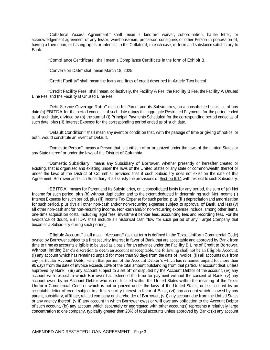 AMENDED AND RESTATED LOAN AGREEMENT – Page 3 “Collateral Access Agreement” shall mean a landlord waiver, subordination, bailee letter, or acknowledgement agreement of any lessor, warehouseman, processor, consignee, or other Person in possession of, having a Lien upon, or having rights or interests in the Collateral, in each case, in form and substance satisfactory to Bank. “Compliance Certificate” shall mean a Compliance Certificate in the form of Exhibit B. “Conversion Date” shall mean March 18, 2025. “Credit Facility” shall mean the loans and lines of credit described in Article Two hereof. “Credit Facility Fees” shall mean, collectively, the Facility A Fee, the Facility B Fee, the Facility A Unused Line Fee, and the Facility B Unused Line Fee. “Debt Service Coverage Ratio” means for Parent and its Subsidiaries, on a consolidated basis, as of any date (a) EBITDA for the period ended as of such date minus the aggregate Restricted Payments for the period ended as of such date, divided by (b) the sum of (i) Principal Payments Scheduled for the corresponding period ended as of such date, plus (ii) Interest Expense for the corresponding period ended as of such date. “Default Condition” shall mean any event or condition that, with the passage of time or giving of notice, or both, would constitute an Event of Default. “Domestic Person” means a Person that is a citizen of or organized under the laws of the United States or any State thereof or under the laws of the District of Columbia. “Domestic Subsidiary” means any Subsidiary of Borrower, whether presently or hereafter created or existing, that is organized and existing under the laws of the United States or any state or commonwealth thereof or under the laws of the District of Columbia; provided that if such Subsidiary does not exist on the date of this Agreement, Borrower and such Subsidiary shall satisfy the provisions of Section 6.14 with respect to such Subsidiary. “EBITDA” means for Parent and its Subsidiaries, on a consolidated basis for any period, the sum of (a) Net Income for such period, plus (b) without duplication and to the extent deducted in determining such Net Income (i) Interest Expense for such period, plus (ii) Income Tax Expense for such period, plus (iii) depreciation and amortization for such period, plus (iv) all other non-cash and/or non-recurring expenses subject to approval of Bank, and less (v) all other non-cash and/or non-recurring income. Non-cash and/or non-recurring expenses include, among other items, one-time acquisition costs, including legal fees, investment banker fees, accounting fees and recording fees. For the avoidance of doubt, EBITDA shall include all historical cash flow for such period of any Target Company that becomes a Subsidiary during such period.. “Eligible Account” shall mean “Accounts” (as that term is defined in the Texas Uniform Commercial Code) owned by Borrower subject to a first security interest in favor of Bank that are acceptable and approved by Bank from time to time as accounts eligible to be used as a basis for an advance under the Facility B Line of Credit to Borrower. Without limiting Bank’s discretion to deem an account unacceptable, the following shall not be an Eligible Account: (i) any account which has remained unpaid for more than 90 days from the date of invoice, (ii) all accounts due from any particular Account Debtor when that portion of the Account Debtor’s which has remained unpaid for more than 90 days from the date of invoice exceeds 10% of the total amount outstanding from that particular account debt, unless approved by Bank, (iii) any account subject to a set off or disputed by the Account Debtor of the account, (iv) any account with respect to which Borrower has extended the time for payment without the consent of Bank, (v) any account owed by an Account Debtor who is not located within the United States within the meaning of the Texas Uniform Commercial Code or which is not organized under the laws of the United States, unless secured by an acceptable letter of credit subject to a first security interest in favor of Bank, (vi) any account which is owed by any parent, subsidiary, affiliate, related company or shareholder of Borrower, (vii) any account due from the United States or any agency thereof, (viii) any account in which Borrower owes or will owe any obligation to the Account Debtor of such account, (ix) any account which separately or aggregated with other account(s) represents a relatively large concentration to one company, typically greater than 20% of total accounts unless approved by Bank; (x) any account