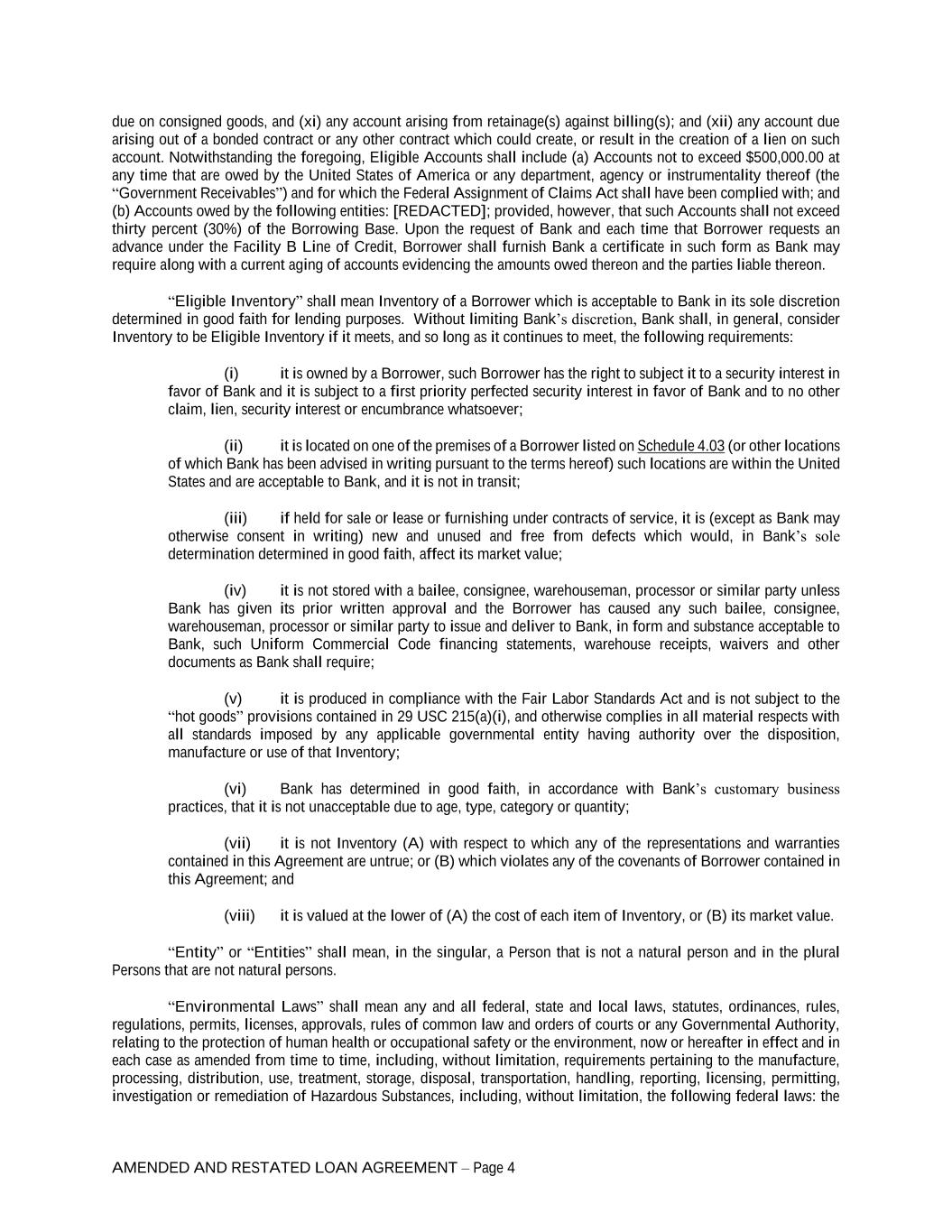 AMENDED AND RESTATED LOAN AGREEMENT – Page 4 due on consigned goods, and (xi) any account arising from retainage(s) against billing(s); and (xii) any account due arising out of a bonded contract or any other contract which could create, or result in the creation of a lien on such account. Notwithstanding the foregoing, Eligible Accounts shall include (a) Accounts not to exceed $500,000.00 at any time that are owed by the United States of America or any department, agency or instrumentality thereof (the “Government Receivables”) and for which the Federal Assignment of Claims Act shall have been complied with; and (b) Accounts owed by the following entities: [REDACTED]; provided, however, that such Accounts shall not exceed thirty percent (30%) of the Borrowing Base. Upon the request of Bank and each time that Borrower requests an advance under the Facility B Line of Credit, Borrower shall furnish Bank a certificate in such form as Bank may require along with a current aging of accounts evidencing the amounts owed thereon and the parties liable thereon. “Eligible Inventory” shall mean Inventory of a Borrower which is acceptable to Bank in its sole discretion determined in good faith for lending purposes. Without limiting Bank’s discretion, Bank shall, in general, consider Inventory to be Eligible Inventory if it meets, and so long as it continues to meet, the following requirements: (i) it is owned by a Borrower, such Borrower has the right to subject it to a security interest in favor of Bank and it is subject to a first priority perfected security interest in favor of Bank and to no other claim, lien, security interest or encumbrance whatsoever; (ii) it is located on one of the premises of a Borrower listed on Schedule 4.03 (or other locations of which Bank has been advised in writing pursuant to the terms hereof) such locations are within the United States and are acceptable to Bank, and it is not in transit; (iii) if held for sale or lease or furnishing under contracts of service, it is (except as Bank may otherwise consent in writing) new and unused and free from defects which would, in Bank’s sole determination determined in good faith, affect its market value; (iv) it is not stored with a bailee, consignee, warehouseman, processor or similar party unless Bank has given its prior written approval and the Borrower has caused any such bailee, consignee, warehouseman, processor or similar party to issue and deliver to Bank, in form and substance acceptable to Bank, such Uniform Commercial Code financing statements, warehouse receipts, waivers and other documents as Bank shall require; (v) it is produced in compliance with the Fair Labor Standards Act and is not subject to the “hot goods” provisions contained in 29 USC 215(a)(i), and otherwise complies in all material respects with all standards imposed by any applicable governmental entity having authority over the disposition, manufacture or use of that Inventory; (vi) Bank has determined in good faith, in accordance with Bank’s customary business practices, that it is not unacceptable due to age, type, category or quantity; (vii) it is not Inventory (A) with respect to which any of the representations and warranties contained in this Agreement are untrue; or (B) which violates any of the covenants of Borrower contained in this Agreement; and (viii) it is valued at the lower of (A) the cost of each item of Inventory, or (B) its market value. “Entity” or “Entities” shall mean, in the singular, a Person that is not a natural person and in the plural Persons that are not natural persons. “Environmental Laws” shall mean any and all federal, state and local laws, statutes, ordinances, rules, regulations, permits, licenses, approvals, rules of common law and orders of courts or any Governmental Authority, relating to the protection of human health or occupational safety or the environment, now or hereafter in effect and in each case as amended from time to time, including, without limitation, requirements pertaining to the manufacture, processing, distribution, use, treatment, storage, disposal, transportation, handling, reporting, licensing, permitting, investigation or remediation of Hazardous Substances, including, without limitation, the following federal laws: the