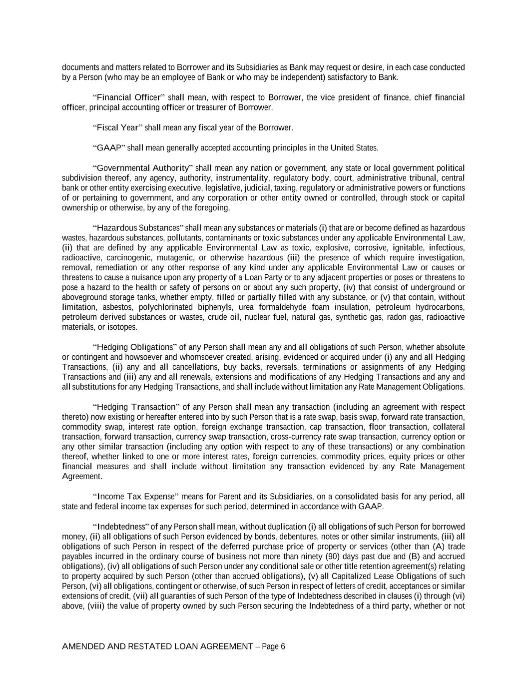 AMENDED AND RESTATED LOAN AGREEMENT – Page 6 documents and matters related to Borrower and its Subsidiaries as Bank may request or desire, in each case conducted by a Person (who may be an employee of Bank or who may be independent) satisfactory to Bank. “Financial Officer” shall mean, with respect to Borrower, the vice president of finance, chief financial officer, principal accounting officer or treasurer of Borrower. “Fiscal Year” shall mean any fiscal year of the Borrower. “GAAP” shall mean generally accepted accounting principles in the United States. “Governmental Authority” shall mean any nation or government, any state or local government political subdivision thereof, any agency, authority, instrumentality, regulatory body, court, administrative tribunal, central bank or other entity exercising executive, legislative, judicial, taxing, regulatory or administrative powers or functions of or pertaining to government, and any corporation or other entity owned or controlled, through stock or capital ownership or otherwise, by any of the foregoing. “Hazardous Substances” shall mean any substances or materials (i) that are or become defined as hazardous wastes, hazardous substances, pollutants, contaminants or toxic substances under any applicable Environmental Law, (ii) that are defined by any applicable Environmental Law as toxic, explosive, corrosive, ignitable, infectious, radioactive, carcinogenic, mutagenic, or otherwise hazardous (iii) the presence of which require investigation, removal, remediation or any other response of any kind under any applicable Environmental Law or causes or threatens to cause a nuisance upon any property of a Loan Party or to any adjacent properties or poses or threatens to pose a hazard to the health or safety of persons on or about any such property, (iv) that consist of underground or aboveground storage tanks, whether empty, filled or partially filled with any substance, or (v) that contain, without limitation, asbestos, polychlorinated biphenyls, urea formaldehyde foam insulation, petroleum hydrocarbons, petroleum derived substances or wastes, crude oil, nuclear fuel, natural gas, synthetic gas, radon gas, radioactive materials, or isotopes. “Hedging Obligations” of any Person shall mean any and all obligations of such Person, whether absolute or contingent and howsoever and whomsoever created, arising, evidenced or acquired under (i) any and all Hedging Transactions, (ii) any and all cancellations, buy backs, reversals, terminations or assignments of any Hedging Transactions and (iii) any and all renewals, extensions and modifications of any Hedging Transactions and any and all substitutions for any Hedging Transactions, and shall include without limitation any Rate Management Obligations. “Hedging Transaction” of any Person shall mean any transaction (including an agreement with respect thereto) now existing or hereafter entered into by such Person that is a rate swap, basis swap, forward rate transaction, commodity swap, interest rate option, foreign exchange transaction, cap transaction, floor transaction, collateral transaction, forward transaction, currency swap transaction, cross-currency rate swap transaction, currency option or any other similar transaction (including any option with respect to any of these transactions) or any combination thereof, whether linked to one or more interest rates, foreign currencies, commodity prices, equity prices or other financial measures and shall include without limitation any transaction evidenced by any Rate Management Agreement. “Income Tax Expense” means for Parent and its Subsidiaries, on a consolidated basis for any period, all state and federal income tax expenses for such period, determined in accordance with GAAP. “Indebtedness” of any Person shall mean, without duplication (i) all obligations of such Person for borrowed money, (ii) all obligations of such Person evidenced by bonds, debentures, notes or other similar instruments, (iii) all obligations of such Person in respect of the deferred purchase price of property or services (other than (A) trade payables incurred in the ordinary course of business not more than ninety (90) days past due and (B) and accrued obligations), (iv) all obligations of such Person under any conditional sale or other title retention agreement(s) relating to property acquired by such Person (other than accrued obligations), (v) all Capitalized Lease Obligations of such Person, (vi) all obligations, contingent or otherwise, of such Person in respect of letters of credit, acceptances or similar extensions of credit, (vii) all guaranties of such Person of the type of Indebtedness described in clauses (i) through (vi) above, (viii) the value of property owned by such Person securing the Indebtedness of a third party, whether or not