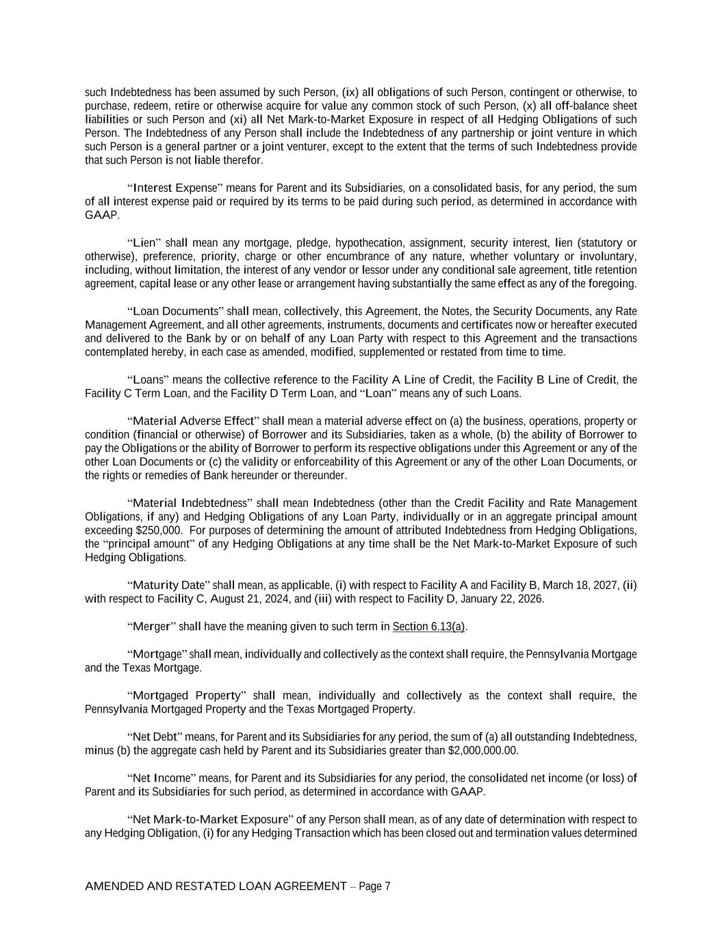 AMENDED AND RESTATED LOAN AGREEMENT – Page 7 such Indebtedness has been assumed by such Person, (ix) all obligations of such Person, contingent or otherwise, to purchase, redeem, retire or otherwise acquire for value any common stock of such Person, (x) all off-balance sheet liabilities or such Person and (xi) all Net Mark-to-Market Exposure in respect of all Hedging Obligations of such Person. The Indebtedness of any Person shall include the Indebtedness of any partnership or joint venture in which such Person is a general partner or a joint venturer, except to the extent that the terms of such Indebtedness provide that such Person is not liable therefor. “Interest Expense” means for Parent and its Subsidiaries, on a consolidated basis, for any period, the sum of all interest expense paid or required by its terms to be paid during such period, as determined in accordance with GAAP. “Lien” shall mean any mortgage, pledge, hypothecation, assignment, security interest, lien (statutory or otherwise), preference, priority, charge or other encumbrance of any nature, whether voluntary or involuntary, including, without limitation, the interest of any vendor or lessor under any conditional sale agreement, title retention agreement, capital lease or any other lease or arrangement having substantially the same effect as any of the foregoing. “Loan Documents” shall mean, collectively, this Agreement, the Notes, the Security Documents, any Rate Management Agreement, and all other agreements, instruments, documents and certificates now or hereafter executed and delivered to the Bank by or on behalf of any Loan Party with respect to this Agreement and the transactions contemplated hereby, in each case as amended, modified, supplemented or restated from time to time. “Loans” means the collective reference to the Facility A Line of Credit, the Facility B Line of Credit, the Facility C Term Loan, and the Facility D Term Loan, and “Loan” means any of such Loans. “Material Adverse Effect” shall mean a material adverse effect on (a) the business, operations, property or condition (financial or otherwise) of Borrower and its Subsidiaries, taken as a whole, (b) the ability of Borrower to pay the Obligations or the ability of Borrower to perform its respective obligations under this Agreement or any of the other Loan Documents or (c) the validity or enforceability of this Agreement or any of the other Loan Documents, or the rights or remedies of Bank hereunder or thereunder. “Material Indebtedness” shall mean Indebtedness (other than the Credit Facility and Rate Management Obligations, if any) and Hedging Obligations of any Loan Party, individually or in an aggregate principal amount exceeding $250,000. For purposes of determining the amount of attributed Indebtedness from Hedging Obligations, the “principal amount” of any Hedging Obligations at any time shall be the Net Mark-to-Market Exposure of such Hedging Obligations. “Maturity Date” shall mean, as applicable, (i) with respect to Facility A and Facility B, March 18, 2027, (ii) with respect to Facility C, August 21, 2024, and (iii) with respect to Facility D, January 22, 2026. “Merger” shall have the meaning given to such term in Section 6.13(a). “Mortgage” shall mean, individually and collectively as the context shall require, the Pennsylvania Mortgage and the Texas Mortgage. “Mortgaged Property” shall mean, individually and collectively as the context shall require, the Pennsylvania Mortgaged Property and the Texas Mortgaged Property. “Net Debt” means, for Parent and its Subsidiaries for any period, the sum of (a) all outstanding Indebtedness, minus (b) the aggregate cash held by Parent and its Subsidiaries greater than $2,000,000.00. “Net Income” means, for Parent and its Subsidiaries for any period, the consolidated net income (or loss) of Parent and its Subsidiaries for such period, as determined in accordance with GAAP. “Net Mark-to-Market Exposure” of any Person shall mean, as of any date of determination with respect to any Hedging Obligation, (i) for any Hedging Transaction which has been closed out and termination values determined