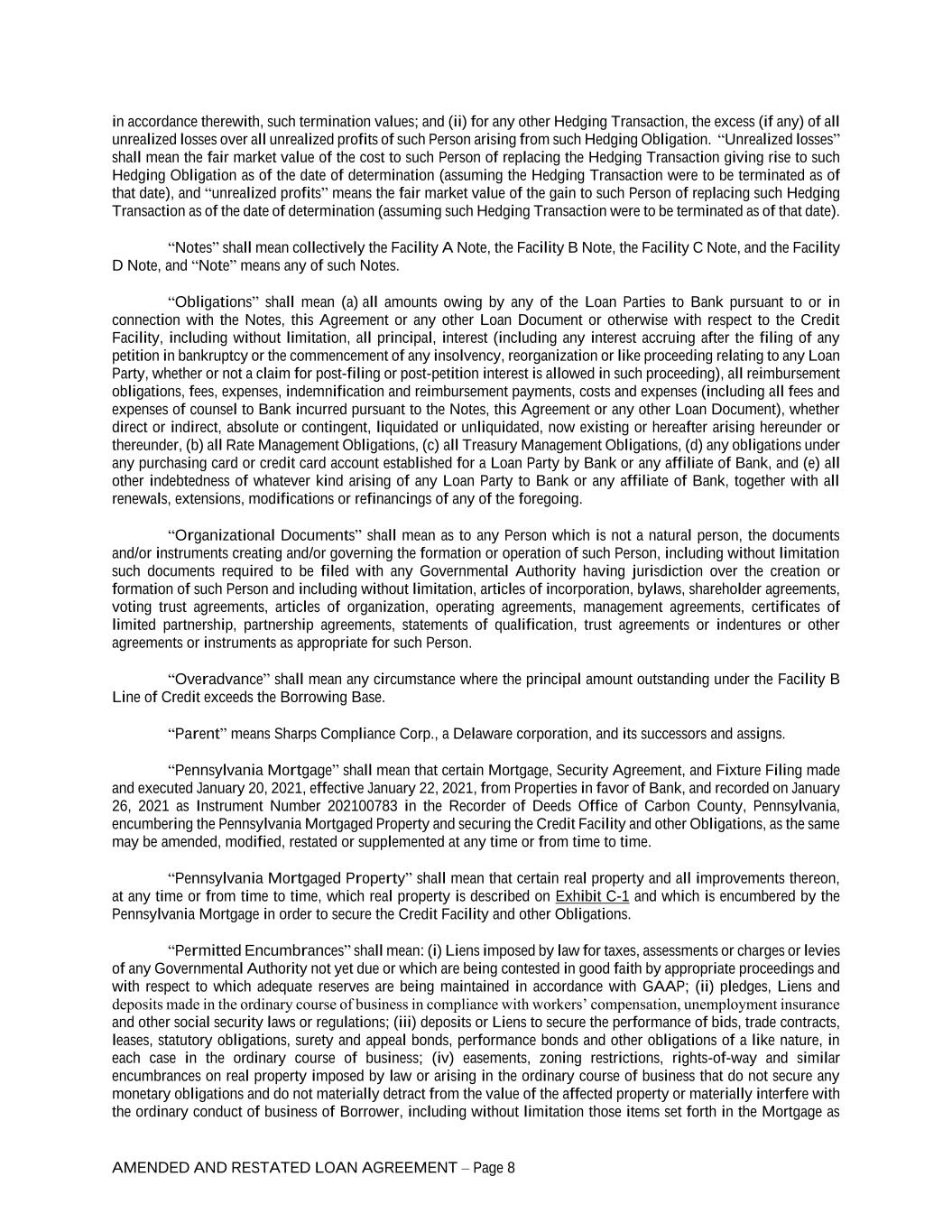 AMENDED AND RESTATED LOAN AGREEMENT – Page 8 in accordance therewith, such termination values; and (ii) for any other Hedging Transaction, the excess (if any) of all unrealized losses over all unrealized profits of such Person arising from such Hedging Obligation. “Unrealized losses” shall mean the fair market value of the cost to such Person of replacing the Hedging Transaction giving rise to such Hedging Obligation as of the date of determination (assuming the Hedging Transaction were to be terminated as of that date), and “unrealized profits” means the fair market value of the gain to such Person of replacing such Hedging Transaction as of the date of determination (assuming such Hedging Transaction were to be terminated as of that date). “Notes” shall mean collectively the Facility A Note, the Facility B Note, the Facility C Note, and the Facility D Note, and “Note” means any of such Notes. “Obligations” shall mean (a) all amounts owing by any of the Loan Parties to Bank pursuant to or in connection with the Notes, this Agreement or any other Loan Document or otherwise with respect to the Credit Facility, including without limitation, all principal, interest (including any interest accruing after the filing of any petition in bankruptcy or the commencement of any insolvency, reorganization or like proceeding relating to any Loan Party, whether or not a claim for post-filing or post-petition interest is allowed in such proceeding), all reimbursement obligations, fees, expenses, indemnification and reimbursement payments, costs and expenses (including all fees and expenses of counsel to Bank incurred pursuant to the Notes, this Agreement or any other Loan Document), whether direct or indirect, absolute or contingent, liquidated or unliquidated, now existing or hereafter arising hereunder or thereunder, (b) all Rate Management Obligations, (c) all Treasury Management Obligations, (d) any obligations under any purchasing card or credit card account established for a Loan Party by Bank or any affiliate of Bank, and (e) all other indebtedness of whatever kind arising of any Loan Party to Bank or any affiliate of Bank, together with all renewals, extensions, modifications or refinancings of any of the foregoing. “Organizational Documents” shall mean as to any Person which is not a natural person, the documents and/or instruments creating and/or governing the formation or operation of such Person, including without limitation such documents required to be filed with any Governmental Authority having jurisdiction over the creation or formation of such Person and including without limitation, articles of incorporation, bylaws, shareholder agreements, voting trust agreements, articles of organization, operating agreements, management agreements, certificates of limited partnership, partnership agreements, statements of qualification, trust agreements or indentures or other agreements or instruments as appropriate for such Person. “Overadvance” shall mean any circumstance where the principal amount outstanding under the Facility B Line of Credit exceeds the Borrowing Base. “Parent” means Sharps Compliance Corp., a Delaware corporation, and its successors and assigns. “Pennsylvania Mortgage” shall mean that certain Mortgage, Security Agreement, and Fixture Filing made and executed January 20, 2021, effective January 22, 2021, from Properties in favor of Bank, and recorded on January 26, 2021 as Instrument Number 202100783 in the Recorder of Deeds Office of Carbon County, Pennsylvania, encumbering the Pennsylvania Mortgaged Property and securing the Credit Facility and other Obligations, as the same may be amended, modified, restated or supplemented at any time or from time to time. “Pennsylvania Mortgaged Property” shall mean that certain real property and all improvements thereon, at any time or from time to time, which real property is described on Exhibit C-1 and which is encumbered by the Pennsylvania Mortgage in order to secure the Credit Facility and other Obligations. “Permitted Encumbrances” shall mean: (i) Liens imposed by law for taxes, assessments or charges or levies of any Governmental Authority not yet due or which are being contested in good faith by appropriate proceedings and with respect to which adequate reserves are being maintained in accordance with GAAP; (ii) pledges, Liens and deposits made in the ordinary course of business in compliance with workers’ compensation, unemployment insurance and other social security laws or regulations; (iii) deposits or Liens to secure the performance of bids, trade contracts, leases, statutory obligations, surety and appeal bonds, performance bonds and other obligations of a like nature, in each case in the ordinary course of business; (iv) easements, zoning restrictions, rights-of-way and similar encumbrances on real property imposed by law or arising in the ordinary course of business that do not secure any monetary obligations and do not materially detract from the value of the affected property or materially interfere with the ordinary conduct of business of Borrower, including without limitation those items set forth in the Mortgage as
