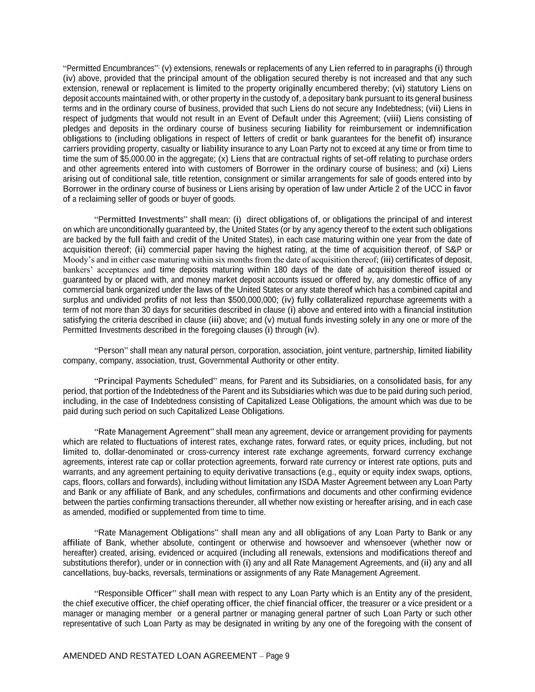 AMENDED AND RESTATED LOAN AGREEMENT – Page 9 “Permitted Encumbrances”; (v) extensions, renewals or replacements of any Lien referred to in paragraphs (i) through (iv) above, provided that the principal amount of the obligation secured thereby is not increased and that any such extension, renewal or replacement is limited to the property originally encumbered thereby; (vi) statutory Liens on deposit accounts maintained with, or other property in the custody of, a depositary bank pursuant to its general business terms and in the ordinary course of business, provided that such Liens do not secure any Indebtedness; (vii) Liens in respect of judgments that would not result in an Event of Default under this Agreement; (viii) Liens consisting of pledges and deposits in the ordinary course of business securing liability for reimbursement or indemnification obligations to (including obligations in respect of letters of credit or bank guarantees for the benefit of) insurance carriers providing property, casualty or liability insurance to any Loan Party not to exceed at any time or from time to time the sum of $5,000.00 in the aggregate; (x) Liens that are contractual rights of set-off relating to purchase orders and other agreements entered into with customers of Borrower in the ordinary course of business; and (xi) Liens arising out of conditional sale, title retention, consignment or similar arrangements for sale of goods entered into by Borrower in the ordinary course of business or Liens arising by operation of law under Article 2 of the UCC in favor of a reclaiming seller of goods or buyer of goods. “Permitted Investments” shall mean: (i) direct obligations of, or obligations the principal of and interest on which are unconditionally guaranteed by, the United States (or by any agency thereof to the extent such obligations are backed by the full faith and credit of the United States), in each case maturing within one year from the date of acquisition thereof; (ii) commercial paper having the highest rating, at the time of acquisition thereof, of S&P or Moody’s and in either case maturing within six months from the date of acquisition thereof; (iii) certificates of deposit, bankers’ acceptances and time deposits maturing within 180 days of the date of acquisition thereof issued or guaranteed by or placed with, and money market deposit accounts issued or offered by, any domestic office of any commercial bank organized under the laws of the United States or any state thereof which has a combined capital and surplus and undivided profits of not less than $500,000,000; (iv) fully collateralized repurchase agreements with a term of not more than 30 days for securities described in clause (i) above and entered into with a financial institution satisfying the criteria described in clause (iii) above; and (v) mutual funds investing solely in any one or more of the Permitted Investments described in the foregoing clauses (i) through (iv). “Person” shall mean any natural person, corporation, association, joint venture, partnership, limited liability company, company, association, trust, Governmental Authority or other entity. “Principal Payments Scheduled” means, for Parent and its Subsidiaries, on a consolidated basis, for any period, that portion of the Indebtedness of the Parent and its Subsidiaries which was due to be paid during such period, including, in the case of Indebtedness consisting of Capitalized Lease Obligations, the amount which was due to be paid during such period on such Capitalized Lease Obligations. “Rate Management Agreement” shall mean any agreement, device or arrangement providing for payments which are related to fluctuations of interest rates, exchange rates, forward rates, or equity prices, including, but not limited to, dollar-denominated or cross-currency interest rate exchange agreements, forward currency exchange agreements, interest rate cap or collar protection agreements, forward rate currency or interest rate options, puts and warrants, and any agreement pertaining to equity derivative transactions (e.g., equity or equity index swaps, options, caps, floors, collars and forwards), including without limitation any ISDA Master Agreement between any Loan Party and Bank or any affiliate of Bank, and any schedules, confirmations and documents and other confirming evidence between the parties confirming transactions thereunder, all whether now existing or hereafter arising, and in each case as amended, modified or supplemented from time to time. “Rate Management Obligations” shall mean any and all obligations of any Loan Party to Bank or any affiliate of Bank, whether absolute, contingent or otherwise and howsoever and whensoever (whether now or hereafter) created, arising, evidenced or acquired (including all renewals, extensions and modifications thereof and substitutions therefor), under or in connection with (i) any and all Rate Management Agreements, and (ii) any and all cancellations, buy-backs, reversals, terminations or assignments of any Rate Management Agreement. “Responsible Officer” shall mean with respect to any Loan Party which is an Entity any of the president, the chief executive officer, the chief operating officer, the chief financial officer, the treasurer or a vice president or a manager or managing member or a general partner or managing general partner of such Loan Party or such other representative of such Loan Party as may be designated in writing by any one of the foregoing with the consent of