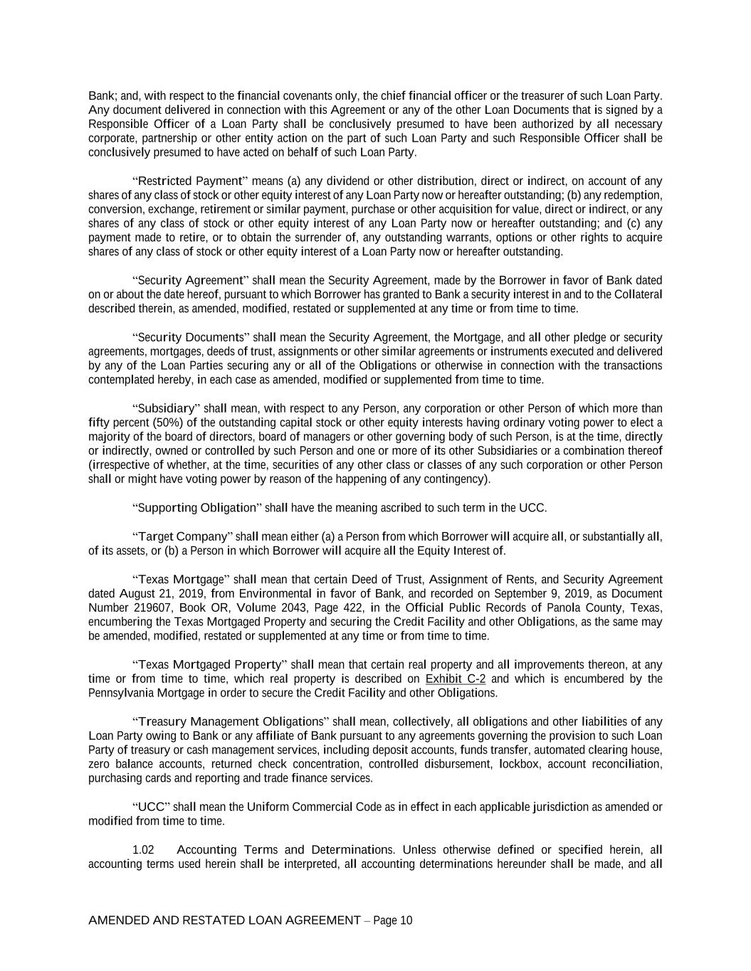 AMENDED AND RESTATED LOAN AGREEMENT – Page 10 Bank; and, with respect to the financial covenants only, the chief financial officer or the treasurer of such Loan Party. Any document delivered in connection with this Agreement or any of the other Loan Documents that is signed by a Responsible Officer of a Loan Party shall be conclusively presumed to have been authorized by all necessary corporate, partnership or other entity action on the part of such Loan Party and such Responsible Officer shall be conclusively presumed to have acted on behalf of such Loan Party. “Restricted Payment” means (a) any dividend or other distribution, direct or indirect, on account of any shares of any class of stock or other equity interest of any Loan Party now or hereafter outstanding; (b) any redemption, conversion, exchange, retirement or similar payment, purchase or other acquisition for value, direct or indirect, or any shares of any class of stock or other equity interest of any Loan Party now or hereafter outstanding; and (c) any payment made to retire, or to obtain the surrender of, any outstanding warrants, options or other rights to acquire shares of any class of stock or other equity interest of a Loan Party now or hereafter outstanding. “Security Agreement” shall mean the Security Agreement, made by the Borrower in favor of Bank dated on or about the date hereof, pursuant to which Borrower has granted to Bank a security interest in and to the Collateral described therein, as amended, modified, restated or supplemented at any time or from time to time. “Security Documents” shall mean the Security Agreement, the Mortgage, and all other pledge or security agreements, mortgages, deeds of trust, assignments or other similar agreements or instruments executed and delivered by any of the Loan Parties securing any or all of the Obligations or otherwise in connection with the transactions contemplated hereby, in each case as amended, modified or supplemented from time to time. “Subsidiary” shall mean, with respect to any Person, any corporation or other Person of which more than fifty percent (50%) of the outstanding capital stock or other equity interests having ordinary voting power to elect a majority of the board of directors, board of managers or other governing body of such Person, is at the time, directly or indirectly, owned or controlled by such Person and one or more of its other Subsidiaries or a combination thereof (irrespective of whether, at the time, securities of any other class or classes of any such corporation or other Person shall or might have voting power by reason of the happening of any contingency). “Supporting Obligation” shall have the meaning ascribed to such term in the UCC. “Target Company” shall mean either (a) a Person from which Borrower will acquire all, or substantially all, of its assets, or (b) a Person in which Borrower will acquire all the Equity Interest of. “Texas Mortgage” shall mean that certain Deed of Trust, Assignment of Rents, and Security Agreement dated August 21, 2019, from Environmental in favor of Bank, and recorded on September 9, 2019, as Document Number 219607, Book OR, Volume 2043, Page 422, in the Official Public Records of Panola County, Texas, encumbering the Texas Mortgaged Property and securing the Credit Facility and other Obligations, as the same may be amended, modified, restated or supplemented at any time or from time to time. “Texas Mortgaged Property” shall mean that certain real property and all improvements thereon, at any time or from time to time, which real property is described on Exhibit C-2 and which is encumbered by the Pennsylvania Mortgage in order to secure the Credit Facility and other Obligations. “Treasury Management Obligations” shall mean, collectively, all obligations and other liabilities of any Loan Party owing to Bank or any affiliate of Bank pursuant to any agreements governing the provision to such Loan Party of treasury or cash management services, including deposit accounts, funds transfer, automated clearing house, zero balance accounts, returned check concentration, controlled disbursement, lockbox, account reconciliation, purchasing cards and reporting and trade finance services. “UCC” shall mean the Uniform Commercial Code as in effect in each applicable jurisdiction as amended or modified from time to time. 1.02 Accounting Terms and Determinations. Unless otherwise defined or specified herein, all accounting terms used herein shall be interpreted, all accounting determinations hereunder shall be made, and all