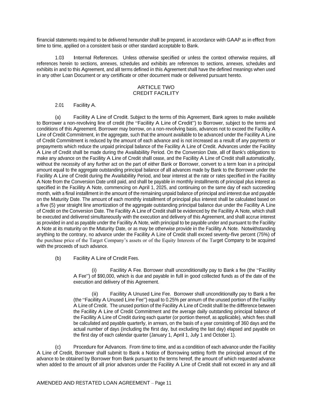 AMENDED AND RESTATED LOAN AGREEMENT – Page 11 financial statements required to be delivered hereunder shall be prepared, in accordance with GAAP as in effect from time to time, applied on a consistent basis or other standard acceptable to Bank. 1.03 Internal References. Unless otherwise specified or unless the context otherwise requires, all references herein to sections, annexes, schedules and exhibits are references to sections, annexes, schedules and exhibits in and to this Agreement, and all terms defined in this Agreement shall have the defined meanings when used in any other Loan Document or any certificate or other document made or delivered pursuant hereto. ARTICLE TWO CREDIT FACILITY 2.01 Facility A. (a) Facility A Line of Credit. Subject to the terms of this Agreement, Bank agrees to make available to Borrower a non-revolving line of credit (the “Facility A Line of Credit”) to Borrower, subject to the terms and conditions of this Agreement. Borrower may borrow, on a non-revolving basis, advances not to exceed the Facility A Line of Credit Commitment, in the aggregate, such that the amount available to be advanced under the Facility A Line of Credit Commitment is reduced by the amount of each advance and is not increased as a result of any payments or prepayments which reduce the unpaid principal balance of the Facility A Line of Credit. Advances under the Facility A Line of Credit shall be made during the Availability Period. On the Conversion Date, all of Bank's obligations to make any advance on the Facility A Line of Credit shall cease, and the Facility A Line of Credit shall automatically, without the necessity of any further act on the part of either Bank or Borrower, convert to a term loan in a principal amount equal to the aggregate outstanding principal balance of all advances made by Bank to the Borrower under the Facility A Line of Credit during the Availability Period, and bear interest at the rate or rates specified in the Facility A Note from the Conversion Date until paid, and shall be payable in monthly installments of principal plus interest as specified in the Facility A Note, commencing on April 1, 2025, and continuing on the same day of each succeeding month, with a final installment in the amount of the remaining unpaid balance of principal and interest due and payable on the Maturity Date. The amount of each monthly installment of principal plus interest shall be calculated based on a five (5) year straight line amortization of the aggregate outstanding principal balance due under the Facility A Line of Credit on the Conversion Date. The Facility A Line of Credit shall be evidenced by the Facility A Note, which shall be executed and delivered simultaneously with the execution and delivery of this Agreement, and shall accrue interest as provided in and as payable under the Facility A Note, with principal to be payable under and pursuant to the Facility A Note at its maturity on the Maturity Date, or as may be otherwise provide in the Facility A Note. Notwithstanding anything to the contrary, no advance under the Facility A Line of Credit shall exceed seventy-five percent (75%) of the purchase price of the Target Company’s assets or of the Equity Interests of the Target Company to be acquired with the proceeds of such advance. (b) Facility A Line of Credit Fees. (i) Facility A Fee. Borrower shall unconditionally pay to Bank a fee (the “Facility A Fee”) of $90,000, which is due and payable in full in good collected funds as of the date of the execution and delivery of this Agreement. (ii) Facility A Unused Line Fee. Borrower shall unconditionally pay to Bank a fee (the “Facility A Unused Line Fee”) equal to 0.25% per annum of the unused portion of the Facility A Line of Credit. The unused portion of the Facility A Line of Credit shall be the difference between the Facility A Line of Credit Commitment and the average daily outstanding principal balance of the Facility A Line of Credit during each quarter (or portion thereof, as applicable), which fees shall be calculated and payable quarterly, in arrears, on the basis of a year consisting of 360 days and the actual number of days (including the first day, but excluding the last day) elapsed and payable on the first day of each calendar quarter (January 1, April 1, July 1 and October 1). (c) Procedure for Advances. From time to time, and as a condition of each advance under the Facility A Line of Credit, Borrower shall submit to Bank a Notice of Borrowing setting forth the principal amount of the advance to be obtained by Borrower from Bank pursuant to the terms hereof, the amount of which requested advance when added to the amount of all prior advances under the Facility A Line of Credit shall not exceed in any and all