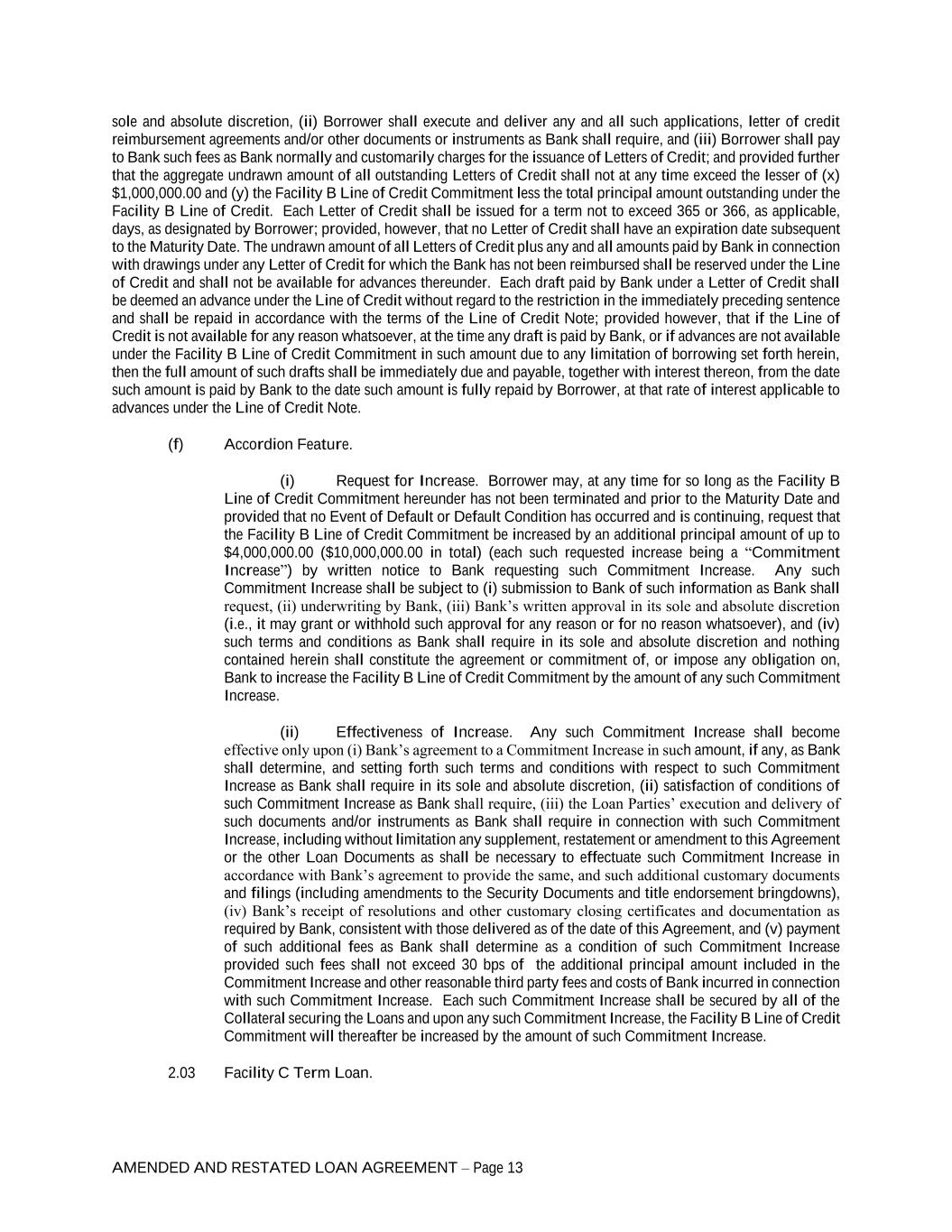 AMENDED AND RESTATED LOAN AGREEMENT – Page 13 sole and absolute discretion, (ii) Borrower shall execute and deliver any and all such applications, letter of credit reimbursement agreements and/or other documents or instruments as Bank shall require, and (iii) Borrower shall pay to Bank such fees as Bank normally and customarily charges for the issuance of Letters of Credit; and provided further that the aggregate undrawn amount of all outstanding Letters of Credit shall not at any time exceed the lesser of (x) $1,000,000.00 and (y) the Facility B Line of Credit Commitment less the total principal amount outstanding under the Facility B Line of Credit. Each Letter of Credit shall be issued for a term not to exceed 365 or 366, as applicable, days, as designated by Borrower; provided, however, that no Letter of Credit shall have an expiration date subsequent to the Maturity Date. The undrawn amount of all Letters of Credit plus any and all amounts paid by Bank in connection with drawings under any Letter of Credit for which the Bank has not been reimbursed shall be reserved under the Line of Credit and shall not be available for advances thereunder. Each draft paid by Bank under a Letter of Credit shall be deemed an advance under the Line of Credit without regard to the restriction in the immediately preceding sentence and shall be repaid in accordance with the terms of the Line of Credit Note; provided however, that if the Line of Credit is not available for any reason whatsoever, at the time any draft is paid by Bank, or if advances are not available under the Facility B Line of Credit Commitment in such amount due to any limitation of borrowing set forth herein, then the full amount of such drafts shall be immediately due and payable, together with interest thereon, from the date such amount is paid by Bank to the date such amount is fully repaid by Borrower, at that rate of interest applicable to advances under the Line of Credit Note. (f) Accordion Feature. (i) Request for Increase. Borrower may, at any time for so long as the Facility B Line of Credit Commitment hereunder has not been terminated and prior to the Maturity Date and provided that no Event of Default or Default Condition has occurred and is continuing, request that the Facility B Line of Credit Commitment be increased by an additional principal amount of up to $4,000,000.00 ($10,000,000.00 in total) (each such requested increase being a “Commitment Increase”) by written notice to Bank requesting such Commitment Increase. Any such Commitment Increase shall be subject to (i) submission to Bank of such information as Bank shall request, (ii) underwriting by Bank, (iii) Bank’s written approval in its sole and absolute discretion (i.e., it may grant or withhold such approval for any reason or for no reason whatsoever), and (iv) such terms and conditions as Bank shall require in its sole and absolute discretion and nothing contained herein shall constitute the agreement or commitment of, or impose any obligation on, Bank to increase the Facility B Line of Credit Commitment by the amount of any such Commitment Increase. (ii) Effectiveness of Increase. Any such Commitment Increase shall become effective only upon (i) Bank’s agreement to a Commitment Increase in such amount, if any, as Bank shall determine, and setting forth such terms and conditions with respect to such Commitment Increase as Bank shall require in its sole and absolute discretion, (ii) satisfaction of conditions of such Commitment Increase as Bank shall require, (iii) the Loan Parties’ execution and delivery of such documents and/or instruments as Bank shall require in connection with such Commitment Increase, including without limitation any supplement, restatement or amendment to this Agreement or the other Loan Documents as shall be necessary to effectuate such Commitment Increase in accordance with Bank’s agreement to provide the same, and such additional customary documents and filings (including amendments to the Security Documents and title endorsement bringdowns), (iv) Bank’s receipt of resolutions and other customary closing certificates and documentation as required by Bank, consistent with those delivered as of the date of this Agreement, and (v) payment of such additional fees as Bank shall determine as a condition of such Commitment Increase provided such fees shall not exceed 30 bps of the additional principal amount included in the Commitment Increase and other reasonable third party fees and costs of Bank incurred in connection with such Commitment Increase. Each such Commitment Increase shall be secured by all of the Collateral securing the Loans and upon any such Commitment Increase, the Facility B Line of Credit Commitment will thereafter be increased by the amount of such Commitment Increase. 2.03 Facility C Term Loan.