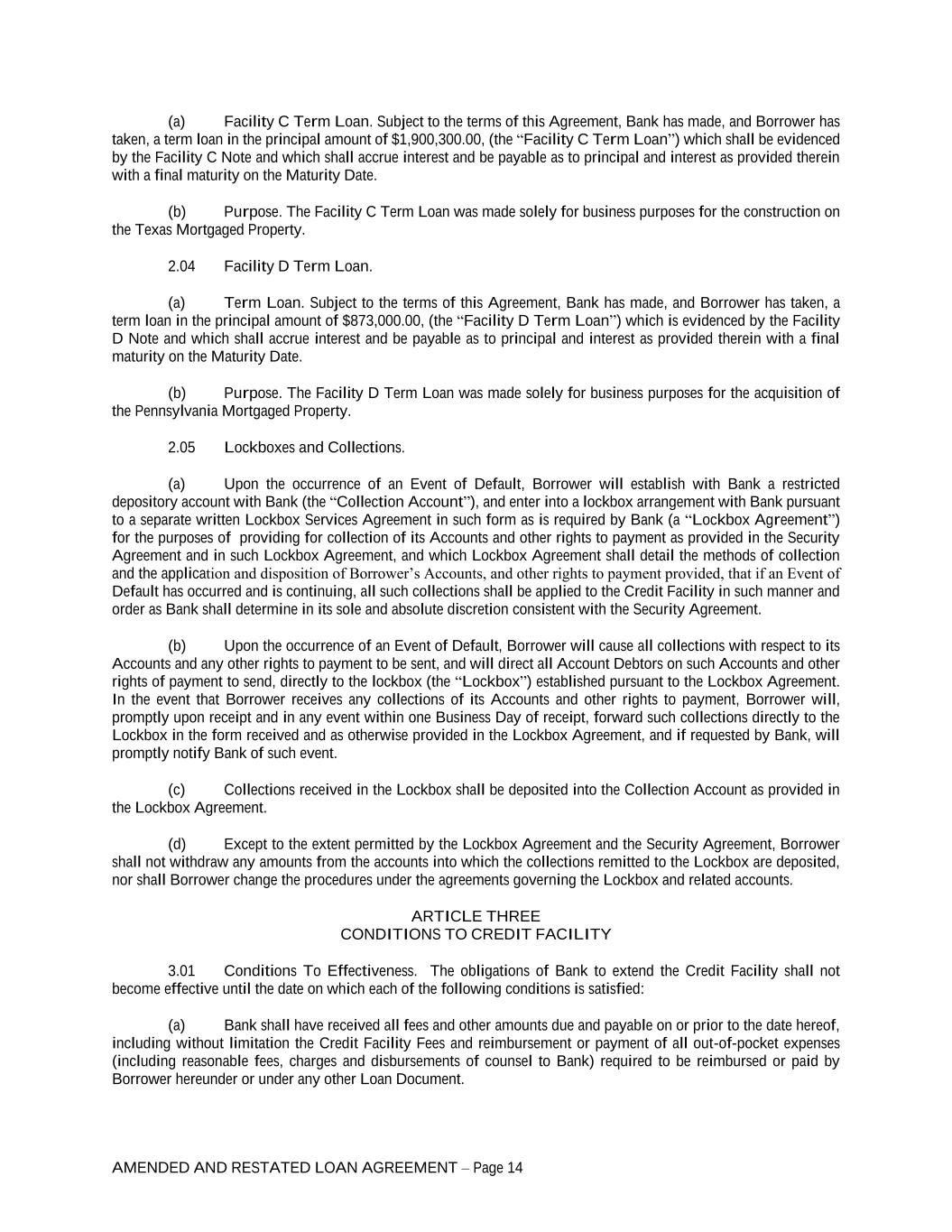 AMENDED AND RESTATED LOAN AGREEMENT – Page 14 (a) Facility C Term Loan. Subject to the terms of this Agreement, Bank has made, and Borrower has taken, a term loan in the principal amount of $1,900,300.00, (the “Facility C Term Loan”) which shall be evidenced by the Facility C Note and which shall accrue interest and be payable as to principal and interest as provided therein with a final maturity on the Maturity Date. (b) Purpose. The Facility C Term Loan was made solely for business purposes for the construction on the Texas Mortgaged Property. 2.04 Facility D Term Loan. (a) Term Loan. Subject to the terms of this Agreement, Bank has made, and Borrower has taken, a term loan in the principal amount of $873,000.00, (the “Facility D Term Loan”) which is evidenced by the Facility D Note and which shall accrue interest and be payable as to principal and interest as provided therein with a final maturity on the Maturity Date. (b) Purpose. The Facility D Term Loan was made solely for business purposes for the acquisition of the Pennsylvania Mortgaged Property. 2.05 Lockboxes and Collections. (a) Upon the occurrence of an Event of Default, Borrower will establish with Bank a restricted depository account with Bank (the “Collection Account”), and enter into a lockbox arrangement with Bank pursuant to a separate written Lockbox Services Agreement in such form as is required by Bank (a “Lockbox Agreement”) for the purposes of providing for collection of its Accounts and other rights to payment as provided in the Security Agreement and in such Lockbox Agreement, and which Lockbox Agreement shall detail the methods of collection and the application and disposition of Borrower’s Accounts, and other rights to payment provided, that if an Event of Default has occurred and is continuing, all such collections shall be applied to the Credit Facility in such manner and order as Bank shall determine in its sole and absolute discretion consistent with the Security Agreement. (b) Upon the occurrence of an Event of Default, Borrower will cause all collections with respect to its Accounts and any other rights to payment to be sent, and will direct all Account Debtors on such Accounts and other rights of payment to send, directly to the lockbox (the “Lockbox”) established pursuant to the Lockbox Agreement. In the event that Borrower receives any collections of its Accounts and other rights to payment, Borrower will, promptly upon receipt and in any event within one Business Day of receipt, forward such collections directly to the Lockbox in the form received and as otherwise provided in the Lockbox Agreement, and if requested by Bank, will promptly notify Bank of such event. (c) Collections received in the Lockbox shall be deposited into the Collection Account as provided in the Lockbox Agreement. (d) Except to the extent permitted by the Lockbox Agreement and the Security Agreement, Borrower shall not withdraw any amounts from the accounts into which the collections remitted to the Lockbox are deposited, nor shall Borrower change the procedures under the agreements governing the Lockbox and related accounts. ARTICLE THREE CONDITIONS TO CREDIT FACILITY 3.01 Conditions To Effectiveness. The obligations of Bank to extend the Credit Facility shall not become effective until the date on which each of the following conditions is satisfied: (a) Bank shall have received all fees and other amounts due and payable on or prior to the date hereof, including without limitation the Credit Facility Fees and reimbursement or payment of all out-of-pocket expenses (including reasonable fees, charges and disbursements of counsel to Bank) required to be reimbursed or paid by Borrower hereunder or under any other Loan Document.