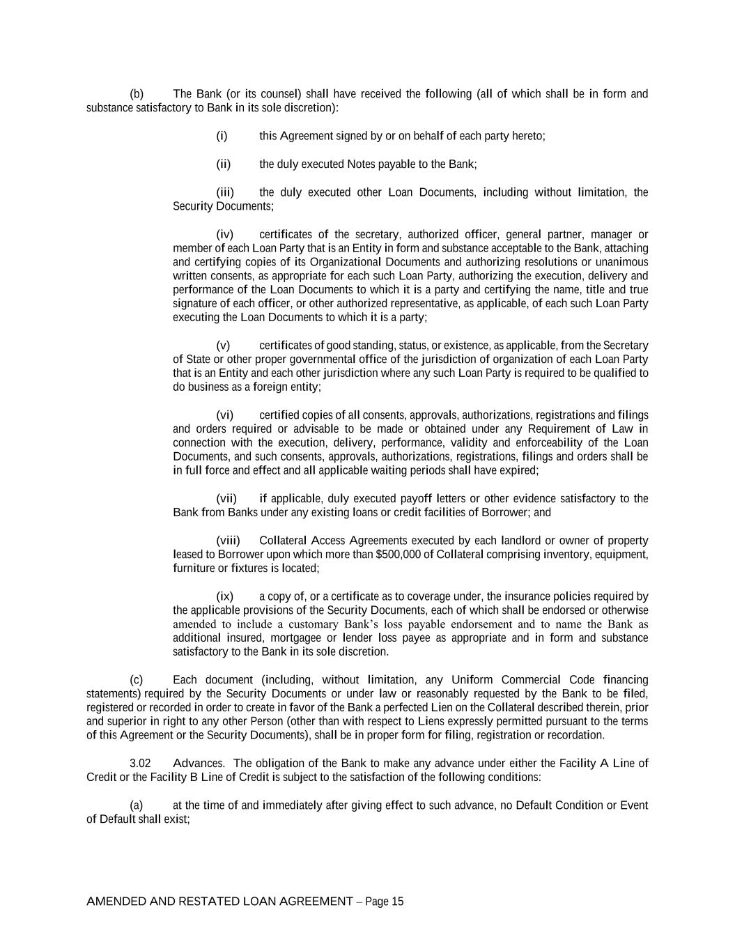 AMENDED AND RESTATED LOAN AGREEMENT – Page 15 (b) The Bank (or its counsel) shall have received the following (all of which shall be in form and substance satisfactory to Bank in its sole discretion): (i) this Agreement signed by or on behalf of each party hereto; (ii) the duly executed Notes payable to the Bank; (iii) the duly executed other Loan Documents, including without limitation, the Security Documents; (iv) certificates of the secretary, authorized officer, general partner, manager or member of each Loan Party that is an Entity in form and substance acceptable to the Bank, attaching and certifying copies of its Organizational Documents and authorizing resolutions or unanimous written consents, as appropriate for each such Loan Party, authorizing the execution, delivery and performance of the Loan Documents to which it is a party and certifying the name, title and true signature of each officer, or other authorized representative, as applicable, of each such Loan Party executing the Loan Documents to which it is a party; (v) certificates of good standing, status, or existence, as applicable, from the Secretary of State or other proper governmental office of the jurisdiction of organization of each Loan Party that is an Entity and each other jurisdiction where any such Loan Party is required to be qualified to do business as a foreign entity; (vi) certified copies of all consents, approvals, authorizations, registrations and filings and orders required or advisable to be made or obtained under any Requirement of Law in connection with the execution, delivery, performance, validity and enforceability of the Loan Documents, and such consents, approvals, authorizations, registrations, filings and orders shall be in full force and effect and all applicable waiting periods shall have expired; (vii) if applicable, duly executed payoff letters or other evidence satisfactory to the Bank from Banks under any existing loans or credit facilities of Borrower; and (viii) Collateral Access Agreements executed by each landlord or owner of property leased to Borrower upon which more than $500,000 of Collateral comprising inventory, equipment, furniture or fixtures is located; (ix) a copy of, or a certificate as to coverage under, the insurance policies required by the applicable provisions of the Security Documents, each of which shall be endorsed or otherwise amended to include a customary Bank’s loss payable endorsement and to name the Bank as additional insured, mortgagee or lender loss payee as appropriate and in form and substance satisfactory to the Bank in its sole discretion. (c) Each document (including, without limitation, any Uniform Commercial Code financing statements) required by the Security Documents or under law or reasonably requested by the Bank to be filed, registered or recorded in order to create in favor of the Bank a perfected Lien on the Collateral described therein, prior and superior in right to any other Person (other than with respect to Liens expressly permitted pursuant to the terms of this Agreement or the Security Documents), shall be in proper form for filing, registration or recordation. 3.02 Advances. The obligation of the Bank to make any advance under either the Facility A Line of Credit or the Facility B Line of Credit is subject to the satisfaction of the following conditions: (a) at the time of and immediately after giving effect to such advance, no Default Condition or Event of Default shall exist;