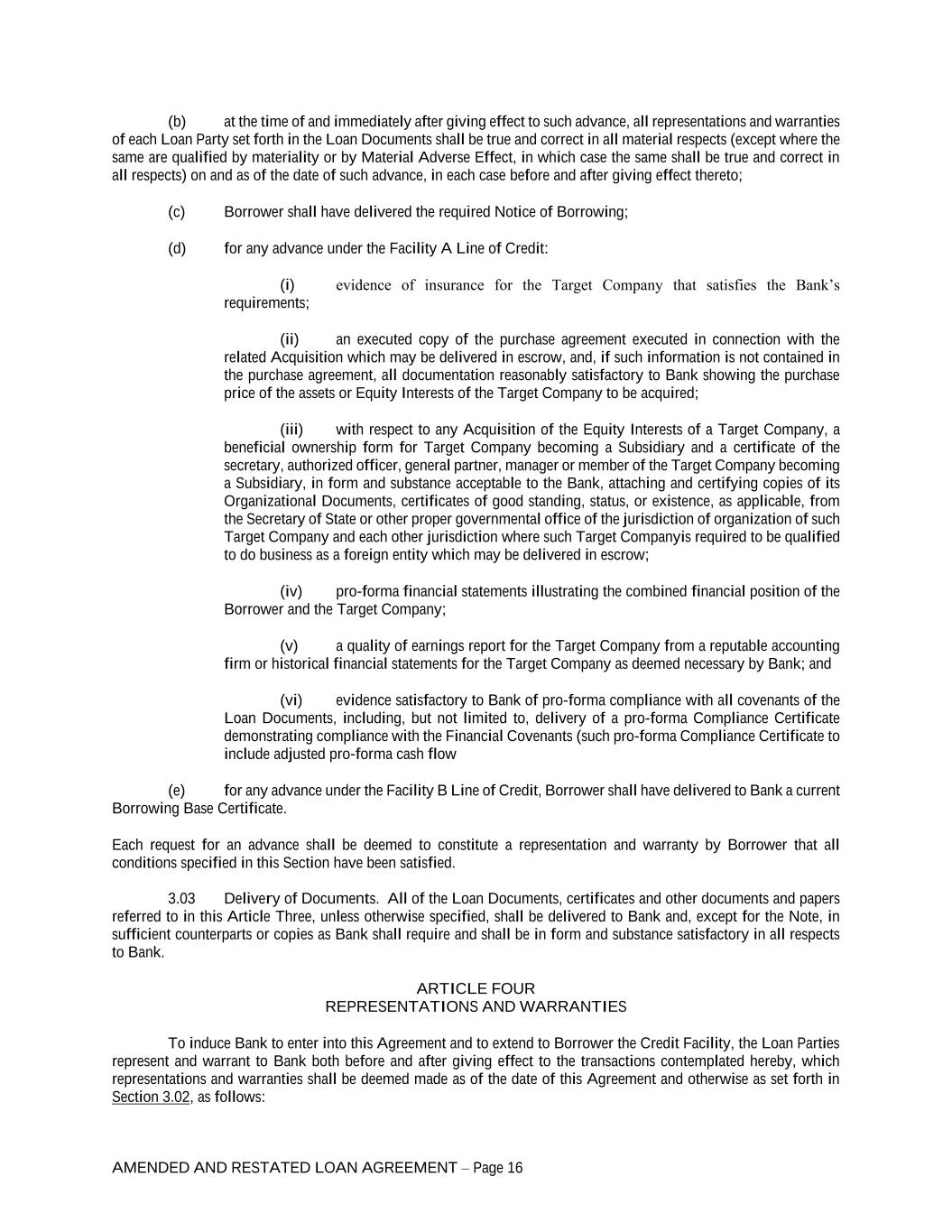 AMENDED AND RESTATED LOAN AGREEMENT – Page 16 (b) at the time of and immediately after giving effect to such advance, all representations and warranties of each Loan Party set forth in the Loan Documents shall be true and correct in all material respects (except where the same are qualified by materiality or by Material Adverse Effect, in which case the same shall be true and correct in all respects) on and as of the date of such advance, in each case before and after giving effect thereto; (c) Borrower shall have delivered the required Notice of Borrowing; (d) for any advance under the Facility A Line of Credit: (i) evidence of insurance for the Target Company that satisfies the Bank’s requirements; (ii) an executed copy of the purchase agreement executed in connection with the related Acquisition which may be delivered in escrow, and, if such information is not contained in the purchase agreement, all documentation reasonably satisfactory to Bank showing the purchase price of the assets or Equity Interests of the Target Company to be acquired; (iii) with respect to any Acquisition of the Equity Interests of a Target Company, a beneficial ownership form for Target Company becoming a Subsidiary and a certificate of the secretary, authorized officer, general partner, manager or member of the Target Company becoming a Subsidiary, in form and substance acceptable to the Bank, attaching and certifying copies of its Organizational Documents, certificates of good standing, status, or existence, as applicable, from the Secretary of State or other proper governmental office of the jurisdiction of organization of such Target Company and each other jurisdiction where such Target Companyis required to be qualified to do business as a foreign entity which may be delivered in escrow; (iv) pro-forma financial statements illustrating the combined financial position of the Borrower and the Target Company; (v) a quality of earnings report for the Target Company from a reputable accounting firm or historical financial statements for the Target Company as deemed necessary by Bank; and (vi) evidence satisfactory to Bank of pro-forma compliance with all covenants of the Loan Documents, including, but not limited to, delivery of a pro-forma Compliance Certificate demonstrating compliance with the Financial Covenants (such pro-forma Compliance Certificate to include adjusted pro-forma cash flow (e) for any advance under the Facility B Line of Credit, Borrower shall have delivered to Bank a current Borrowing Base Certificate. Each request for an advance shall be deemed to constitute a representation and warranty by Borrower that all conditions specified in this Section have been satisfied. 3.03 Delivery of Documents. All of the Loan Documents, certificates and other documents and papers referred to in this Article Three, unless otherwise specified, shall be delivered to Bank and, except for the Note, in sufficient counterparts or copies as Bank shall require and shall be in form and substance satisfactory in all respects to Bank. ARTICLE FOUR REPRESENTATIONS AND WARRANTIES To induce Bank to enter into this Agreement and to extend to Borrower the Credit Facility, the Loan Parties represent and warrant to Bank both before and after giving effect to the transactions contemplated hereby, which representations and warranties shall be deemed made as of the date of this Agreement and otherwise as set forth in Section 3.02, as follows: