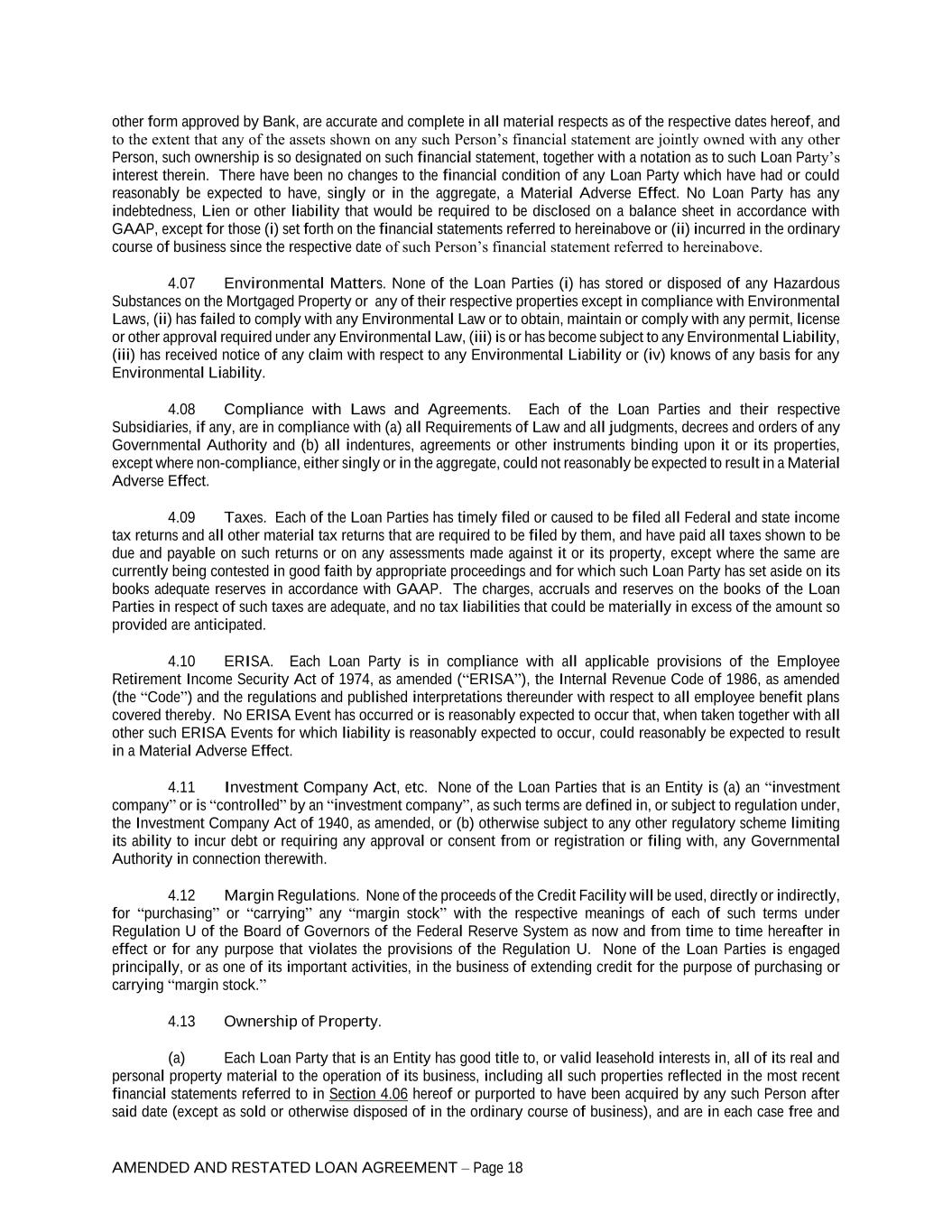 AMENDED AND RESTATED LOAN AGREEMENT – Page 18 other form approved by Bank, are accurate and complete in all material respects as of the respective dates hereof, and to the extent that any of the assets shown on any such Person’s financial statement are jointly owned with any other Person, such ownership is so designated on such financial statement, together with a notation as to such Loan Party’s interest therein. There have been no changes to the financial condition of any Loan Party which have had or could reasonably be expected to have, singly or in the aggregate, a Material Adverse Effect. No Loan Party has any indebtedness, Lien or other liability that would be required to be disclosed on a balance sheet in accordance with GAAP, except for those (i) set forth on the financial statements referred to hereinabove or (ii) incurred in the ordinary course of business since the respective date of such Person’s financial statement referred to hereinabove. 4.07 Environmental Matters. None of the Loan Parties (i) has stored or disposed of any Hazardous Substances on the Mortgaged Property or any of their respective properties except in compliance with Environmental Laws, (ii) has failed to comply with any Environmental Law or to obtain, maintain or comply with any permit, license or other approval required under any Environmental Law, (iii) is or has become subject to any Environmental Liability, (iii) has received notice of any claim with respect to any Environmental Liability or (iv) knows of any basis for any Environmental Liability. 4.08 Compliance with Laws and Agreements. Each of the Loan Parties and their respective Subsidiaries, if any, are in compliance with (a) all Requirements of Law and all judgments, decrees and orders of any Governmental Authority and (b) all indentures, agreements or other instruments binding upon it or its properties, except where non-compliance, either singly or in the aggregate, could not reasonably be expected to result in a Material Adverse Effect. 4.09 Taxes. Each of the Loan Parties has timely filed or caused to be filed all Federal and state income tax returns and all other material tax returns that are required to be filed by them, and have paid all taxes shown to be due and payable on such returns or on any assessments made against it or its property, except where the same are currently being contested in good faith by appropriate proceedings and for which such Loan Party has set aside on its books adequate reserves in accordance with GAAP. The charges, accruals and reserves on the books of the Loan Parties in respect of such taxes are adequate, and no tax liabilities that could be materially in excess of the amount so provided are anticipated. 4.10 ERISA. Each Loan Party is in compliance with all applicable provisions of the Employee Retirement Income Security Act of 1974, as amended (“ERISA”), the Internal Revenue Code of 1986, as amended (the “Code”) and the regulations and published interpretations thereunder with respect to all employee benefit plans covered thereby. No ERISA Event has occurred or is reasonably expected to occur that, when taken together with all other such ERISA Events for which liability is reasonably expected to occur, could reasonably be expected to result in a Material Adverse Effect. 4.11 Investment Company Act, etc. None of the Loan Parties that is an Entity is (a) an “investment company” or is “controlled” by an “investment company”, as such terms are defined in, or subject to regulation under, the Investment Company Act of 1940, as amended, or (b) otherwise subject to any other regulatory scheme limiting its ability to incur debt or requiring any approval or consent from or registration or filing with, any Governmental Authority in connection therewith. 4.12 Margin Regulations. None of the proceeds of the Credit Facility will be used, directly or indirectly, for “purchasing” or “carrying” any “margin stock” with the respective meanings of each of such terms under Regulation U of the Board of Governors of the Federal Reserve System as now and from time to time hereafter in effect or for any purpose that violates the provisions of the Regulation U. None of the Loan Parties is engaged principally, or as one of its important activities, in the business of extending credit for the purpose of purchasing or carrying “margin stock.” 4.13 Ownership of Property. (a) Each Loan Party that is an Entity has good title to, or valid leasehold interests in, all of its real and personal property material to the operation of its business, including all such properties reflected in the most recent financial statements referred to in Section 4.06 hereof or purported to have been acquired by any such Person after said date (except as sold or otherwise disposed of in the ordinary course of business), and are in each case free and