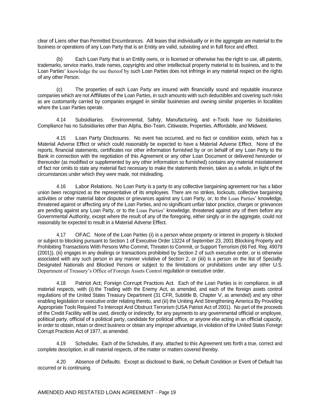AMENDED AND RESTATED LOAN AGREEMENT – Page 19 clear of Liens other than Permitted Encumbrances. All leases that individually or in the aggregate are material to the business or operations of any Loan Party that is an Entity are valid, subsisting and in full force and effect. (b) Each Loan Party that is an Entity owns, or is licensed or otherwise has the right to use, all patents, trademarks, service marks, trade names, copyrights and other intellectual property material to its business, and to the Loan Parties’ knowledge the use thereof by such Loan Parties does not infringe in any material respect on the rights of any other Person. (c) The properties of each Loan Party are insured with financially sound and reputable insurance companies which are not Affiliates of the Loan Parties, in such amounts with such deductibles and covering such risks as are customarily carried by companies engaged in similar businesses and owning similar properties in localities where the Loan Parties operate. 4.14 Subsidiaries. Environmental, Safety, Manufacturing, and e-Tools have no Subsidiaries. Compliance has no Subsidiaries other than Alpha, Bio-Team, Citiwaste, Properties, Affordable, and Midwest. 4.15 Loan Party Disclosures. No event has occurred, and no fact or condition exists, which has a Material Adverse Effect or which could reasonably be expected to have a Material Adverse Effect. None of the reports, financial statements, certificates nor other information furnished by or on behalf of any Loan Party to the Bank in connection with the negotiation of this Agreement or any other Loan Document or delivered hereunder or thereunder (as modified or supplemented by any other information so furnished) contains any material misstatement of fact nor omits to state any material fact necessary to make the statements therein, taken as a whole, in light of the circumstances under which they were made, not misleading. 4.16 Labor Relations. No Loan Party is a party to any collective bargaining agreement nor has a labor union been recognized as the representative of its employees. There are no strikes, lockouts, collective bargaining activities or other material labor disputes or grievances against any Loan Party, or, to the Loan Parties’ knowledge, threatened against or affecting any of the Loan Parties, and no significant unfair labor practice, charges or grievances are pending against any Loan Party, or to the Loan Parties’ knowledge, threatened against any of them before any Governmental Authority, except where the result of any of the foregoing, either singly or in the aggregate, could not reasonably be expected to result in a Material Adverse Effect. 4.17 OFAC. None of the Loan Parties (i) is a person whose property or interest in property is blocked or subject to blocking pursuant to Section 1 of Executive Order 13224 of September 23, 2001 Blocking Property and Prohibiting Transactions With Persons Who Commit, Threaten to Commit, or Support Terrorism (66 Fed. Reg. 49079 (2001)), (ii) engages in any dealings or transactions prohibited by Section 2 of such executive order, or is otherwise associated with any such person in any manner violative of Section 2, or (iii) is a person on the list of Specially Designated Nationals and Blocked Persons or subject to the limitations or prohibitions under any other U.S. Department of Treasury’s Office of Foreign Assets Control regulation or executive order. 4.18 Patriot Act; Foreign Corrupt Practices Act. Each of the Loan Parties is in compliance, in all material respects, with (i) the Trading with the Enemy Act, as amended, and each of the foreign assets control regulations of the United States Treasury Department (31 CFR, Subtitle B, Chapter V, as amended) and any other enabling legislation or executive order relating thereto, and (ii) the Uniting And Strengthening America By Providing Appropriate Tools Required To Intercept And Obstruct Terrorism (USA Patriot Act of 2001). No part of the proceeds of the Credit Facility will be used, directly or indirectly, for any payments to any governmental official or employee, political party, official of a political party, candidate for political office, or anyone else acting in an official capacity, in order to obtain, retain or direct business or obtain any improper advantage, in violation of the United States Foreign Corrupt Practices Act of 1977, as amended. 4.19 Schedules. Each of the Schedules, if any, attached to this Agreement sets forth a true, correct and complete description, in all material respects, of the matter or matters covered thereby. 4.20 Absence of Defaults. Except as disclosed to Bank, no Default Condition or Event of Default has occurred or is continuing.
