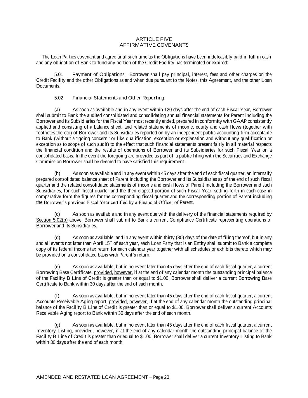 AMENDED AND RESTATED LOAN AGREEMENT – Page 20 ARTICLE FIVE AFFIRMATIVE COVENANTS The Loan Parties covenant and agree until such time as the Obligations have been indefeasibly paid in full in cash and any obligation of Bank to fund any portion of the Credit Facility has terminated or expired: 5.01 Payment of Obligations. Borrower shall pay principal, interest, fees and other charges on the Credit Facility and the other Obligations as and when due pursuant to the Notes, this Agreement, and the other Loan Documents. 5.02 Financial Statements and Other Reporting. (a) As soon as available and in any event within 120 days after the end of each Fiscal Year, Borrower shall submit to Bank the audited consolidated and consolidating annual financial statements for Parent including the Borrower and its Subsidiaries for the Fiscal Year most recently ended, prepared in conformity with GAAP consistently applied and consisting of a balance sheet, and related statements of income, equity and cash flows (together with footnotes thereto) of Borrower and its Subsidiaries reported on by an independent public accounting firm acceptable to Bank (without a “going concern” or like qualification, exception or explanation and without any qualification or exception as to scope of such audit) to the effect that such financial statements present fairly in all material respects the financial condition and the results of operations of Borrower and its Subsidiaries for such Fiscal Year on a consolidated basis. In the event the foregoing are provided as part of a public filing with the Securities and Exchange Commission Borrower shall be deemed to have satisfied this requirement. (b) As soon as available and in any event within 45 days after the end of each fiscal quarter, an internally prepared consolidated balance sheet of Parent including the Borrower and its Subsidiaries as of the end of such fiscal quarter and the related consolidated statements of income and cash flows of Parent including the Borrower and such Subsidiaries, for such fiscal quarter and the then elapsed portion of such Fiscal Year, setting forth in each case in comparative form the figures for the corresponding fiscal quarter and the corresponding portion of Parent including the Borrower’s previous Fiscal Year certified by a Financial Officer of Parent. (c) As soon as available and in any event due with the delivery of the financial statements required by Section 5.02(b) above, Borrower shall submit to Bank a current Compliance Certificate representing operations of Borrower and its Subsidiaries. (d) As soon as available, and in any event within thirty (30) days of the date of filing thereof, but in any and all events not later than April 15th of each year, each Loan Party that is an Entity shall submit to Bank a complete copy of its federal income tax return for each calendar year together with all schedules or exhibits thereto which may be provided on a consolidated basis with Parent’s return. (e) As soon as available, but in no event later than 45 days after the end of each fiscal quarter, a current Borrowing Base Certificate, provided, however, if at the end of any calendar month the outstanding principal balance of the Facility B Line of Credit is greater than or equal to $1.00, Borrower shall deliver a current Borrowing Base Certificate to Bank within 30 days after the end of each month. (f) As soon as available, but in no event later than 45 days after the end of each fiscal quarter, a current Accounts Receivable Aging report, provided, however, if at the end of any calendar month the outstanding principal balance of the Facility B Line of Credit is greater than or equal to $1.00, Borrower shall deliver a current Accounts Receivable Aging report to Bank within 30 days after the end of each month. (g) As soon as available, but in no event later than 45 days after the end of each fiscal quarter, a current Inventory Listing, provided, however, if at the end of any calendar month the outstanding principal balance of the Facility B Line of Credit is greater than or equal to $1.00, Borrower shall deliver a current Inventory Listing to Bank within 30 days after the end of each month.