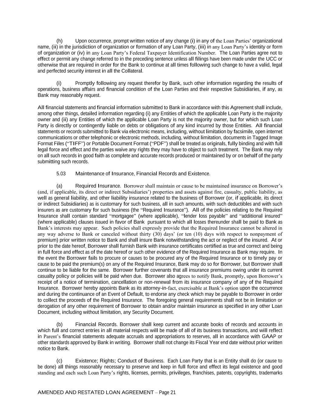 AMENDED AND RESTATED LOAN AGREEMENT – Page 21 (h) Upon occurrence, prompt written notice of any change (i) in any of the Loan Parties’ organizational name, (ii) in the jurisdiction of organization or formation of any Loan Party, (iii) in any Loan Party’s identity or form of organization or (iv) in any Loan Party’s Federal Taxpayer Identification Number. The Loan Parties agree not to effect or permit any change referred to in the preceding sentence unless all filings have been made under the UCC or otherwise that are required in order for the Bank to continue at all times following such change to have a valid, legal and perfected security interest in all the Collateral. (i) Promptly following any request therefor by Bank, such other information regarding the results of operations, business affairs and financial condition of the Loan Parties and their respective Subsidiaries, if any, as Bank may reasonably request. All financial statements and financial information submitted to Bank in accordance with this Agreement shall include, among other things, detailed information regarding (i) any Entities of which the applicable Loan Party is the majority owner and (ii) any Entities of which the applicable Loan Party is not the majority owner, but for which such Loan Party is directly or contingently liable on debts or obligations of any kind incurred by those Entities. All financial statements or records submitted to Bank via electronic means, including, without limitation by facsimile, open internet communications or other telephonic or electronic methods, including, without limitation, documents in Tagged Image Format Files (“TIFF”) or Portable Document Format (“PDF”) shall be treated as originals, fully binding and with full legal force and effect and the parties waive any rights they may have to object to such treatment. The Bank may rely on all such records in good faith as complete and accurate records produced or maintained by or on behalf of the party submitting such records. 5.03 Maintenance of Insurance, Financial Records and Existence. (a) Required Insurance. Borrower shall maintain or cause to be maintained insurance on Borrower’s (and, if applicable, its direct or indirect Subsidiaries’) properties and assets against fire, casualty, public liability, as well as general liability, and other liability insurance related to the business of Borrower (or, if applicable, its direct or indirect Subsidiaries) as is customary for such business, all in such amounts, with such deductibles and with such insurers as are customary for such business (the “Required Insurance”). All of the policies relating to the Required Insurance shall contain standard “mortgagee” (where applicable), “lender loss payable” and “additional insured” (where applicable) clauses issued in favor of Bank pursuant to which all losses thereunder shall be paid to Bank as Bank’s interests may appear. Such policies shall expressly provide that the Required Insurance cannot be altered in any way adverse to Bank or canceled without thirty (30) days’ (or ten (10) days with respect to nonpayment of premium) prior written notice to Bank and shall insure Bank notwithstanding the act or neglect of the insured. At or prior to the date hereof, Borrower shall furnish Bank with insurance certificates certified as true and correct and being in full force and effect as of the date hereof or such other evidence of the Required Insurance as Bank may require. In the event the Borrower fails to procure or causes to be procured any of the Required Insurance or to timely pay or cause to be paid the premium(s) on any of the Required Insurance, Bank may do so for Borrower, but Borrower shall continue to be liable for the same. Borrower further covenants that all insurance premiums owing under its current casualty policy or policies will be paid when due. Borrower also agrees to notify Bank, promptly, upon Borrower’s receipt of a notice of termination, cancellation or non-renewal from its insurance company of any of the Required Insurance. Borrower hereby appoints Bank as its attorney-in-fact, exercisable at Bank’s option upon the occurrence and during the continuance of an Event of Default, to endorse any check which may be payable to Borrower in order to collect the proceeds of the Required Insurance. The foregoing general requirements shall not be in limitation or derogation of any other requirement of Borrower to obtain and/or maintain insurance as specified in any other Loan Document, including without limitation, any Security Document. (b) Financial Records. Borrower shall keep current and accurate books of records and accounts in which full and correct entries in all material respects will be made of all of its business transactions, and will reflect in Parent’s financial statements adequate accruals and appropriations to reserves, all in accordance with GAAP or other standards approved by Bank in writing. Borrower shall not change its Fiscal Year end date without prior written notice to Bank. (c) Existence; Rights; Conduct of Business. Each Loan Party that is an Entity shall do (or cause to be done) all things reasonably necessary to preserve and keep in full force and effect its legal existence and good standing and each such Loan Party’s rights, licenses, permits, privileges, franchises, patents, copyrights, trademarks