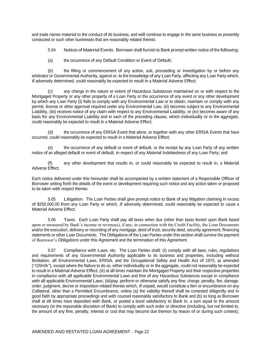 AMENDED AND RESTATED LOAN AGREEMENT – Page 22 and trade names material to the conduct of its business, and will continue to engage in the same business as presently conducted or such other businesses that are reasonably related thereto. 5.04 Notices of Material Events. Borrower shall furnish to Bank prompt written notice of the following: (a) the occurrence of any Default Condition or Event of Default; (b) the filing or commencement of any action, suit, proceeding or investigation by or before any arbitrator or Governmental Authority, against or, to the knowledge of any Loan Party, affecting any Loan Party which, if adversely determined, could reasonably be expected to result in a Material Adverse Effect; (c) any change in the nature or extent of Hazardous Substances maintained on or with respect to the Mortgaged Property or any other property of a Loan Party or the occurrence of any event or any other development by which any Loan Party (i) fails to comply with any Environmental Law or to obtain, maintain or comply with any permit, license or other approval required under any Environmental Law, (ii) becomes subject to any Environmental Liability, (iii) receives notice of any claim with respect to any Environmental Liability, or (iv) becomes aware of any basis for any Environmental Liability and in each of the preceding clauses, which individually or in the aggregate, could reasonably be expected to result in a Material Adverse Effect; (d) the occurrence of any ERISA Event that alone, or together with any other ERISA Events that have occurred, could reasonably be expected to result in a Material Adverse Effect; (e) the occurrence of any default or event of default, or the receipt by any Loan Party of any written notice of an alleged default or event of default, in respect of any Material Indebtedness of any Loan Party; and (f) any other development that results in, or could reasonably be expected to result in, a Material Adverse Effect. Each notice delivered under this hereunder shall be accompanied by a written statement of a Responsible Officer of Borrower setting forth the details of the event or development requiring such notice and any action taken or proposed to be taken with respect thereto. 5.05 Litigation. The Loan Parties shall give prompt notice to Bank of any litigation claiming in excess of $250,000.00 from any Loan Party or which, if adversely determined, could reasonably be expected to cause a Material Adverse Effect. 5.06 Taxes. Each Loan Party shall pay all taxes when due (other than taxes levied upon Bank based upon or measured by Bank’s income or revenues), if any, in connection with the Credit Facility, the Loan Documents and/or the execution, delivery or recording of any mortgage, deed of trust, security deed, security agreement, financing statements or other Loan Documents. The Obligations of the Loan Parties under this section shall survive the payment of Borrower’s Obligations under this Agreement and the termination of this Agreement. 5.07 Compliance with Laws, etc. The Loan Parties shall: (i) comply with all laws, rules, regulations and requirements of any Governmental Authority applicable to its business and properties, including without limitation, all Environmental Laws, ERISA, and the Occupational Safety and Health Act of 1970, as amended (“OSHA”), except where the failure to do so, either individually or in the aggregate, could not reasonably be expected to result in a Material Adverse Effect; (ii) at all times maintain the Mortgaged Property and their respective properties in compliance with all applicable Environmental Laws and free of any Hazardous Substances except in compliance with all applicable Environmental Laws; (iii)pay, perform or otherwise satisfy any fine, charge, penalty, fee, damage, order, judgment, decree or imposition related thereto which, if unpaid, would constitute a lien or encumbrance on any Collateral, other than a Permitted Encumbrance, unless (a) the validity thereof shall be contested diligently and in good faith by appropriate proceedings and with counsel reasonably satisfactory to Bank and (b) so long as Borrower shall at all times have deposited with Bank, or posted a bond satisfactory to Bank in, a sum equal to the amount necessary (in the reasonable discretion of Bank) to comply with such order or directive (including, but not limited to, the amount of any fine, penalty, interest or cost that may become due thereon by reason of or during such contest);