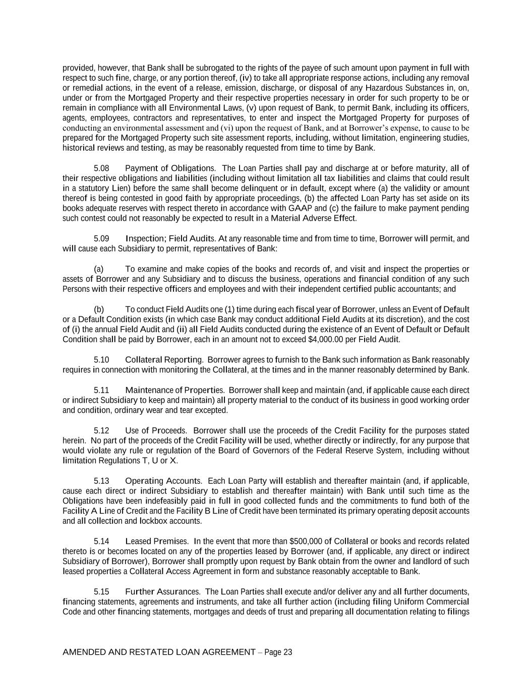 AMENDED AND RESTATED LOAN AGREEMENT – Page 23 provided, however, that Bank shall be subrogated to the rights of the payee of such amount upon payment in full with respect to such fine, charge, or any portion thereof, (iv) to take all appropriate response actions, including any removal or remedial actions, in the event of a release, emission, discharge, or disposal of any Hazardous Substances in, on, under or from the Mortgaged Property and their respective properties necessary in order for such property to be or remain in compliance with all Environmental Laws, (v) upon request of Bank, to permit Bank, including its officers, agents, employees, contractors and representatives, to enter and inspect the Mortgaged Property for purposes of conducting an environmental assessment and (vi) upon the request of Bank, and at Borrower’s expense, to cause to be prepared for the Mortgaged Property such site assessment reports, including, without limitation, engineering studies, historical reviews and testing, as may be reasonably requested from time to time by Bank. 5.08 Payment of Obligations. The Loan Parties shall pay and discharge at or before maturity, all of their respective obligations and liabilities (including without limitation all tax liabilities and claims that could result in a statutory Lien) before the same shall become delinquent or in default, except where (a) the validity or amount thereof is being contested in good faith by appropriate proceedings, (b) the affected Loan Party has set aside on its books adequate reserves with respect thereto in accordance with GAAP and (c) the failure to make payment pending such contest could not reasonably be expected to result in a Material Adverse Effect. 5.09 Inspection; Field Audits. At any reasonable time and from time to time, Borrower will permit, and will cause each Subsidiary to permit, representatives of Bank: (a) To examine and make copies of the books and records of, and visit and inspect the properties or assets of Borrower and any Subsidiary and to discuss the business, operations and financial condition of any such Persons with their respective officers and employees and with their independent certified public accountants; and (b) To conduct Field Audits one (1) time during each fiscal year of Borrower, unless an Event of Default or a Default Condition exists (in which case Bank may conduct additional Field Audits at its discretion), and the cost of (i) the annual Field Audit and (ii) all Field Audits conducted during the existence of an Event of Default or Default Condition shall be paid by Borrower, each in an amount not to exceed $4,000.00 per Field Audit. 5.10 Collateral Reporting. Borrower agrees to furnish to the Bank such information as Bank reasonably requires in connection with monitoring the Collateral, at the times and in the manner reasonably determined by Bank. 5.11 Maintenance of Properties. Borrower shall keep and maintain (and, if applicable cause each direct or indirect Subsidiary to keep and maintain) all property material to the conduct of its business in good working order and condition, ordinary wear and tear excepted. 5.12 Use of Proceeds. Borrower shall use the proceeds of the Credit Facility for the purposes stated herein. No part of the proceeds of the Credit Facility will be used, whether directly or indirectly, for any purpose that would violate any rule or regulation of the Board of Governors of the Federal Reserve System, including without limitation Regulations T, U or X. 5.13 Operating Accounts. Each Loan Party will establish and thereafter maintain (and, if applicable, cause each direct or indirect Subsidiary to establish and thereafter maintain) with Bank until such time as the Obligations have been indefeasibly paid in full in good collected funds and the commitments to fund both of the Facility A Line of Credit and the Facility B Line of Credit have been terminated its primary operating deposit accounts and all collection and lockbox accounts. 5.14 Leased Premises. In the event that more than $500,000 of Collateral or books and records related thereto is or becomes located on any of the properties leased by Borrower (and, if applicable, any direct or indirect Subsidiary of Borrower), Borrower shall promptly upon request by Bank obtain from the owner and landlord of such leased properties a Collateral Access Agreement in form and substance reasonably acceptable to Bank. 5.15 Further Assurances. The Loan Parties shall execute and/or deliver any and all further documents, financing statements, agreements and instruments, and take all further action (including filing Uniform Commercial Code and other financing statements, mortgages and deeds of trust and preparing all documentation relating to filings