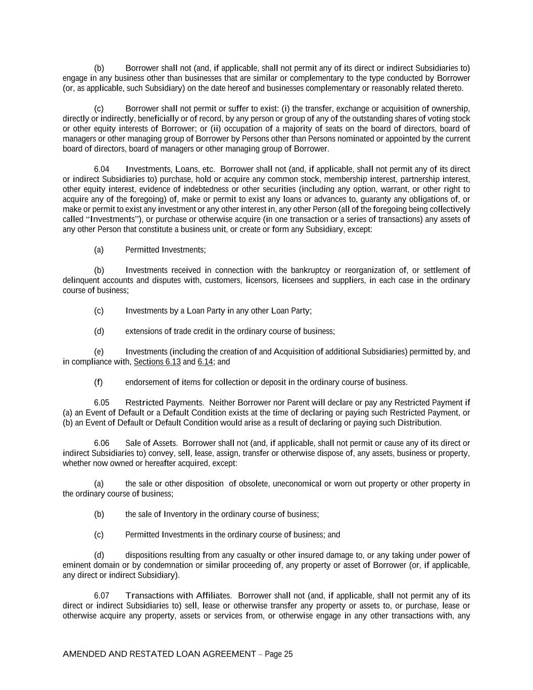 AMENDED AND RESTATED LOAN AGREEMENT – Page 25 (b) Borrower shall not (and, if applicable, shall not permit any of its direct or indirect Subsidiaries to) engage in any business other than businesses that are similar or complementary to the type conducted by Borrower (or, as applicable, such Subsidiary) on the date hereof and businesses complementary or reasonably related thereto. (c) Borrower shall not permit or suffer to exist: (i) the transfer, exchange or acquisition of ownership, directly or indirectly, beneficially or of record, by any person or group of any of the outstanding shares of voting stock or other equity interests of Borrower; or (ii) occupation of a majority of seats on the board of directors, board of managers or other managing group of Borrower by Persons other than Persons nominated or appointed by the current board of directors, board of managers or other managing group of Borrower. 6.04 Investments, Loans, etc. Borrower shall not (and, if applicable, shall not permit any of its direct or indirect Subsidiaries to) purchase, hold or acquire any common stock, membership interest, partnership interest, other equity interest, evidence of indebtedness or other securities (including any option, warrant, or other right to acquire any of the foregoing) of, make or permit to exist any loans or advances to, guaranty any obligations of, or make or permit to exist any investment or any other interest in, any other Person (all of the foregoing being collectively called “Investments”), or purchase or otherwise acquire (in one transaction or a series of transactions) any assets of any other Person that constitute a business unit, or create or form any Subsidiary, except: (a) Permitted Investments; (b) Investments received in connection with the bankruptcy or reorganization of, or settlement of delinquent accounts and disputes with, customers, licensors, licensees and suppliers, in each case in the ordinary course of business; (c) Investments by a Loan Party in any other Loan Party; (d) extensions of trade credit in the ordinary course of business; (e) Investments (including the creation of and Acquisition of additional Subsidiaries) permitted by, and in compliance with, Sections 6.13 and 6.14; and (f) endorsement of items for collection or deposit in the ordinary course of business. 6.05 Restricted Payments. Neither Borrower nor Parent will declare or pay any Restricted Payment if (a) an Event of Default or a Default Condition exists at the time of declaring or paying such Restricted Payment, or (b) an Event of Default or Default Condition would arise as a result of declaring or paying such Distribution. 6.06 Sale of Assets. Borrower shall not (and, if applicable, shall not permit or cause any of its direct or indirect Subsidiaries to) convey, sell, lease, assign, transfer or otherwise dispose of, any assets, business or property, whether now owned or hereafter acquired, except: (a) the sale or other disposition of obsolete, uneconomical or worn out property or other property in the ordinary course of business; (b) the sale of Inventory in the ordinary course of business; (c) Permitted Investments in the ordinary course of business; and (d) dispositions resulting from any casualty or other insured damage to, or any taking under power of eminent domain or by condemnation or similar proceeding of, any property or asset of Borrower (or, if applicable, any direct or indirect Subsidiary). 6.07 Transactions with Affiliates. Borrower shall not (and, if applicable, shall not permit any of its direct or indirect Subsidiaries to) sell, lease or otherwise transfer any property or assets to, or purchase, lease or otherwise acquire any property, assets or services from, or otherwise engage in any other transactions with, any