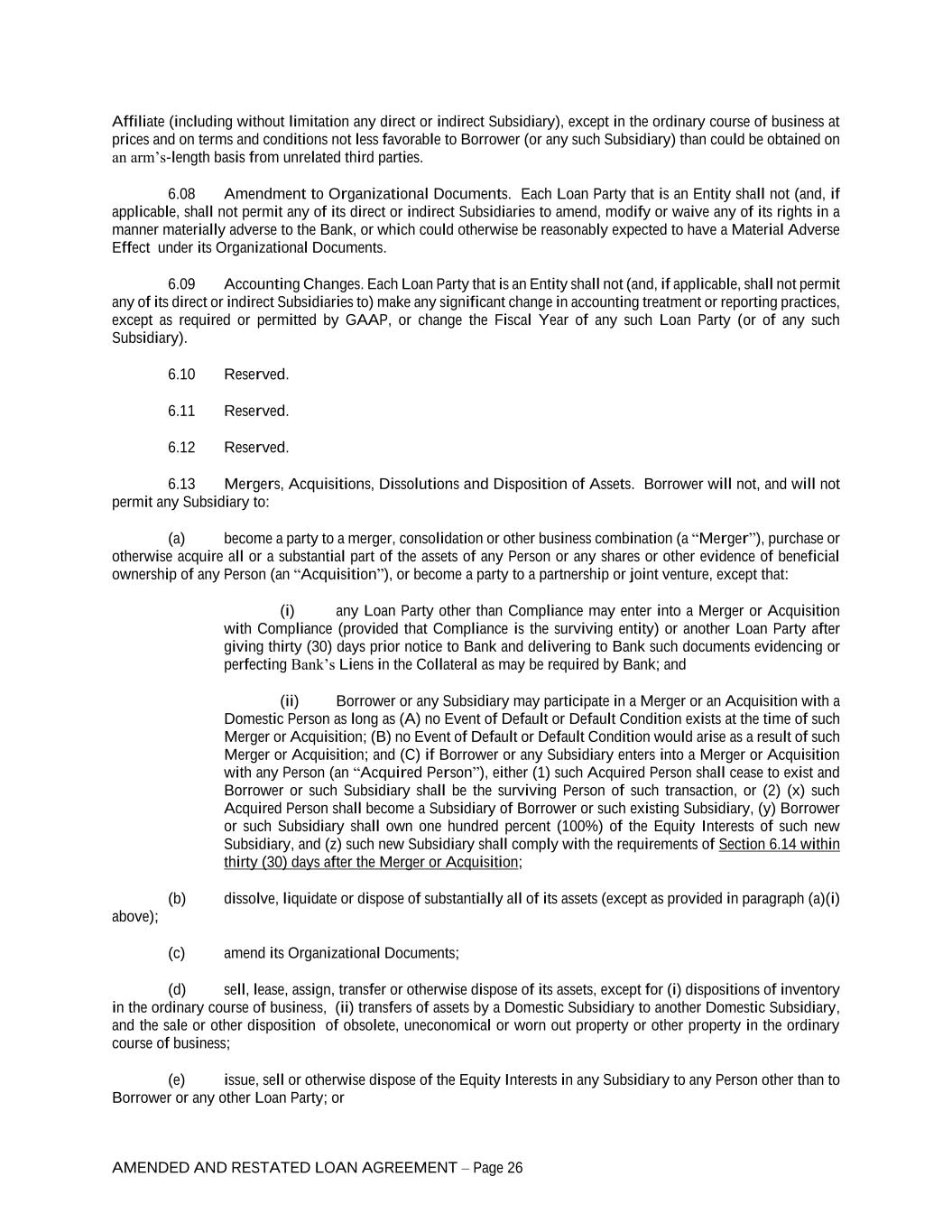 AMENDED AND RESTATED LOAN AGREEMENT – Page 26 Affiliate (including without limitation any direct or indirect Subsidiary), except in the ordinary course of business at prices and on terms and conditions not less favorable to Borrower (or any such Subsidiary) than could be obtained on an arm’s-length basis from unrelated third parties. 6.08 Amendment to Organizational Documents. Each Loan Party that is an Entity shall not (and, if applicable, shall not permit any of its direct or indirect Subsidiaries to amend, modify or waive any of its rights in a manner materially adverse to the Bank, or which could otherwise be reasonably expected to have a Material Adverse Effect under its Organizational Documents. 6.09 Accounting Changes. Each Loan Party that is an Entity shall not (and, if applicable, shall not permit any of its direct or indirect Subsidiaries to) make any significant change in accounting treatment or reporting practices, except as required or permitted by GAAP, or change the Fiscal Year of any such Loan Party (or of any such Subsidiary). 6.10 Reserved. 6.11 Reserved. 6.12 Reserved. 6.13 Mergers, Acquisitions, Dissolutions and Disposition of Assets. Borrower will not, and will not permit any Subsidiary to: (a) become a party to a merger, consolidation or other business combination (a “Merger”), purchase or otherwise acquire all or a substantial part of the assets of any Person or any shares or other evidence of beneficial ownership of any Person (an “Acquisition”), or become a party to a partnership or joint venture, except that: (i) any Loan Party other than Compliance may enter into a Merger or Acquisition with Compliance (provided that Compliance is the surviving entity) or another Loan Party after giving thirty (30) days prior notice to Bank and delivering to Bank such documents evidencing or perfecting Bank’s Liens in the Collateral as may be required by Bank; and (ii) Borrower or any Subsidiary may participate in a Merger or an Acquisition with a Domestic Person as long as (A) no Event of Default or Default Condition exists at the time of such Merger or Acquisition; (B) no Event of Default or Default Condition would arise as a result of such Merger or Acquisition; and (C) if Borrower or any Subsidiary enters into a Merger or Acquisition with any Person (an “Acquired Person”), either (1) such Acquired Person shall cease to exist and Borrower or such Subsidiary shall be the surviving Person of such transaction, or (2) (x) such Acquired Person shall become a Subsidiary of Borrower or such existing Subsidiary, (y) Borrower or such Subsidiary shall own one hundred percent (100%) of the Equity Interests of such new Subsidiary, and (z) such new Subsidiary shall comply with the requirements of Section 6.14 within thirty (30) days after the Merger or Acquisition; (b) dissolve, liquidate or dispose of substantially all of its assets (except as provided in paragraph (a)(i) above); (c) amend its Organizational Documents; (d) sell, lease, assign, transfer or otherwise dispose of its assets, except for (i) dispositions of inventory in the ordinary course of business, (ii) transfers of assets by a Domestic Subsidiary to another Domestic Subsidiary, and the sale or other disposition of obsolete, uneconomical or worn out property or other property in the ordinary course of business; (e) issue, sell or otherwise dispose of the Equity Interests in any Subsidiary to any Person other than to Borrower or any other Loan Party; or