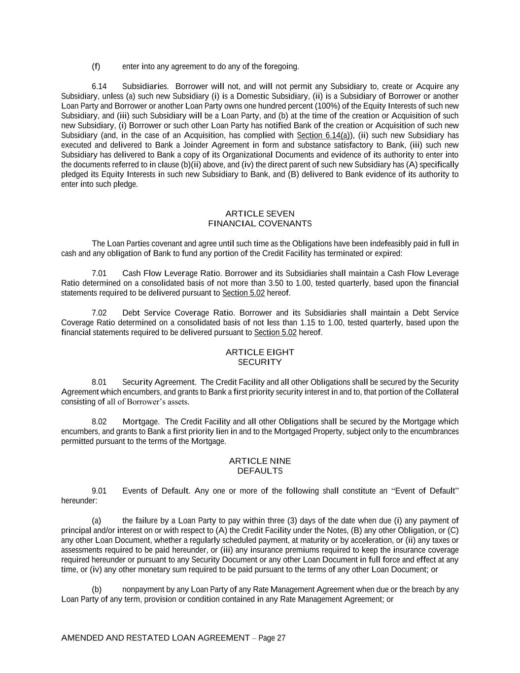 AMENDED AND RESTATED LOAN AGREEMENT – Page 27 (f) enter into any agreement to do any of the foregoing. 6.14 Subsidiaries. Borrower will not, and will not permit any Subsidiary to, create or Acquire any Subsidiary, unless (a) such new Subsidiary (i) is a Domestic Subsidiary, (ii) is a Subsidiary of Borrower or another Loan Party and Borrower or another Loan Party owns one hundred percent (100%) of the Equity Interests of such new Subsidiary, and (iii) such Subsidiary will be a Loan Party, and (b) at the time of the creation or Acquisition of such new Subsidiary, (i) Borrower or such other Loan Party has notified Bank of the creation or Acquisition of such new Subsidiary (and, in the case of an Acquisition, has complied with Section 6.14(a)), (ii) such new Subsidiary has executed and delivered to Bank a Joinder Agreement in form and substance satisfactory to Bank, (iii) such new Subsidiary has delivered to Bank a copy of its Organizational Documents and evidence of its authority to enter into the documents referred to in clause (b)(ii) above, and (iv) the direct parent of such new Subsidiary has (A) specifically pledged its Equity Interests in such new Subsidiary to Bank, and (B) delivered to Bank evidence of its authority to enter into such pledge. ARTICLE SEVEN FINANCIAL COVENANTS The Loan Parties covenant and agree until such time as the Obligations have been indefeasibly paid in full in cash and any obligation of Bank to fund any portion of the Credit Facility has terminated or expired: 7.01 Cash Flow Leverage Ratio. Borrower and its Subsidiaries shall maintain a Cash Flow Leverage Ratio determined on a consolidated basis of not more than 3.50 to 1.00, tested quarterly, based upon the financial statements required to be delivered pursuant to Section 5.02 hereof. 7.02 Debt Service Coverage Ratio. Borrower and its Subsidiaries shall maintain a Debt Service Coverage Ratio determined on a consolidated basis of not less than 1.15 to 1.00, tested quarterly, based upon the financial statements required to be delivered pursuant to Section 5.02 hereof. ARTICLE EIGHT SECURITY 8.01 Security Agreement. The Credit Facility and all other Obligations shall be secured by the Security Agreement which encumbers, and grants to Bank a first priority security interest in and to, that portion of the Collateral consisting of all of Borrower’s assets. 8.02 Mortgage. The Credit Facility and all other Obligations shall be secured by the Mortgage which encumbers, and grants to Bank a first priority lien in and to the Mortgaged Property, subject only to the encumbrances permitted pursuant to the terms of the Mortgage. ARTICLE NINE DEFAULTS 9.01 Events of Default. Any one or more of the following shall constitute an “Event of Default” hereunder: (a) the failure by a Loan Party to pay within three (3) days of the date when due (i) any payment of principal and/or interest on or with respect to (A) the Credit Facility under the Notes, (B) any other Obligation, or (C) any other Loan Document, whether a regularly scheduled payment, at maturity or by acceleration, or (ii) any taxes or assessments required to be paid hereunder, or (iii) any insurance premiums required to keep the insurance coverage required hereunder or pursuant to any Security Document or any other Loan Document in full force and effect at any time, or (iv) any other monetary sum required to be paid pursuant to the terms of any other Loan Document; or (b) nonpayment by any Loan Party of any Rate Management Agreement when due or the breach by any Loan Party of any term, provision or condition contained in any Rate Management Agreement; or