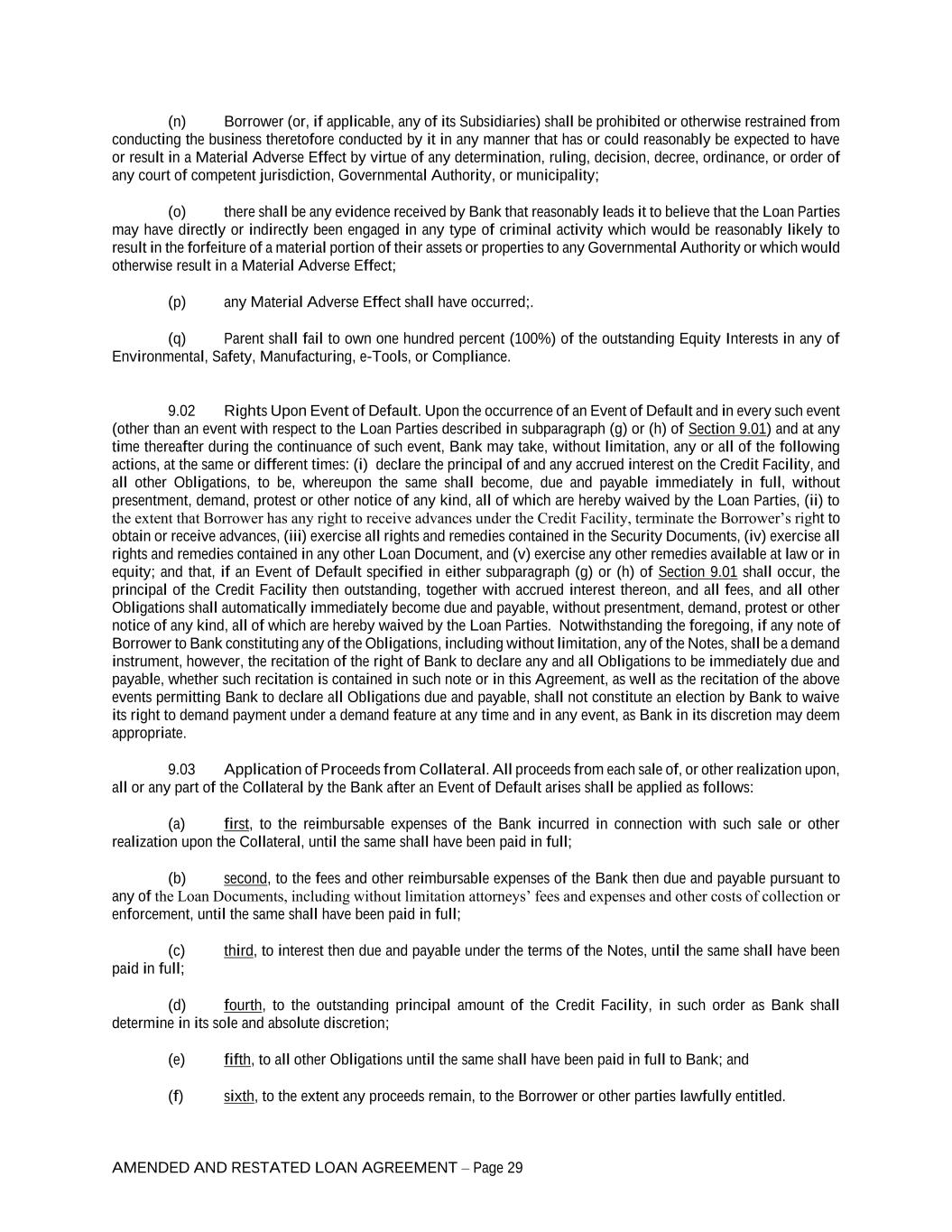 AMENDED AND RESTATED LOAN AGREEMENT – Page 29 (n) Borrower (or, if applicable, any of its Subsidiaries) shall be prohibited or otherwise restrained from conducting the business theretofore conducted by it in any manner that has or could reasonably be expected to have or result in a Material Adverse Effect by virtue of any determination, ruling, decision, decree, ordinance, or order of any court of competent jurisdiction, Governmental Authority, or municipality; (o) there shall be any evidence received by Bank that reasonably leads it to believe that the Loan Parties may have directly or indirectly been engaged in any type of criminal activity which would be reasonably likely to result in the forfeiture of a material portion of their assets or properties to any Governmental Authority or which would otherwise result in a Material Adverse Effect; (p) any Material Adverse Effect shall have occurred;. (q) Parent shall fail to own one hundred percent (100%) of the outstanding Equity Interests in any of Environmental, Safety, Manufacturing, e-Tools, or Compliance. 9.02 Rights Upon Event of Default. Upon the occurrence of an Event of Default and in every such event (other than an event with respect to the Loan Parties described in subparagraph (g) or (h) of Section 9.01) and at any time thereafter during the continuance of such event, Bank may take, without limitation, any or all of the following actions, at the same or different times: (i) declare the principal of and any accrued interest on the Credit Facility, and all other Obligations, to be, whereupon the same shall become, due and payable immediately in full, without presentment, demand, protest or other notice of any kind, all of which are hereby waived by the Loan Parties, (ii) to the extent that Borrower has any right to receive advances under the Credit Facility, terminate the Borrower’s right to obtain or receive advances, (iii) exercise all rights and remedies contained in the Security Documents, (iv) exercise all rights and remedies contained in any other Loan Document, and (v) exercise any other remedies available at law or in equity; and that, if an Event of Default specified in either subparagraph (g) or (h) of Section 9.01 shall occur, the principal of the Credit Facility then outstanding, together with accrued interest thereon, and all fees, and all other Obligations shall automatically immediately become due and payable, without presentment, demand, protest or other notice of any kind, all of which are hereby waived by the Loan Parties. Notwithstanding the foregoing, if any note of Borrower to Bank constituting any of the Obligations, including without limitation, any of the Notes, shall be a demand instrument, however, the recitation of the right of Bank to declare any and all Obligations to be immediately due and payable, whether such recitation is contained in such note or in this Agreement, as well as the recitation of the above events permitting Bank to declare all Obligations due and payable, shall not constitute an election by Bank to waive its right to demand payment under a demand feature at any time and in any event, as Bank in its discretion may deem appropriate. 9.03 Application of Proceeds from Collateral. All proceeds from each sale of, or other realization upon, all or any part of the Collateral by the Bank after an Event of Default arises shall be applied as follows: (a) first, to the reimbursable expenses of the Bank incurred in connection with such sale or other realization upon the Collateral, until the same shall have been paid in full; (b) second, to the fees and other reimbursable expenses of the Bank then due and payable pursuant to any of the Loan Documents, including without limitation attorneys’ fees and expenses and other costs of collection or enforcement, until the same shall have been paid in full; (c) third, to interest then due and payable under the terms of the Notes, until the same shall have been paid in full; (d) fourth, to the outstanding principal amount of the Credit Facility, in such order as Bank shall determine in its sole and absolute discretion; (e) fifth, to all other Obligations until the same shall have been paid in full to Bank; and (f) sixth, to the extent any proceeds remain, to the Borrower or other parties lawfully entitled.