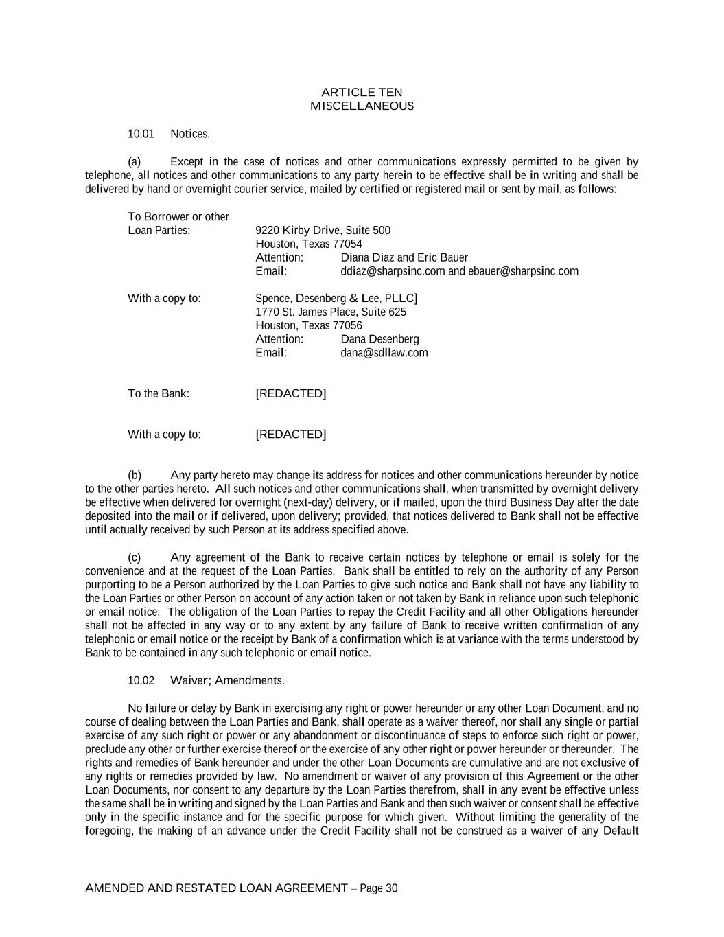 AMENDED AND RESTATED LOAN AGREEMENT – Page 30 ARTICLE TEN MISCELLANEOUS 10.01 Notices. (a) Except in the case of notices and other communications expressly permitted to be given by telephone, all notices and other communications to any party herein to be effective shall be in writing and shall be delivered by hand or overnight courier service, mailed by certified or registered mail or sent by mail, as follows: To Borrower or other Loan Parties: 9220 Kirby Drive, Suite 500 Houston, Texas 77054 Attention: Diana Diaz and Eric Bauer Email: ddiaz@sharpsinc.com and ebauer@sharpsinc.com With a copy to: Spence, Desenberg & Lee, PLLC] 1770 St. James Place, Suite 625 Houston, Texas 77056 Attention: Dana Desenberg Email: dana@sdllaw.com To the Bank: [REDACTED] With a copy to: [REDACTED] (b) Any party hereto may change its address for notices and other communications hereunder by notice to the other parties hereto. All such notices and other communications shall, when transmitted by overnight delivery be effective when delivered for overnight (next-day) delivery, or if mailed, upon the third Business Day after the date deposited into the mail or if delivered, upon delivery; provided, that notices delivered to Bank shall not be effective until actually received by such Person at its address specified above. (c) Any agreement of the Bank to receive certain notices by telephone or email is solely for the convenience and at the request of the Loan Parties. Bank shall be entitled to rely on the authority of any Person purporting to be a Person authorized by the Loan Parties to give such notice and Bank shall not have any liability to the Loan Parties or other Person on account of any action taken or not taken by Bank in reliance upon such telephonic or email notice. The obligation of the Loan Parties to repay the Credit Facility and all other Obligations hereunder shall not be affected in any way or to any extent by any failure of Bank to receive written confirmation of any telephonic or email notice or the receipt by Bank of a confirmation which is at variance with the terms understood by Bank to be contained in any such telephonic or email notice. 10.02 Waiver; Amendments. No failure or delay by Bank in exercising any right or power hereunder or any other Loan Document, and no course of dealing between the Loan Parties and Bank, shall operate as a waiver thereof, nor shall any single or partial exercise of any such right or power or any abandonment or discontinuance of steps to enforce such right or power, preclude any other or further exercise thereof or the exercise of any other right or power hereunder or thereunder. The rights and remedies of Bank hereunder and under the other Loan Documents are cumulative and are not exclusive of any rights or remedies provided by law. No amendment or waiver of any provision of this Agreement or the other Loan Documents, nor consent to any departure by the Loan Parties therefrom, shall in any event be effective unless the same shall be in writing and signed by the Loan Parties and Bank and then such waiver or consent shall be effective only in the specific instance and for the specific purpose for which given. Without limiting the generality of the foregoing, the making of an advance under the Credit Facility shall not be construed as a waiver of any Default