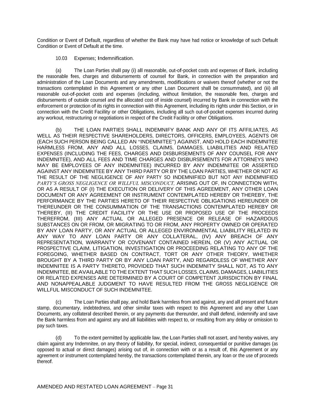 AMENDED AND RESTATED LOAN AGREEMENT – Page 31 Condition or Event of Default, regardless of whether the Bank may have had notice or knowledge of such Default Condition or Event of Default at the time. 10.03 Expenses; Indemnification. (a) The Loan Parties shall pay (i) all reasonable, out-of-pocket costs and expenses of Bank, including the reasonable fees, charges and disbursements of counsel for Bank, in connection with the preparation and administration of the Loan Documents and any amendments, modifications or waivers thereof (whether or not the transactions contemplated in this Agreement or any other Loan Document shall be consummated), and (ii) all reasonable out-of-pocket costs and expenses (including, without limitation, the reasonable fees, charges and disbursements of outside counsel and the allocated cost of inside counsel) incurred by Bank in connection with the enforcement or protection of its rights in connection with this Agreement, including its rights under this Section, or in connection with the Credit Facility or other Obligations, including all such out-of-pocket expenses incurred during any workout, restructuring or negotiations in respect of the Credit Facility or other Obligations. (b) THE LOAN PARTIES SHALL INDEMNIFY BANK AND ANY OF ITS AFFILIATES, AS WELL AS THEIR RESPECTIVE SHAREHOLDERS, DIRECTORS, OFFICERS, EMPLOYEES, AGENTS OR (EACH SUCH PERSON BEING CALLED AN “INDEMNITEE”) AGAINST, AND HOLD EACH INDEMNITEE HARMLESS FROM, ANY AND ALL LOSSES, CLAIMS, DAMAGES, LIABILITIES AND RELATED EXPENSES (INCLUDING THE FEES, CHARGES AND DISBURSEMENTS OF ANY COUNSEL FOR ANY INDEMNITEE), AND ALL FEES AND TIME CHARGES AND DISBURSEMENTS FOR ATTORNEYS WHO MAY BE EMPLOYEES OF ANY INDEMNITEE) INCURRED BY ANY INDEMNITEE OR ASSERTED AGAINST ANY INDEMNITEE BY ANY THIRD PARTY OR BY THE LOAN PARTIES, WHETHER OR NOT AS THE RESULT OF THE NEGLIGENCE OF ANY PARTY SO INDEMNIFIED BUT NOT ANY INDEMNIFIED PARTY’S GROSS NEGLIGENCE OR WILLFUL MISCONDUCT, ARISING OUT OF, IN CONNECTION WITH, OR AS A RESULT OF (I) THE EXECUTION OR DELIVERY OF THIS AGREEMENT, ANY OTHER LOAN DOCUMENT OR ANY AGREEMENT OR INSTRUMENT CONTEMPLATED HEREBY OR THEREBY, THE PERFORMANCE BY THE PARTIES HERETO OF THEIR RESPECTIVE OBLIGATIONS HEREUNDER OR THEREUNDER OR THE CONSUMMATION OF THE TRANSACTIONS CONTEMPLATED HEREBY OR THEREBY, (II) THE CREDIT FACILITY OR THE USE OR PROPOSED USE OF THE PROCEEDS THEREFROM, (III) ANY ACTUAL OR ALLEGED PRESENCE OR RELEASE OF HAZARDOUS SUBSTANCES ON OR FROM, OR MIGRATING TO OR FROM, ANY PROPERTY OWNED OR OPERATED BY ANY LOAN PARTY, OR ANY ACTUAL OR ALLEGED ENVIRONMENTAL LIABILITY RELATED IN ANY WAY TO ANY LOAN PARTY OR ANY COLLATERAL, (IV) ANY BREACH OF ANY REPRESENTATION, WARRANTY OR COVENANT CONTAINED HEREIN, OR (V) ANY ACTUAL OR PROSPECTIVE CLAIM, LITIGATION, INVESTIGATION OR PROCEEDING RELATING TO ANY OF THE FOREGOING, WHETHER BASED ON CONTRACT, TORT OR ANY OTHER THEORY, WHETHER BROUGHT BY A THIRD PARTY OR BY ANY LOAN PARTY, AND REGARDLESS OF WHETHER ANY INDEMNITEE IS A PARTY THERETO, PROVIDED THAT SUCH INDEMNITY SHALL NOT, AS TO ANY INDEMNITEE, BE AVAILABLE TO THE EXTENT THAT SUCH LOSSES, CLAIMS, DAMAGES, LIABILITIES OR RELATED EXPENSES ARE DETERMINED BY A COURT OF COMPETENT JURISDICTION BY FINAL AND NONAPPEALABLE JUDGMENT TO HAVE RESULTED FROM THE GROSS NEGLIGENCE OR WILLFUL MISCONDUCT OF SUCH INDEMNITEE. (c) The Loan Parties shall pay, and hold Bank harmless from and against, any and all present and future stamp, documentary, indebtedness, and other similar taxes with respect to this Agreement and any other Loan Documents, any collateral described therein, or any payments due thereunder, and shall defend, indemnify and save the Bank harmless from and against any and all liabilities with respect to, or resulting from any delay or omission to pay such taxes. (d) To the extent permitted by applicable law, the Loan Parties shall not assert, and hereby waives, any claim against any Indemnitee, on any theory of liability, for special, indirect, consequential or punitive damages (as opposed to actual or direct damages) arising out of, in connection with or as a result of, this Agreement or any agreement or instrument contemplated hereby, the transactions contemplated therein, any loan or the use of proceeds thereof.