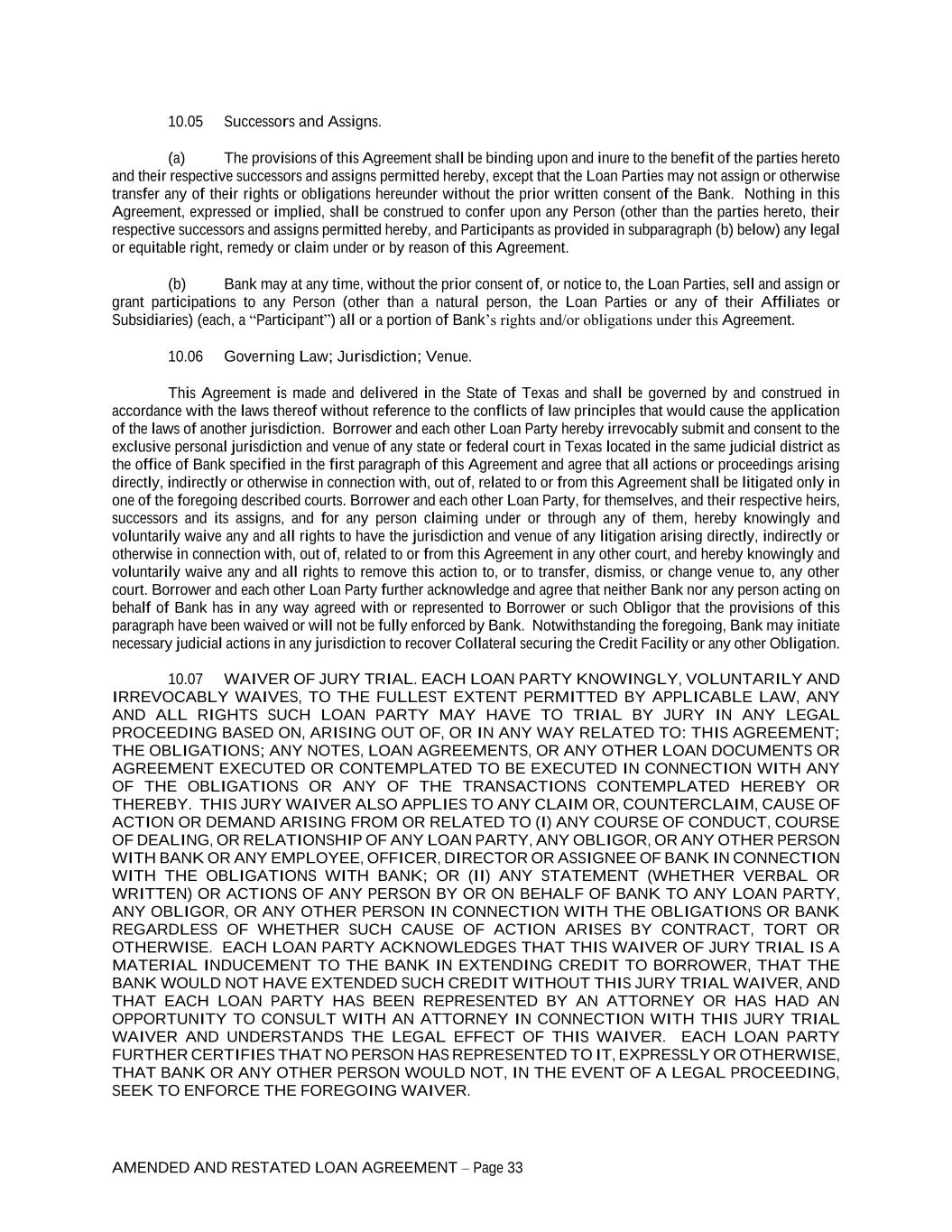 AMENDED AND RESTATED LOAN AGREEMENT – Page 33 10.05 Successors and Assigns. (a) The provisions of this Agreement shall be binding upon and inure to the benefit of the parties hereto and their respective successors and assigns permitted hereby, except that the Loan Parties may not assign or otherwise transfer any of their rights or obligations hereunder without the prior written consent of the Bank. Nothing in this Agreement, expressed or implied, shall be construed to confer upon any Person (other than the parties hereto, their respective successors and assigns permitted hereby, and Participants as provided in subparagraph (b) below) any legal or equitable right, remedy or claim under or by reason of this Agreement. (b) Bank may at any time, without the prior consent of, or notice to, the Loan Parties, sell and assign or grant participations to any Person (other than a natural person, the Loan Parties or any of their Affiliates or Subsidiaries) (each, a “Participant”) all or a portion of Bank’s rights and/or obligations under this Agreement. 10.06 Governing Law; Jurisdiction; Venue. This Agreement is made and delivered in the State of Texas and shall be governed by and construed in accordance with the laws thereof without reference to the conflicts of law principles that would cause the application of the laws of another jurisdiction. Borrower and each other Loan Party hereby irrevocably submit and consent to the exclusive personal jurisdiction and venue of any state or federal court in Texas located in the same judicial district as the office of Bank specified in the first paragraph of this Agreement and agree that all actions or proceedings arising directly, indirectly or otherwise in connection with, out of, related to or from this Agreement shall be litigated only in one of the foregoing described courts. Borrower and each other Loan Party, for themselves, and their respective heirs, successors and its assigns, and for any person claiming under or through any of them, hereby knowingly and voluntarily waive any and all rights to have the jurisdiction and venue of any litigation arising directly, indirectly or otherwise in connection with, out of, related to or from this Agreement in any other court, and hereby knowingly and voluntarily waive any and all rights to remove this action to, or to transfer, dismiss, or change venue to, any other court. Borrower and each other Loan Party further acknowledge and agree that neither Bank nor any person acting on behalf of Bank has in any way agreed with or represented to Borrower or such Obligor that the provisions of this paragraph have been waived or will not be fully enforced by Bank. Notwithstanding the foregoing, Bank may initiate necessary judicial actions in any jurisdiction to recover Collateral securing the Credit Facility or any other Obligation. 10.07 WAIVER OF JURY TRIAL. EACH LOAN PARTY KNOWINGLY, VOLUNTARILY AND IRREVOCABLY WAIVES, TO THE FULLEST EXTENT PERMITTED BY APPLICABLE LAW, ANY AND ALL RIGHTS SUCH LOAN PARTY MAY HAVE TO TRIAL BY JURY IN ANY LEGAL PROCEEDING BASED ON, ARISING OUT OF, OR IN ANY WAY RELATED TO: THIS AGREEMENT; THE OBLIGATIONS; ANY NOTES, LOAN AGREEMENTS, OR ANY OTHER LOAN DOCUMENTS OR AGREEMENT EXECUTED OR CONTEMPLATED TO BE EXECUTED IN CONNECTION WITH ANY OF THE OBLIGATIONS OR ANY OF THE TRANSACTIONS CONTEMPLATED HEREBY OR THEREBY. THIS JURY WAIVER ALSO APPLIES TO ANY CLAIM OR, COUNTERCLAIM, CAUSE OF ACTION OR DEMAND ARISING FROM OR RELATED TO (I) ANY COURSE OF CONDUCT, COURSE OF DEALING, OR RELATIONSHIP OF ANY LOAN PARTY, ANY OBLIGOR, OR ANY OTHER PERSON WITH BANK OR ANY EMPLOYEE, OFFICER, DIRECTOR OR ASSIGNEE OF BANK IN CONNECTION WITH THE OBLIGATIONS WITH BANK; OR (II) ANY STATEMENT (WHETHER VERBAL OR WRITTEN) OR ACTIONS OF ANY PERSON BY OR ON BEHALF OF BANK TO ANY LOAN PARTY, ANY OBLIGOR, OR ANY OTHER PERSON IN CONNECTION WITH THE OBLIGATIONS OR BANK REGARDLESS OF WHETHER SUCH CAUSE OF ACTION ARISES BY CONTRACT, TORT OR OTHERWISE. EACH LOAN PARTY ACKNOWLEDGES THAT THIS WAIVER OF JURY TRIAL IS A MATERIAL INDUCEMENT TO THE BANK IN EXTENDING CREDIT TO BORROWER, THAT THE BANK WOULD NOT HAVE EXTENDED SUCH CREDIT WITHOUT THIS JURY TRIAL WAIVER, AND THAT EACH LOAN PARTY HAS BEEN REPRESENTED BY AN ATTORNEY OR HAS HAD AN OPPORTUNITY TO CONSULT WITH AN ATTORNEY IN CONNECTION WITH THIS JURY TRIAL WAIVER AND UNDERSTANDS THE LEGAL EFFECT OF THIS WAIVER. EACH LOAN PARTY FURTHER CERTIFIES THAT NO PERSON HAS REPRESENTED TO IT, EXPRESSLY OR OTHERWISE, THAT BANK OR ANY OTHER PERSON WOULD NOT, IN THE EVENT OF A LEGAL PROCEEDING, SEEK TO ENFORCE THE FOREGOING WAIVER.