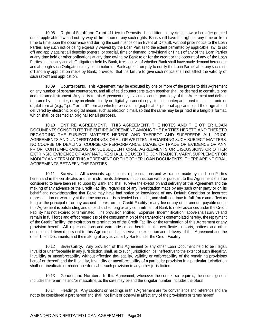 AMENDED AND RESTATED LOAN AGREEMENT – Page 34 10.08 Right of Setoff and Grant of Lien in Deposits. In addition to any rights now or hereafter granted under applicable law and not by way of limitation of any such rights, Bank shall have the right, at any time or from time to time upon the occurrence and during the continuance of an Event of Default, without prior notice to the Loan Parties, any such notice being expressly waived by the Loan Parties to the extent permitted by applicable law, to set off and apply against all deposits (general or special, time or demand, provisional or final) of any of the Loan Parties at any time held or other obligations at any time owing by Bank to or for the credit or the account of any of the Loan Parties against any and all Obligations held by Bank, irrespective of whether Bank shall have made demand hereunder and although such Obligations may be unmatured. Bank agree promptly to notify the Loan Parties after any such set- off and any application made by Bank; provided, that the failure to give such notice shall not affect the validity of such set-off and application. 10.09 Counterparts. This Agreement may be executed by one or more of the parties to this Agreement on any number of separate counterparts, and all of said counterparts taken together shall be deemed to constitute one and the same instrument. Any party to this Agreement may execute a counterpart copy of this Agreement and deliver the same by telecopier, or by an electronically or digitally scanned copy signed counterpart stored in an electronic or digital format (e.g., “.pdf” or “.tft” format) which preserves the graphical or pictorial appearance of the original and delivered by electronic or digital means, such as electronic mail, so that the same may be printed in a tangible format, which shall be deemed an original for all purposes. 10.10 ENTIRE AGREEMENT. THIS AGREEMENT, THE NOTES AND THE OTHER LOAN DOCUMENTS CONSTITUTE THE ENTIRE AGREEMENT AMONG THE PARTIES HERETO AND THERETO REGARDING THE SUBJECT MATTERS HEREOF AND THEREOF AND SUPERSEDE ALL PRIOR AGREEMENTS AND UNDERSTANDINGS, ORAL OR WRITTEN, REGARDING SUCH SUBJECT MATTERS. NO COURSE OF DEALING, COURSE OF PERFORMANCE, USAGE OF TRADE OR EVIDENCE OF ANY PRIOR, CONTEMPORANEOUS OR SUBSEQUENT ORAL AGREEMENTS OR DISCUSSIONS OR OTHER EXTRINSIC EVIDENCE OF ANY NATURE SHALL BE USED TO CONTRADICT, VARY, SUPPLEMENT OR MODIFY ANY TERM OF THIS AGREEMENT OR THE OTHER LOAN DOCUMENTS. THERE ARE NO ORAL AGREEMENTS BETWEEN THE PARTIES. 10.11 Survival. All covenants, agreements, representations and warranties made by the Loan Parties herein and in the certificates or other instruments delivered in connection with or pursuant to this Agreement shall be considered to have been relied upon by Bank and shall survive the execution and delivery of this Agreement and the making of any advance of the Credit Facility, regardless of any investigation made by any such other party or on its behalf and notwithstanding that Bank may have had notice or knowledge of any Default Condition or incorrect representation or warranty at the time any credit is extended hereunder, and shall continue in full force and effect as long as the principal of or any accrued interest on the Credit Facility or any fee or any other amount payable under this Agreement is outstanding and unpaid and so long as any commitment of Bank to make advances under the Credit Facility has not expired or terminated. The provision entitled “Expenses; Indemnification” above shall survive and remain in full force and effect regardless of the consummation of the transactions contemplated hereby, the repayment of the Credit Facility, the expiration or termination of the Credit Facility or the termination of this Agreement or any provision hereof. All representations and warranties made herein, in the certificates, reports, notices, and other documents delivered pursuant to this Agreement shall survive the execution and delivery of this Agreement and the other Loan Documents, and the making of any advance by Bank under the Credit Facility. 10.12 Severability. Any provision of this Agreement or any other Loan Document held to be illegal, invalid or unenforceable in any jurisdiction, shall, as to such jurisdiction, be ineffective to the extent of such illegality, invalidity or unenforceability without affecting the legality, validity or enforceability of the remaining provisions hereof or thereof; and the illegality, invalidity or unenforceability of a particular provision in a particular jurisdiction shall not invalidate or render unenforceable such provision in any other jurisdiction. 10.13 Gender and Number. In this Agreement, whenever the context so requires, the neuter gender includes the feminine and/or masculine, as the case may be and the singular number includes the plural. 10.14 Headings. Any captions or headings in this Agreement are for convenience and reference and are not to be considered a part hereof and shall not limit or otherwise affect any of the provisions or terms hereof.