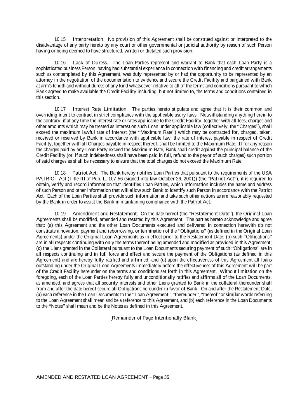AMENDED AND RESTATED LOAN AGREEMENT – Page 35 10.15 Interpretation. No provision of this Agreement shall be construed against or interpreted to the disadvantage of any party hereto by any court or other governmental or judicial authority by reason of such Person having or being deemed to have structured, written or dictated such provision. 10.16 Lack of Duress. The Loan Parties represent and warrant to Bank that each Loan Party is a sophisticated business Person, having had substantial experience in connection with financing and credit arrangements such as contemplated by this Agreement, was duly represented by or had the opportunity to be represented by an attorney in the negotiation of the documentation to evidence and secure the Credit Facility and bargained with Bank at arm's length and without duress of any kind whatsoever relative to all of the terms and conditions pursuant to which Bank agreed to make available the Credit Facility including, but not limited to, the terms and conditions contained in this section. 10.17 Interest Rate Limitation. The parties hereto stipulate and agree that it is their common and overriding intent to contract in strict compliance with the applicable usury laws. Notwithstanding anything herein to the contrary, if at any time the interest rate or rates applicable to the Credit Facility, together with all fees, charges and other amounts which may be treated as interest on such Loan under applicable law (collectively, the “Charges”), shall exceed the maximum lawful rate of interest (the “Maximum Rate”) which may be contracted for, charged, taken, received or reserved by Bank in accordance with applicable law, the rate of interest payable in respect of Credit Facility, together with all Charges payable in respect thereof, shall be limited to the Maximum Rate. If for any reason the charges paid by any Loan Party exceed the Maximum Rate, Bank shall credit against the principal balance of the Credit Facility (or, if such indebtedness shall have been paid in full, refund to the payor of such charges) such portion of said charges as shall be necessary to ensure that the total charges do not exceed the Maximum Rate. 10.18 Patriot Act. The Bank hereby notifies Loan Parties that pursuant to the requirements of the USA PATRIOT Act (Title III of Pub. L. 107-56 (signed into law October 26, 2001)) (the “Patriot Act”), it is required to obtain, verify and record information that identifies Loan Parties, which information includes the name and address of such Person and other information that will allow such Bank to identify such Person in accordance with the Patriot Act. Each of the Loan Parties shall provide such information and take such other actions as are reasonably requested by the Bank in order to assist the Bank in maintaining compliance with the Patriot Act. 10.19 Amendment and Restatement. On the date hereof (the “Restatement Date”), the Original Loan Agreements shall be modified, amended and restated by this Agreement. The parties hereto acknowledge and agree that: (a) this Agreement and the other Loan Documents executed and delivered in connection herewith do not constitute a novation, payment and reborrowing, or termination of the “Obligations” (as defined in the Original Loan Agreements) under the Original Loan Agreements as in effect prior to the Restatement Date; (b) such “Obligations” are in all respects continuing with only the terms thereof being amended and modified as provided in this Agreement; (c) the Liens granted in the Collateral pursuant to the Loan Documents securing payment of such “Obligations” are in all respects continuing and in full force and effect and secure the payment of the Obligations (as defined in this Agreement) and are hereby fully ratified and affirmed; and (d) upon the effectiveness of this Agreement all loans outstanding under the Original Loan Agreements immediately before the effectiveness of this Agreement will be part of the Credit Facility hereunder on the terms and conditions set forth in this Agreement. Without limitation on the foregoing, each of the Loan Parties hereby fully and unconditionally ratifies and affirms all of the Loan Documents, as amended, and agrees that all security interests and other Liens granted to Bank in the collateral thereunder shall from and after the date hereof secure all Obligations hereunder in favor of Bank. On and after the Restatement Date, (a) each reference in the Loan Documents to the “Loan Agreement”, “thereunder”, “thereof” or similar words referring to the Loan Agreement shall mean and be a reference to this Agreement, and (b) each reference in the Loan Documents to the “Notes” shall mean and be the Notes as defined in this Agreement. [Remainder of Page Intentionally Blank]