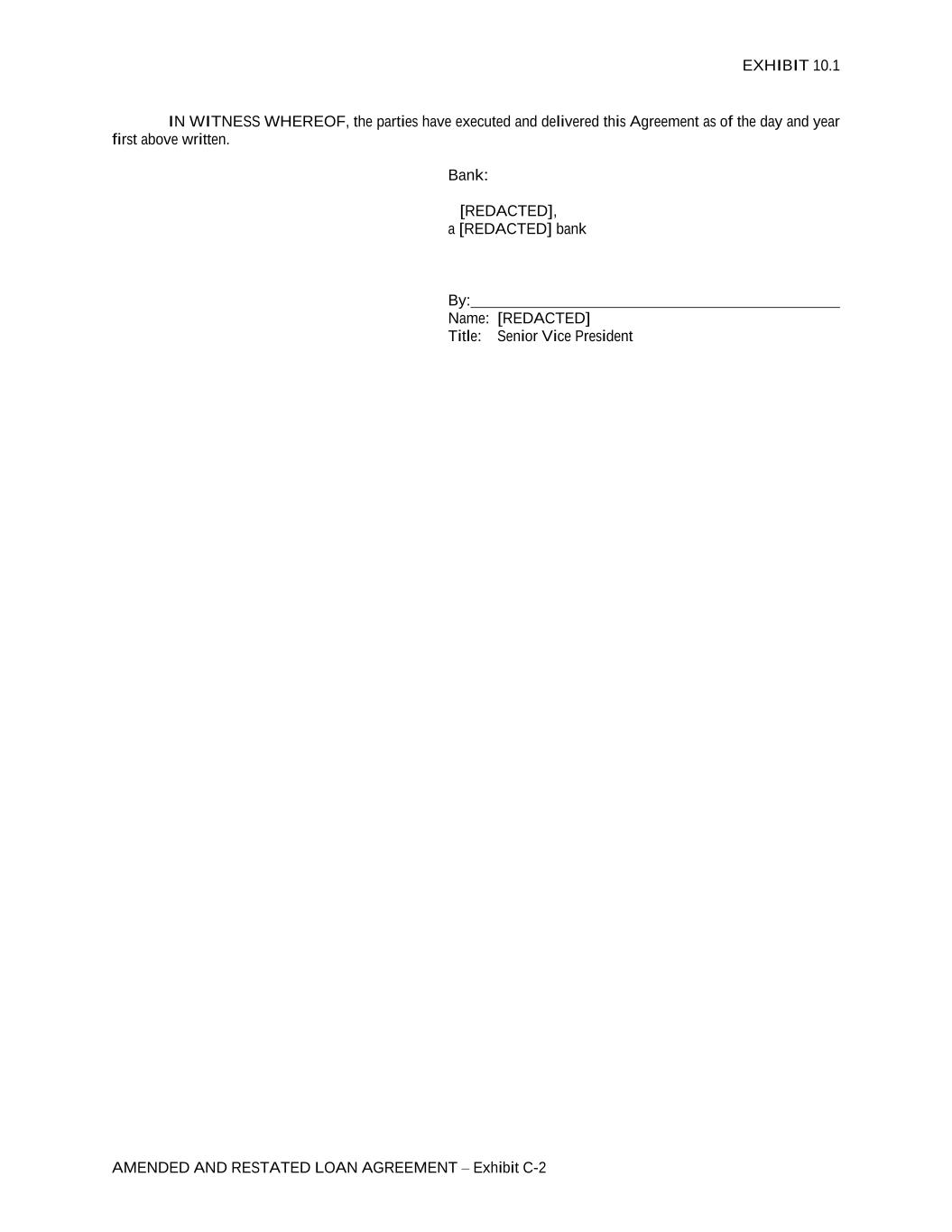EXHIBIT 10.1 AMENDED AND RESTATED LOAN AGREEMENT – Exhibit C-2 IN WITNESS WHEREOF, the parties have executed and delivered this Agreement as of the day and year first above written. Bank: [REDACTED], a [REDACTED] bank By: Name: [REDACTED] Title: Senior Vice President