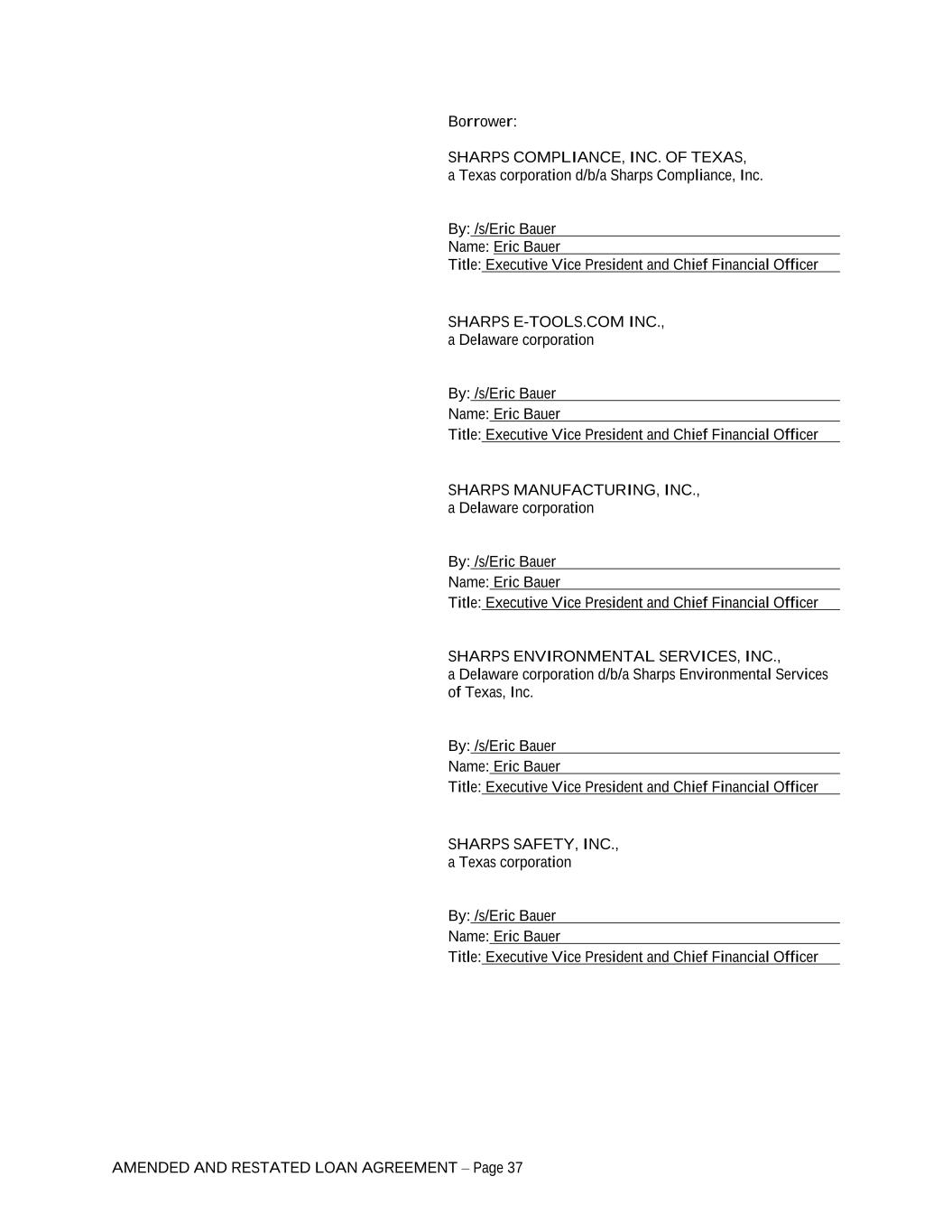 AMENDED AND RESTATED LOAN AGREEMENT – Page 37 Borrower: SHARPS COMPLIANCE, INC. OF TEXAS, a Texas corporation d/b/a Sharps Compliance, Inc. By: /s/Eric Bauer Name: Eric Bauer Title: Executive Vice President and Chief Financial Officer SHARPS E-TOOLS.COM INC., a Delaware corporation By: /s/Eric Bauer Name: Eric Bauer Title: Executive Vice President and Chief Financial Officer SHARPS MANUFACTURING, INC., a Delaware corporation By: /s/Eric Bauer Name: Eric Bauer Title: Executive Vice President and Chief Financial Officer SHARPS ENVIRONMENTAL SERVICES, INC., a Delaware corporation d/b/a Sharps Environmental Services of Texas, Inc. By: /s/Eric Bauer Name: Eric Bauer Title: Executive Vice President and Chief Financial Officer SHARPS SAFETY, INC., a Texas corporation By: /s/Eric Bauer Name: Eric Bauer Title: Executive Vice President and Chief Financial Officer