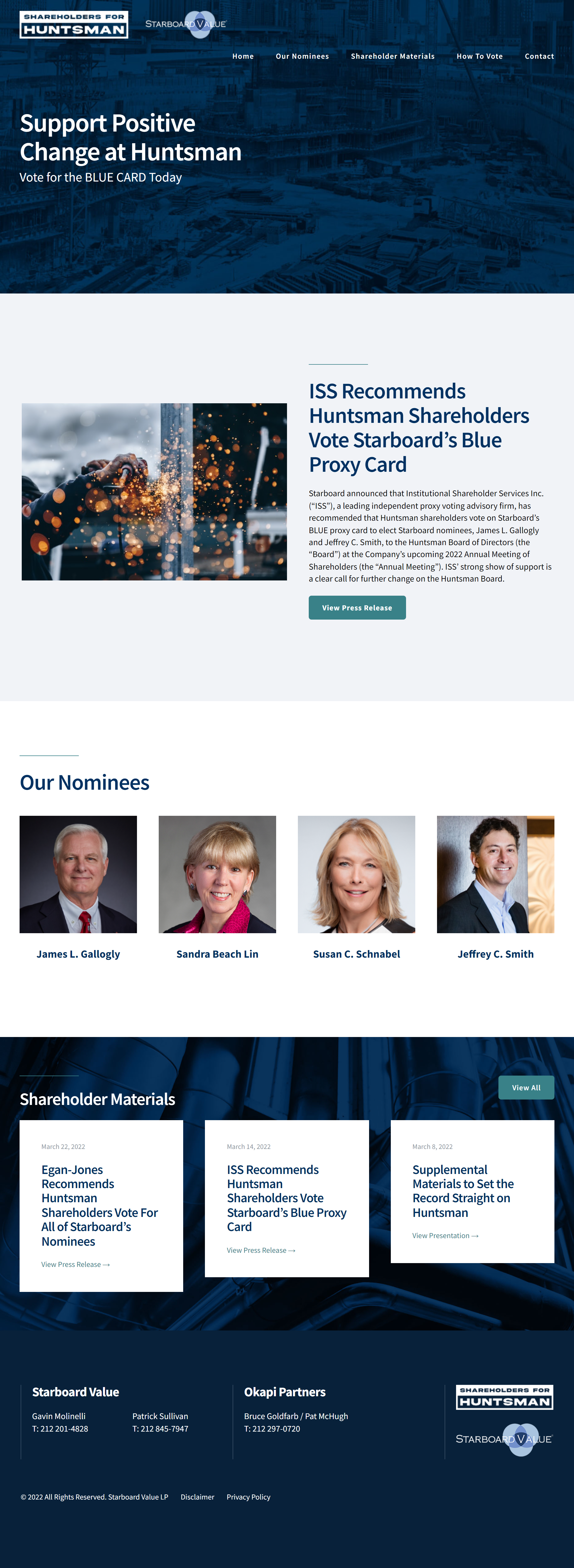 We invested in Huntsman because it has highly attractive assets, strong market positions, diverse product portfolios, innovative chemistries, and a difficult-to-replicate manufacturing footprint with opportunities to drive significantly improved financial results and shareholder returns. As we approach the end of this election contest, it is our hope to have the privilege and the opportunity to work with Huntsman, its leadership team, employees, customers, and partners. Our objective is to see Huntsman succeed and thrive under the oversight of a significantly enhanced Board. We have nominated a fantastic slate of highly-qualified director candidates who are truly independent, have relevant experience, and will seek to ensure that the Board acts independently and in the best interests of shareholders at all times. We appreciate the strong support from shareholders who have already voted for Starboard’s nominees on the BLUE proxy card and urge all of our fellow shareholders to vote for the election of all four of our highly-qualified nominees - James L. Gallogly, Sandra Beach Lin, Susan C. Schnabel, and Jeffrey C. Smith - on the BLUE proxy card TODAY.”