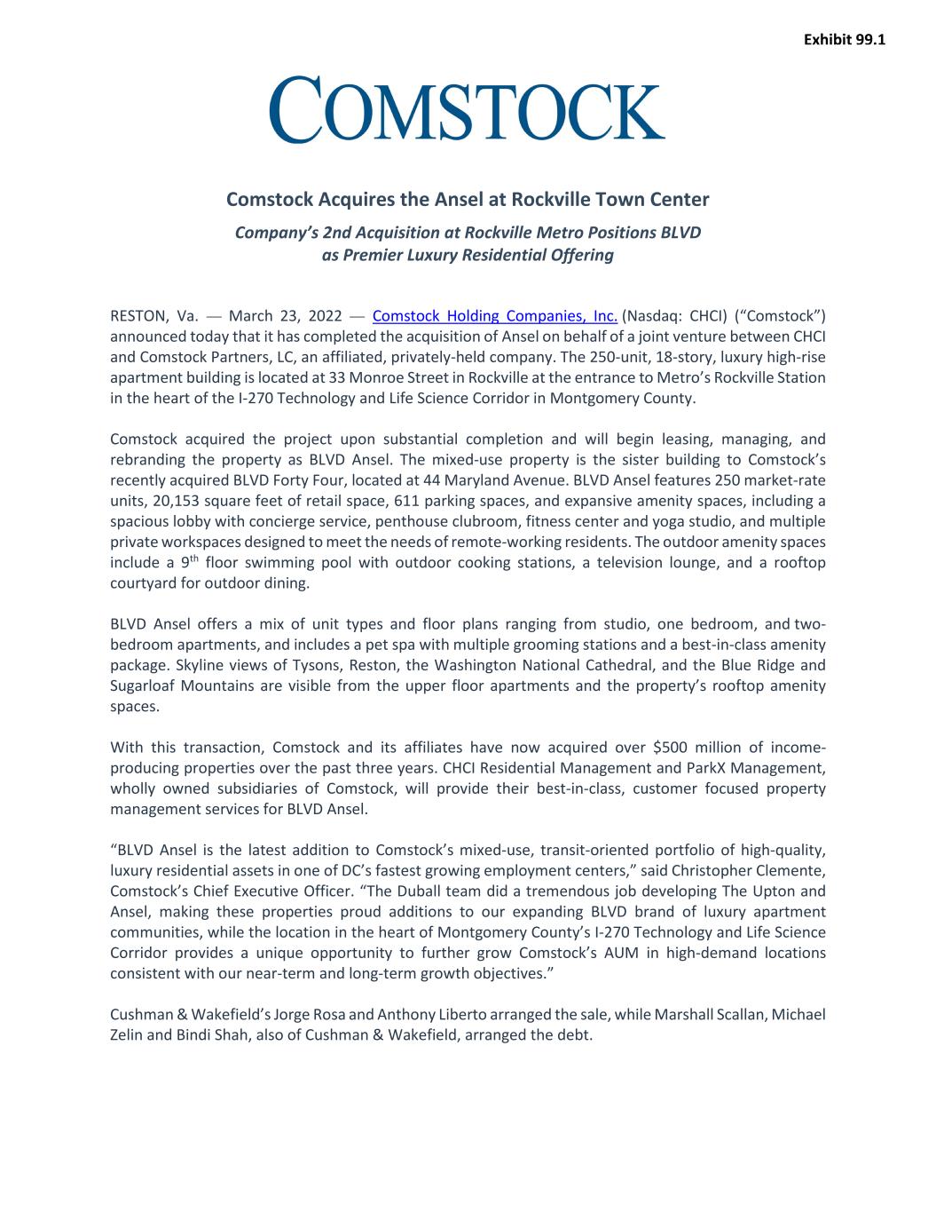 Comstock Acquires the Ansel at Rockville Town Center Company’s 2nd Acquisition at Rockville Metro Positions BLVD as Premier Luxury Residential Offering RESTON, Va. — March 23, 2022 — Comstock Holding Companies, Inc. (Nasdaq: CHCI) (“Comstock”) announced today that it has completed the acquisition of Ansel on behalf of a joint venture between CHCI and Comstock Partners, LC, an affiliated, privately-held company. The 250-unit, 18-story, luxury high-rise apartment building is located at 33 Monroe Street in Rockville at the entrance to Metro’s Rockville Station in the heart of the I-270 Technology and Life Science Corridor in Montgomery County. Comstock acquired the project upon substantial completion and will begin leasing, managing, and rebranding the property as BLVD Ansel. The mixed-use property is the sister building to Comstock’s recently acquired BLVD Forty Four, located at 44 Maryland Avenue. BLVD Ansel features 250 market-rate units, 20,153 square feet of retail space, 611 parking spaces, and expansive amenity spaces, including a spacious lobby with concierge service, penthouse clubroom, fitness center and yoga studio, and multiple private workspaces designed to meet the needs of remote-working residents. The outdoor amenity spaces include a 9th floor swimming pool with outdoor cooking stations, a television lounge, and a rooftop courtyard for outdoor dining. BLVD Ansel offers a mix of unit types and floor plans ranging from studio, one bedroom, and two- bedroom apartments, and includes a pet spa with multiple grooming stations and a best-in-class amenity package. Skyline views of Tysons, Reston, the Washington National Cathedral, and the Blue Ridge and Sugarloaf Mountains are visible from the upper floor apartments and the property’s rooftop amenity spaces. With this transaction, Comstock and its affiliates have now acquired over $500 million of income- producing properties over the past three years. CHCI Residential Management and ParkX Management, wholly owned subsidiaries of Comstock, will provide their best-in-class, customer focused property management services for BLVD Ansel. “BLVD Ansel is the latest addition to Comstock’s mixed-use, transit-oriented portfolio of high-quality, luxury residential assets in one of DC’s fastest growing employment centers,” said Christopher Clemente, Comstock’s Chief Executive Officer. “The Duball team did a tremendous job developing The Upton and Ansel, making these properties proud additions to our expanding BLVD brand of luxury apartment communities, while the location in the heart of Montgomery County’s I-270 Technology and Life Science Corridor provides a unique opportunity to further grow Comstock’s AUM in high-demand locations consistent with our near-term and long-term growth objectives.” Cushman & Wakefield’s Jorge Rosa and Anthony Liberto arranged the sale, while Marshall Scallan, Michael Zelin and Bindi Shah, also of Cushman & Wakefield, arranged the debt. Exhibit 99.1
