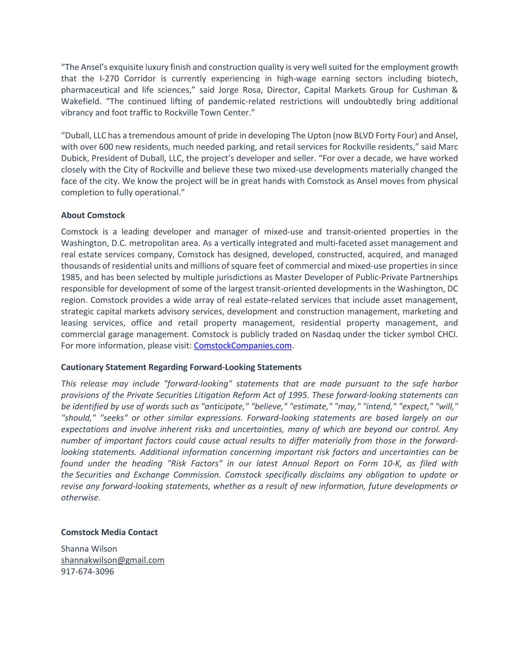 “The Ansel’s exquisite luxury finish and construction quality is very well suited for the employment growth that the I-270 Corridor is currently experiencing in high-wage earning sectors including biotech, pharmaceutical and life sciences,” said Jorge Rosa, Director, Capital Markets Group for Cushman & Wakefield. “The continued lifting of pandemic-related restrictions will undoubtedly bring additional vibrancy and foot traffic to Rockville Town Center.” “Duball, LLC has a tremendous amount of pride in developing The Upton (now BLVD Forty Four) and Ansel, with over 600 new residents, much needed parking, and retail services for Rockville residents,” said Marc Dubick, President of Duball, LLC, the project’s developer and seller. “For over a decade, we have worked closely with the City of Rockville and believe these two mixed-use developments materially changed the face of the city. We know the project will be in great hands with Comstock as Ansel moves from physical completion to fully operational.” About Comstock Comstock is a leading developer and manager of mixed-use and transit-oriented properties in the Washington, D.C. metropolitan area. As a vertically integrated and multi-faceted asset management and real estate services company, Comstock has designed, developed, constructed, acquired, and managed thousands of residential units and millions of square feet of commercial and mixed-use properties in since 1985, and has been selected by multiple jurisdictions as Master Developer of Public-Private Partnerships responsible for development of some of the largest transit-oriented developments in the Washington, DC region. Comstock provides a wide array of real estate-related services that include asset management, strategic capital markets advisory services, development and construction management, marketing and leasing services, office and retail property management, residential property management, and commercial garage management. Comstock is publicly traded on Nasdaq under the ticker symbol CHCI. For more information, please visit: ComstockCompanies.com. Cautionary Statement Regarding Forward-Looking Statements This release may include "forward-looking" statements that are made pursuant to the safe harbor provisions of the Private Securities Litigation Reform Act of 1995. These forward-looking statements can be identified by use of words such as "anticipate," "believe," "estimate," "may," "intend," "expect," "will," "should," "seeks" or other similar expressions. Forward-looking statements are based largely on our expectations and involve inherent risks and uncertainties, many of which are beyond our control. Any number of important factors could cause actual results to differ materially from those in the forward- looking statements. Additional information concerning important risk factors and uncertainties can be found under the heading "Risk Factors" in our latest Annual Report on Form 10-K, as filed with the Securities and Exchange Commission. Comstock specifically disclaims any obligation to update or revise any forward-looking statements, whether as a result of new information, future developments or otherwise. Comstock Media Contact Shanna Wilson shannakwilson@gmail.com 917-674-3096