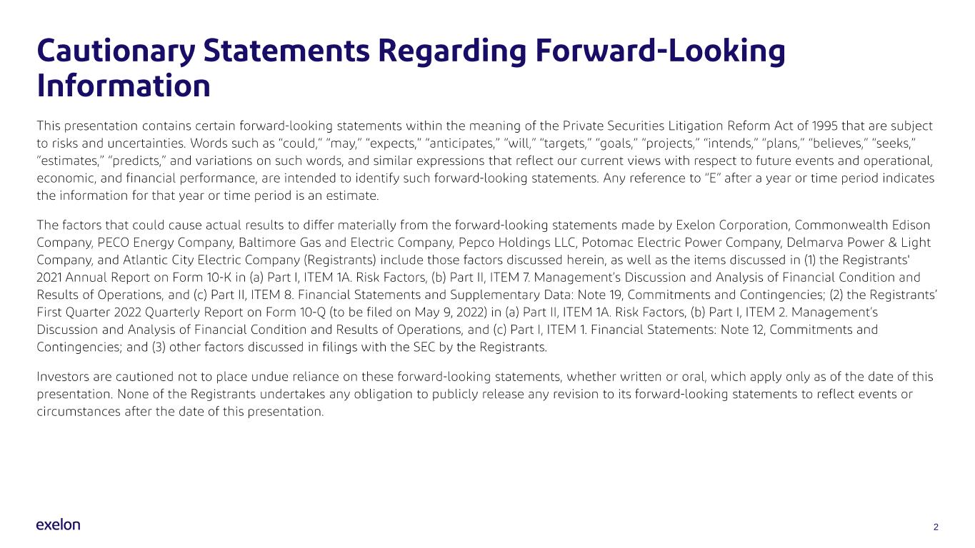 exc-20220509PA10 South Dearborn StreetP.O. Box 805379ChicagoIL60680-5379(800)483-3220IL10 South Dearborn Street49th FloorChicagoIL60603-2300(312)394-4321PAP.O. Box 86992301 Market StreetPhiladelphiaPA19101-8699(215)841-4000MD2 Center Plaza110 West Fayette StreetBaltimoreMD21201-3708(410)234-5000DE701 Ninth Street, N.W.Washington, District of Columbia20068-0001(202)872-2000DCVA701 Ninth Street, N.W.Washington, District of Columbia20068-0001(202)872-2000DEVA500 North Wakefield DriveNewarkDE19702-5440(202)872-2000NJ500 North Wakefield DriveNewarkDE19702-5440(202)872-2000Common stock, without par valueEXCNasdaqEXC/28NYSECumulative Preferred Security, Series D,00011093570000022606000007810000000094660001135971000007973200000278790000008192False☐00011093572022-05-092022-05-090001109357exc:CommonwealthEdisonCoMember2022-05-092022-05-090001109357exc:PecoEnergyCoMember2022-05-092022-05-090001109357exc:BaltimoreGasAndElectricCompanyMember2022-05-092022-05-090001109357exc:PepcoHoldingsLLCMember2022-05-092022-05-090001109357exc:PotomacElectricPowerCompanyMember2022-05-092022-05-090001109357exc:DelmarvaPowerandLightCompanyMember2022-05-092022-05-090001109357exc:AtlanticCityElectricCompanyMember2022-05-092022-05-090001109357exc:PotomacElectricPowerCompanyMemberstpr:DC2022-05-092022-05-090001109357exc:PotomacElectricPowerCompanyMemberstpr:VA2022-05-092022-05-090001109357stpr:DEexc:DelmarvaPowerandLightCompanyMember2022-05-092022-05-090001109357exc:DelmarvaPowerandLightCompanyMemberstpr:VA2022-05-092022-05-09