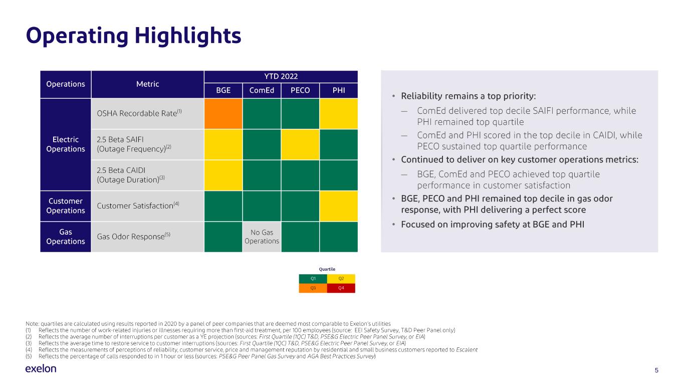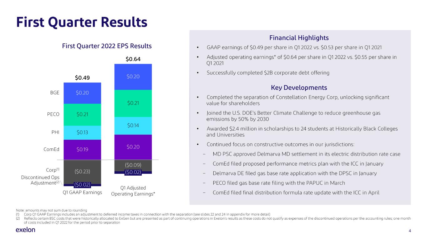 On May 9, 2022, Exelon Corporation (Exelon) announced via press release its results for the first quarter ended March 31, 2022. A copy of the press release and related attachments are attached hereto as Exhibit 99.1. Also attached as Exhibit 99.2 to this Current Report on Form 8-K are the presentation slides to be used at the first quarter 2022 earnings conference call. This Form 8-K and the attached exhibits are provided under Items 2.02, 7.01 and 9.01 of Form 8-K and are furnished to, but not filed with, the Securities and Exchange Commission.