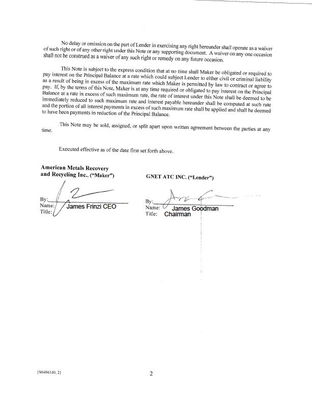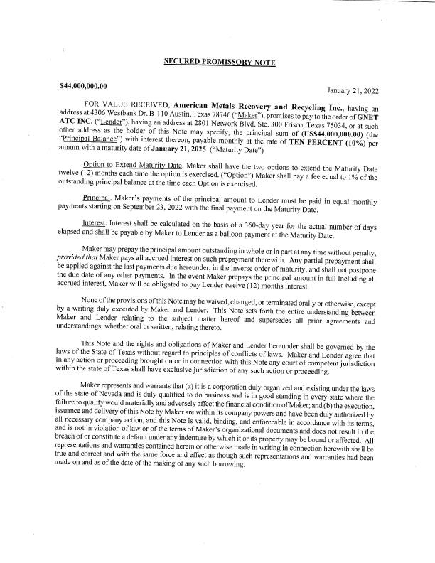 SECURED PROMISSORY NOTE $44,000,000.00 January 21, 2022 FOR VALUE RECEIVED, American Metals Recovery and Recycling Inc., having an address at 4306 Westbank Dr. B-l I0 Austin, Texas 78746 (“Maker”). promises to pay to the order of GNET ATC INC. (“Lender”). having an address at 2801 Network Blvd. Ste. 300 Frisco, Texas 75034. or at such other address as the holder of this Note may specify, the principal sum of (US$44,000,000.00) (the “Principal Balance”) with interest thereon, payable monthly at the rate of TEN PERCENT (10%) per annum with a maturity date of January 21, 2025 (“Maturity Date") Option to Extend Maturity Date. Maker shall have the two options to extend the Maturity Date twelve (12) months each time the option is exercised. (“Option”) Maker shall pay a fee equal to 1% of the outstanding principal balance at the time each Option is exercised. Principal. Maker’s payments of the principal amount to Lender must be paid in equal monthly payments starting on September 23, 2022 with the final payment on the Maturity Date. lnterest. Interest shall be calculated on the basis of a 360-day year for the actual number of days elapsed and shall be payable by Maker to Lender as a balloon payment at the Maturity Date. Maker may prepay the principal amount outstanding in whole or in part at any time without penalty, provided that Maker pays all accrued interest on such prepayment therewith. Any partial prepayment shall be applied against the last payments due hereunder, in the inverse order of maturity, and shall not postpone the due date of any other payments. ln the event Maker prepays the principal amount in full including all accrued interest, Maker will be obligated to pay Lender twelve ( l 2) months interest. None of the provisions of this Note may be waived, changed, or terminated orally or otherwise, except by a writing duly executed by Maker and Lender. This Note sets forth the entire understanding between Maker and Lender relating to the subject matter hereof and supersedes all prior agreements and understandings, whether oral or written, relating thereto. This Note and the rights and obligations of Maker and Lender hereunder shall be governed by the laws of the State of Texas without regard to principles of conflicts of lawst Maker and Lender agree that in any action or proceeding brought on or in connection with this Note any court of competent jurisdiction within the state of Texas shall have exclusive jurisdiction of any such action or proceeding. Maker represents and warrants that (a) it is a corporation duly organized and existing under the laws of the state of Nevada and is duly qualified to do business and is in good standing in every state where the failure to qualify would material I y and adversely affect the financial condition of Maker; and (b) the execution. issuance and delivery of this Note by Maker are within its company powers and have been duly authorized by all necessary company action, and this Note is valid, binding, and enforceable in accordance with its temis, and is not in violation of law or of the terms of Maker’s organizational documents and docs not result in the breach of or constitute a default under any indenture by which it or its property may be bound or affected. All representations and warranties contained herein or otherwise made in writing in connection herewith shall be true and correct and with the same force and effect as though such representations and warranties had been made on and as of the date of the making of any such borrowing. No delay or omission on the pan of Lender in exercising any right hereunder shall operate as a waiver of such right or of any other right under this Note or any supporting document. A waiver on any one occasion shall not be construed as a Waiver of any such right or remedy on any fi.|ture occasion. This Note is subject to the express condition that at no time shall Maker be obligated or required to pay interest on the Principal Balance at a rate which could subject Lender to either civil or criminal liability as a result of being in excess of the maximum rate which Maker is permitted by law to contract or agree to pay. lf, by the terms of this Note, Maker is at any time required or obligated to pay interest on the Principal Balance at a rate in excess of such maximum rate, the rate of interest under this Note shall be deemed to be immediately reduced to such maximum rate and interest payable hereunder shall be computed at such rate and the portion of all interest payments in excess of such maximum rate shall be applied and shall be deemed to have been payments in reduction of the Principal Balance. This Note may be sold, assigned, or split apart upon written agreement between the parties at any time. Executed effective as of the date first set forth above. American Metals Recovery and Recycling Inc., (“Maker”) GNET ATC INC. (“Lender”) ”'/ M/' to /" _/"1' 7‘ A _V/M‘? :70’ ~\.._.. By: //V By: /7 /L’ . Nam¢I/ James Frinzi CEO Name: James G0 dman Titlez‘ Tillei Chairman ‘ {N0494l40. 2; 2