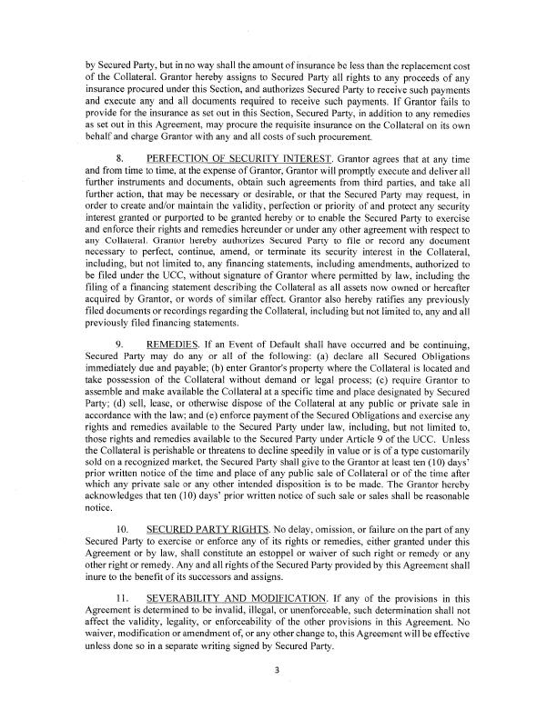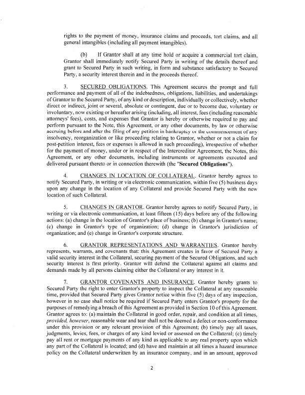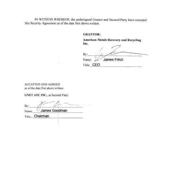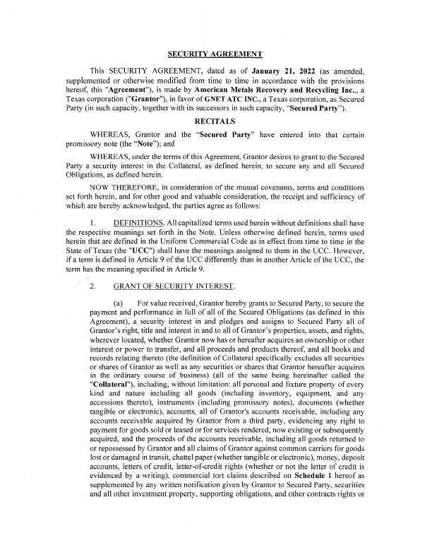 SECURITY AGREEMENT This SECURITY AGREEMENT, dated as of January 21, 2022 (as amended, supplemented or otherwise modified from time to time in accordance with the provisions hereof, this "Agreement"), is made by American Metals Recovery and Recycling Inc.,, a Texas corporation ("Grantor"), in favor of GNET ATC INC., a Texas corporation, as Secured Party (in such capacity, together with its successors in such capacity, “Secured Party”). REC ITA LS WHEREAS, Grantor and the “Secured Party” have entered into that certain promissory note (the “Note”); and WHEREAS, under the terms of this Agreement, Grantor desires to grant to the Secured Party a security interest in the Collateral, as defined herein, to secure any and all Secured Obligations, as defined herein. NOW THEREFORE, in consideration of the mutual covenants, terms and conditions set forth herein, and for other good and valuable consideration. the receipt and sufficiency of which are hereby acknowledged, the parties agree as follows: 1. DEFINITIONS. All capitalized terms used herein without definitions shall have the respective meanings set forth in the Note. Unless otherwise defined herein, terms used herein that are defined in the Uniform Commercial Code as in effect from time to time in the State of Texas (the "UCC“) shall have the meanings assigned to them in the UCC. However, if a term is defined in Article 9 of the UCC differently than in another Article of the UCC, the term has the meaning specified in Article 9. 2. GRANT OF SECURITY INTEREST. (a) For value received, Grantor hereby grants to Secured Party, to secure the payment and performance in full of all of the Secured Obligations (as defined in this Agreement), a security interest in and pledges and assigns to Secured Party all of Grantor’s right, title and interest in and to all of Grantor’s properties, assets, and rights, wherever located, whether Grantor now has or hereafter acquires an ownership or other interest or power to transfer, and all proceeds and products thereof, and all books and records relating thereto (the definition of Collateral specifically excludes all securities or shares of Grantor as well as any securities or shares that Grantor hereafter acquires in the ordinary course of business) (all of the same being hereinafter called the "C0llateraI"), including, without limitation: all personal and fixture property of every kind and nature including all goods (including inventory, equipment, and any accessions thereto), instruments (including promissory notes), documents (whether tangible or electronic), accounts, all of Grantor's accounts receivable, including any accounts receivable acquired by Grantor from a third party, evidencing any right to payment for goods sold or leased or for services rendered, now existing or subsequently acquired, and the proceeds of the accounts receivable, including all goods returned to or repossessed by Grantor and all claims of Grantor against common carriers for goods lost or damaged in transit, chattel paper (whether tangible or electronic), money, deposit accounts, letters of credit, letter-of-credit rights (whether or not the letter of credit is evidenced by a writing), commercial tort claims described on Schedule 1 hereof as supplemented by any written notification given by Grantor to Secured Party, securities and all other investment property, supporting obligations, and other contracts rights or rights to the payment of money, insurance claims and proceeds, tort claims, and all general intangibles (including all payment intangibles)‘ (b) If Grantor shall at any time hold or acquire a commercial tort claim, Grantor shall immediately notify Secured Party in writing of the details thereof and grant to Secured Party in such writing, in form and substance satisfactory to Secured Party, a security interest therein and in the proceeds thereof. 3. SECURED OBLIGATIONS. This Agreement secures the prompt and full performance and payment of all of the indebtedness, obligations, liabilities, and undertakings of Grantor to the Secured Party, of any kind or description, individually or collectively, whether direct or indirect, joint or several, absolute or contingent, due or to become due, voluntary or involuntary, now existing or hereafter arising (including, all interest, fees (including reasonable attorneys‘ fees), costs, and expenses that Grantor is hereby or otherwise required to pay and perfonn pursuant to the Note, this Agreement, or any other documents, by law or otherwise accruing before and after the filing of any petition in bankruptcy or the commencement of any insolvency, reorganization or like proceeding relating to Grantor, whether or not a claim for post-petition interest, fees or expenses is allowed in such proceeding), irrespective of whether for the payment of money, under or in respect of the lntercreditor Agreement, the Notes, this Agreement, or any other documents, including instruments or agreements executed and delivered pursuant thereto or in connection therewith (the "Secured Obligations"). 4. CHANGES IN LOCATION OF COLLATERAL. Grantor hereby agrees to notify Secured Party, in writing or via electronic communication, within five (5) business days upon any change in the location of any Collateral and provide Secured Party with the new location of such Collateral. 5. _C,H__A_N_GE_S IN, (_}_RANf,l‘_OR. Grantor hereby agrees to notify Secured Party, in writing or via electronic communication, at least fifteen (I5) days before any of the following actions: (a) change in the location of Grantor's place of business; (b) change in Grantor's name; (e) change in Grantor's type of organization; (d) change in Grantor's jurisdiction of organization; and (e) change in Grantor's corporate structure. 6. GRANTOR REPRESENTATIONS AND WARRANTIES. Grantor hereby represents, warrants, and covenants that: this Agreement creates in favor of Secured Party a valid security interest in the Collateral, securin
