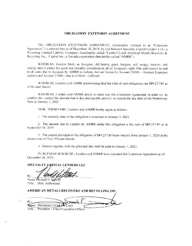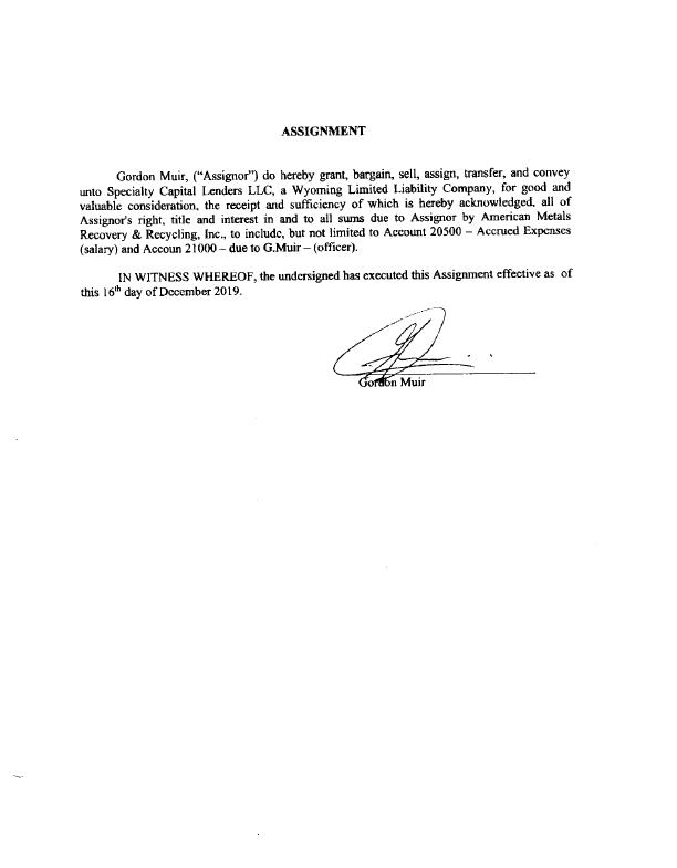 ASSIGNMENT Gordon Muir, (“Assignor") do hereby grant, bargain, sell, assign, transfer, and convey unto Specialty Capital Lenders LLC, a Wyoming Limited Liability Company, for good and valuable consideration. the receipt and sufficiency of which is hereby acknowledged. all of Assign0r's right, title and interest in and to all sums due to Assignor by American Metals Recovery & Recycling, lnc., to include, but not limited to Account 20500 — Accrued Expenses (salary) and Accoun 21000 — due to G.Muir — (officer). lN WITNESS WHEREOF, the undersigned has executed this Assignment effective as of this 16"" day of December 2019. n Muir OBLIGATION EXTF,NSI()N AGREEMENT T hi5 (,)BLI(}ATlO?\i EX'HjT\i$i()N ,~\C»Rli{~fMl'.NT. (hcreinafier rcf<:rrcd to as "lixtensmn /\grcu;m~:\x.‘”) is entered into as ofllccembcr H4. 2029, by zmd between Speciahy Lfupixal hzndgrs I,LC_ a V~’ymning Limited l_iaI>i!ii_\' (Tumpany. ('hcrcinz1I‘Ler caiicd “I_,cr1<!crs") and Anxcrican Mclals Rccowry A’; Rcc_\‘\3§ing ln<.. (fzxpiwl lncz. a E\’¢\=ada corgmratiun Qhereimfhrr‘ caficd “!\MRR"). Vv‘II¥'%R.kI!\_\f. <fmrdr>n Muir. as Assignor, did hcrch} gram, bargain. scil. as-sign. zmnsibr. and come; unw !.¢n<Iers fur gum! and valuable ¢<>nsideruli(>n ali of/\ssig;n<.1r'> right, (Me and imcrcsi in and to mi? sum< due to A»*ig110r by AMRR to inciudc“ hm um iimiicd w Ac¢<.>um Z()5(>U ~ Accrued lixpenscs (>aa%ary) and Acmun Z1U(J()— due Iv (}.!\<11,1ir~(<,\fi3ccr)4 \*\"i{F,R¥1.-<\,‘%. Lenders and AMRR zxcknm\lc<igetl1zn the total of said ubiigminn> are 5289.57.85 an; of ms daze hcreoi WH§;R}‘{x\S., I,cnclcr:\" and AMRR desire to enter Emu this iixtcnsion Agreement in order U) to c0|\t%nn lhc correct the amount that is due and payable and (ii) to extend the due dam: oftlw Prcnnissory Note in .I:mum"y 1. 2021 f\;(')\>v‘. TI §f~1RH‘()RE*l, Lenders and A MRR hawcby agree as follows I. The muiurity dam oflhe ubligaiion is extended 10 January L 2021. 2. The amount due to Lenders by AMRR under this obligation is the wrn of $8<J.Z57.&5 as at Scpxcmhcr 30. 1(3)‘). 3; The unpaid principal ofthc ohiigmion m"$8‘?).257.85 bears interest from January 1, 2020 at the inwrcxt mic of five (5%) per emuum. 4. Imercsi wgcthcr with ihc principai due shali be paid on Jzmuary L 1302!. l?\ \\’!T?\’!§SS \J\’§§E'lRl.ZOF.‘ Lendcrs and AMRR have executed this EX!¢‘I1$;iOh Agreemem as of Dcculn bcr I3. 2411‘). SPF.("lAl.T\’ ' PITAL LENDERS LLC B» , ...,,-.~ Name: Ronald .1. f 'uh r Hue: DulyAulhorized AMERl(“A?\’ METALS RI'l(T()VERY AND RECYCLING INC, Dehneniuofft ' ‘uca (___'_~_____d___ Title; ~?7§5?;T3é,'§iw:CT!1icf kiwczative ()fl'xccr