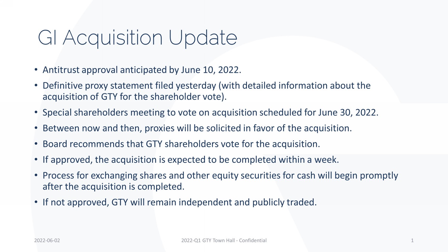 GI Acquisition Update • Antitrust approval anticipated by June 10, 2022. • Definitive proxy statement filed yesterday (with detailed information about the acquisition of GTY for the shareholder vote). • Special shareholders meeting to vote on acquisition scheduled for June 30, 2022. • Between now and then, proxies will be solicited in favor of the acquisition. • Board recommends that GTY shareholders vote for the acquisition. • If approved, the acquisition is expected to be completed within a week. • Process for exchanging shares and other equity securities for cash will begin promptly after the acquisition is completed. • If not approved, GTY will remain independent and publicly traded. 2022 - 06 - 02 2022 - Q1 GTY Town Hall - Confidential 1