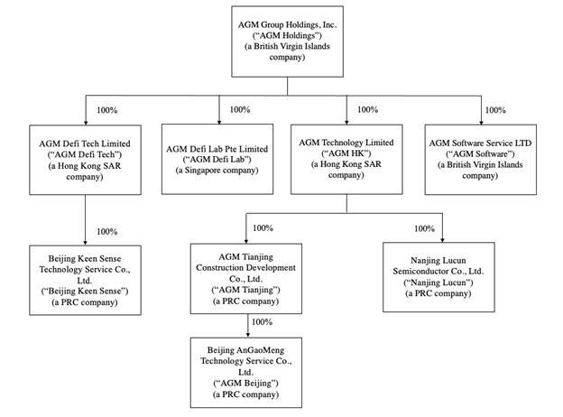 AGM Group Holdings, Inc. is a holding company established in the British Virgin Islands with no operations of its own. We conduct operations primarily through our operating subsidiaries in the British Virgin Islands, Singapore, Hong Kong and the PRC. The Class A ordinary shares offered in this prospectus are those of AGM Group Holdings, Inc., the holding company. Shareholders of AGM Group Holdings, Inc. are not directly investing in and may never hold equity interest in the operating subsidiaries. Our current corporate structure is as follows: