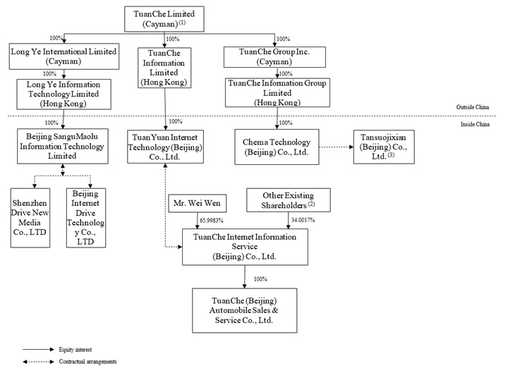 We are not a Chinese operating company. TuanChe Limited, our ultimate Cayman Islands holding company, does not have any substantive operations. We carry out our value-added telecommunications business in mainland China through our subsidiaries in mainland China, the variable interest entities (the “VIEs”), and their subsidiaries. Neither the investors in us nor we ourselves have an equity ownership in, direct foreign investment in, or control of, through such ownership or investment, the VIEs. Instead, we, through our wholly owned subsidiaries in mainland China (the “WFOEs”), entered into a series of contractual arrangements with the VIEs and their respective shareholders. Neither we nor our subsidiaries own any share in the VIEs. Because of these contractual arrangements, we are the primary beneficiary of the VIEs for accounting purposes and able to consolidate the financial results of the VIEs with ours only if we meet the conditions for consolidation under U.S. GAAP. PRC laws and regulations restrict and impose conditions on foreign investment in value-added telecommunications services business. Accordingly, we operate our value-added communications business in mainland China through the VIEs and their subsidiaries, and we could receive the economic rights and exercise control that results in consolidation of the VIEs’ operations and financial results into our financial statements through the contractual arrangements. The VIE structure is used to replicate foreign investment in China-based companies where the PRC laws restrict direct foreign investment in the operating companies. However, our contractual arrangements with the VIEs are not equivalent of an investment in the VIEs. The VIE structure involves unique risks to investors in the ADSs. Investors in the ADSs are purchasing equity securities of our ultimate Cayman Islands holding company rather than purchasing equity securities of the VIEs, and investors in the ADSs may never hold equity interests in the VIEs. As used in this prospectus, “we,” “us,” “our company,” “our,” or “TuanChe” refers to TuanChe Limited and its subsidiaries, and the VIEs refer to TuanChe Internet Information Service (Beijing) Co., Ltd., Shenzhen Drive New Media Co., Ltd., Beijing Internet Drive Technology Co., Ltd., and/or Tansuojixian Technology (Beijing) Co., Ltd., and their respective subsidiaries, as the context requires.