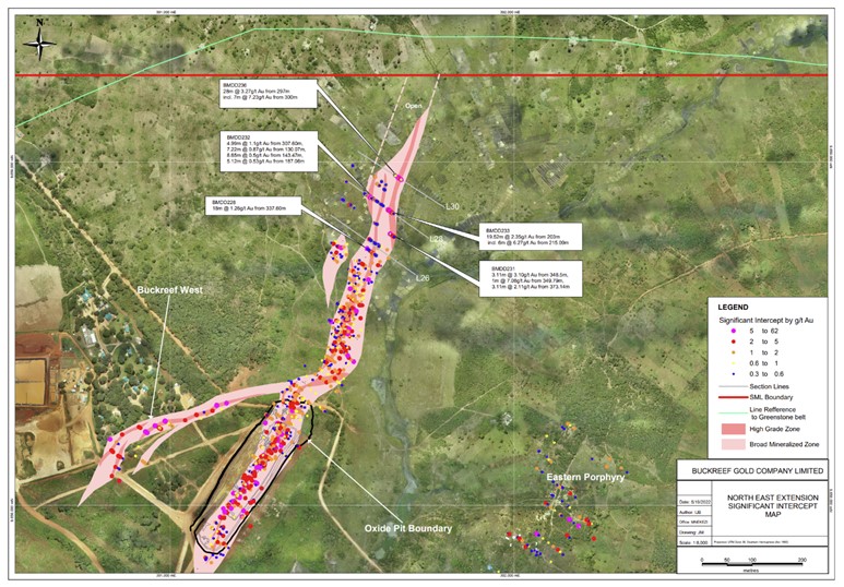 The results summarized in this release are from Buckreef Main Zone NEE prospect. The prospect is an extension of the known Buckreef Main Zone. The intersections reported here are a down-hole length and may not represent true width, but the true width is estimated to be approximately 60% of true width.