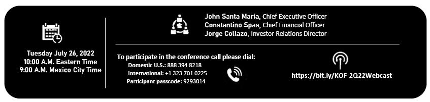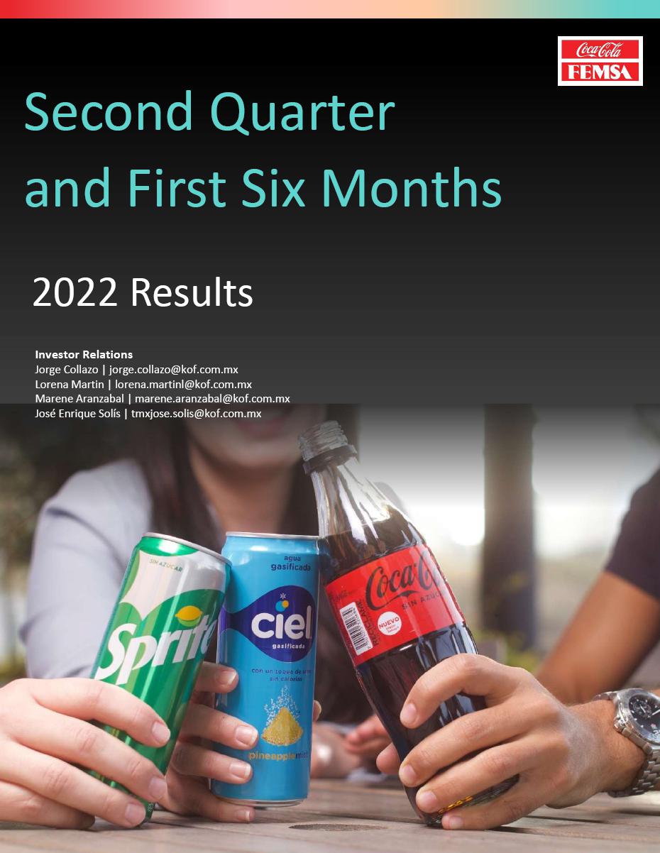 Mexico City, July 25, 2022, Coca-Cola FEMSA, S.A.B. de C.V. (BMV: KOFUBL, NYSE: KOF) (“Coca-Cola FEMSA”, “KOF” or the “Company”), the largest Coca-Cola franchise bottler in the world by sales volume, announces results for the second quarter and the first six months of 2022.