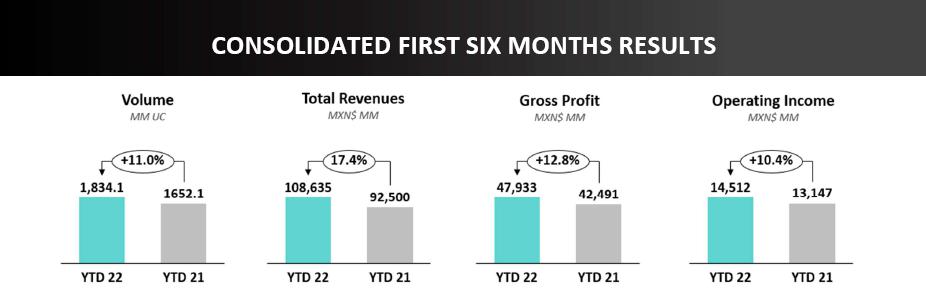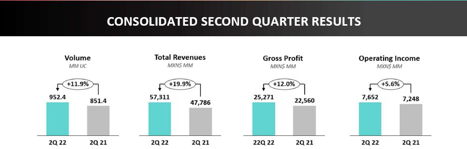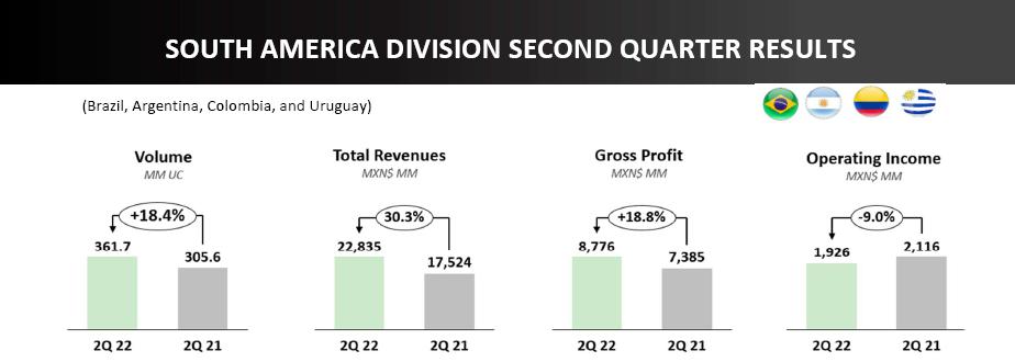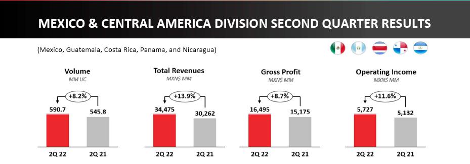 | · | Consolidated volumes increased 11.9% as compared to the second quarter of 2021. This increase was driven mainly by double-digit volume increases in Brazil, Colombia, Argentina, and Central America, coupled with volume growth in the rest of our territories. On a comparable basis, our volume increased 11.0%. |