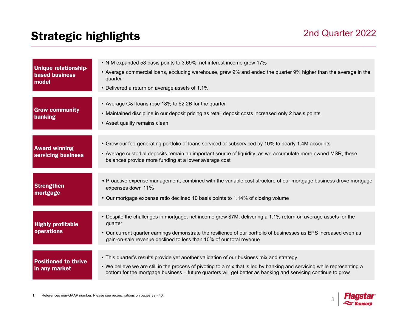 2 2nd Quarter 2022 This presentation contains "forward-looking statements" within the meaning of the Private Securities Litigation Reform Act of 1995, as amended. Forward-looking statements are based on management’s current expectations and assumptions regarding the Company’s business and performance, the economy and other future conditions, and forecasts of future events, circumstances and results. However, they are not guarantees of future performance and are subject to known and unknown risks, uncertainties, contingencies and other factors. Generally, forward-looking statements are not based on historical facts but instead represent our management’s beliefs regarding future events. Such statements may be identified by words such as believe, expect, anticipate, intend, plan, estimate, may increase, may fluctuate, and similar expressions or future or conditional verbs such as will, should, would and could. Such statements are based on management’s current expectations and are subject to risks, uncertainties and changes in circumstances. Actual results and capital and other financial conditions may differ materially from those included in these statements due to a variety of factors, including without limitation those found in periodic Flagstar reports filed with the U.S. Securities and Exchange Commission, which are available on the Company’s website (flagstar.com) and on the Securities and Exchange Commission's website (sec.gov). Any forward-looking statements made by or on behalf of us speak only as to the date they are made, and we do not undertake to update forward-looking statements to reflect the impact of circumstances or events that arise after the date the forward-looking statements were made, except as required under United States securities laws. In addition to results presented in accordance with GAAP, this presentation includes non-GAAP financial measures. The Company believes these non-GAAP financial measures provide additional information that is useful to investors in helping to understand the capital requirements Flagstar will face in the future and underlying performance and trends of Flagstar. Non-GAAP financial measures have inherent limitations, which are not required to be uniformly applied. Readers should be aware of these limitations and should be cautious with respect to the use of such measures. To compensate for these limitations, we use non-GAAP measures as comparative tools, together with GAAP measures, to assist in the evaluation of our operating performance or financial condition. Also, we ensure that these measures are calculated using the appropriate GAAP or regulatory components in their entirety and that they are computed in a manner intended to facilitate consistent period-to-period comparisons. Flagstar’s method of calculating these non-GAAP measures may differ from methods used by other companies. These non-GAAP measures should not be considered in isolation or as a substitute for those financial measures prepared in accordance with GAAP or in-effect regulatory requirements. Where non-GAAP financial measures are used, the most directly comparable GAAP or regulatory financial measure, as well as the reconciliation to the most directly comparable GAAP or regulatory financial measure, can be found in these conference call slides. Additional discussion of the use of non-GAAP measures can also be found in the Form 8-K Current Report related to this presentation and in periodic Flagstar reports filed with the U.S. Securities and Exchange Commission. These documents can all be found on the Company’s website at flagstar.com. Cautionary statements