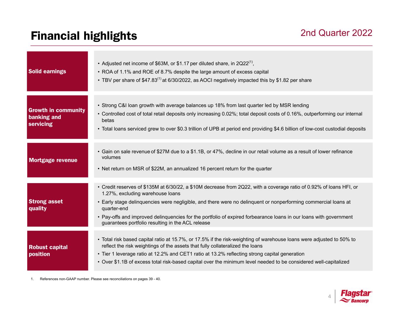 3 2nd Quarter 2022 Unique relationship- based business model • Average C&I loans rose 18% to $2.2B for the quarter • Maintained discipline in our deposit pricing as retail deposit costs increased only 2 basis points • Asset quality remains clean Strengthen mortgage Grow community banking Highly profitable operations • Despite the challenges in mortgage, net income grew $7M, delivering a 1.1% return on average assets for the quarter • Our current quarter earnings demonstrate the resilience of our portfolio of businesses as EPS increased even as gain-on-sale revenue declined to less than 10% of our total revenue Positioned to thrive in any market • This quarter’s results provide yet another validation of our business mix and strategy • We believe we are still in the process of pivoting to a mix that is led by banking and servicing while representing a bottom for the mortgage business – future quarters will get better as banking and servicing continue to grow • NIM expanded 58 basis points to 3.69%; net interest income grew 17% • Average commercial loans, excluding warehouse, grew 9% and ended the quarter 9% higher than the average in the quarter • Delivered a return on average assets of 1.1% • Proactive expense management, combined with the variable cost structure of our mortgage business drove mortgage expenses down 11% • Our mortgage expense ratio declined 10 basis points to 1.14% of closing volume Strategic highlights • Grew our fee-generating portfolio of loans serviced or subserviced by 10% to nearly 1.4M accounts • Average custodial deposits remain an important source of liquidity; as we accumulate more owned MSR, these balances provide more funding at a lower average cost Award winning servicing business 1. References non-GAAP number. Please see reconciliations on pages 39 - 40.