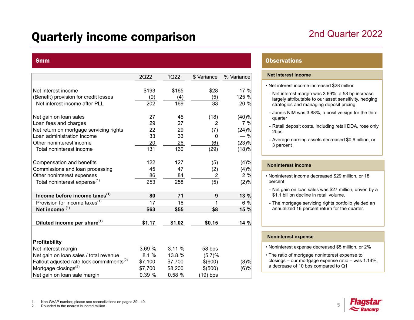 4 2nd Quarter 2022 1. References non-GAAP number. Please see reconciliations on pages 39 - 40. Solid earnings Growth in community banking and servicing • Strong C&I loan growth with average balances up 18% from last quarter led by MSR lending • Controlled cost of total retail deposits only increasing 0.02%; total deposit costs of 0.16%, outperforming our internal betas • Total loans serviced grew to over $0.3 trillion of UPB at period end providing $4.6 billion of low-cost custodial deposits Mortgage revenue Strong asset quality Robust capital position • Total risk based capital ratio at 15.7%, or 17.5% if the risk-weighting of warehouse loans were adjusted to 50% to reflect the risk weightings of the assets that fully collateralized the loans • Tier 1 leverage ratio at 12.2% and CET1 ratio at 13.2% reflecting strong capital generation • Over $1.1B of excess total risk-based capital over the minimum level needed to be considered well-capitalized • Adjusted net income of $63M, or $1.17 per diluted share, in 2Q22(1), • ROA of 1.1% and ROE of 8.7% despite the large amount of excess capital • TBV per share of $47.83(1) at 6/30/2022, as AOCI negatively impacted this by $1.82 per share • Gain on sale revenue of $27M due to a $1.1B, or 47%, decline in our retail volume as a result of lower refinance volumes • Net return on MSR of $22M, an annualized 16 percent return for the quarter • Credit reserves of $135M at 6/30/22, a $10M decrease from 2Q22, with a coverage ratio of 0.92% of loans HFI, or 1.27%, excluding warehouse loans • Early stage delinquencies were negligible, and there were no delinquent or nonperforming commercial loans at quarter-end • Pay-offs and improved delinquencies for the portfolio of expired forbearance loans in our loans with government guarantees portfolio resulting in the ACL release Financial highlights
