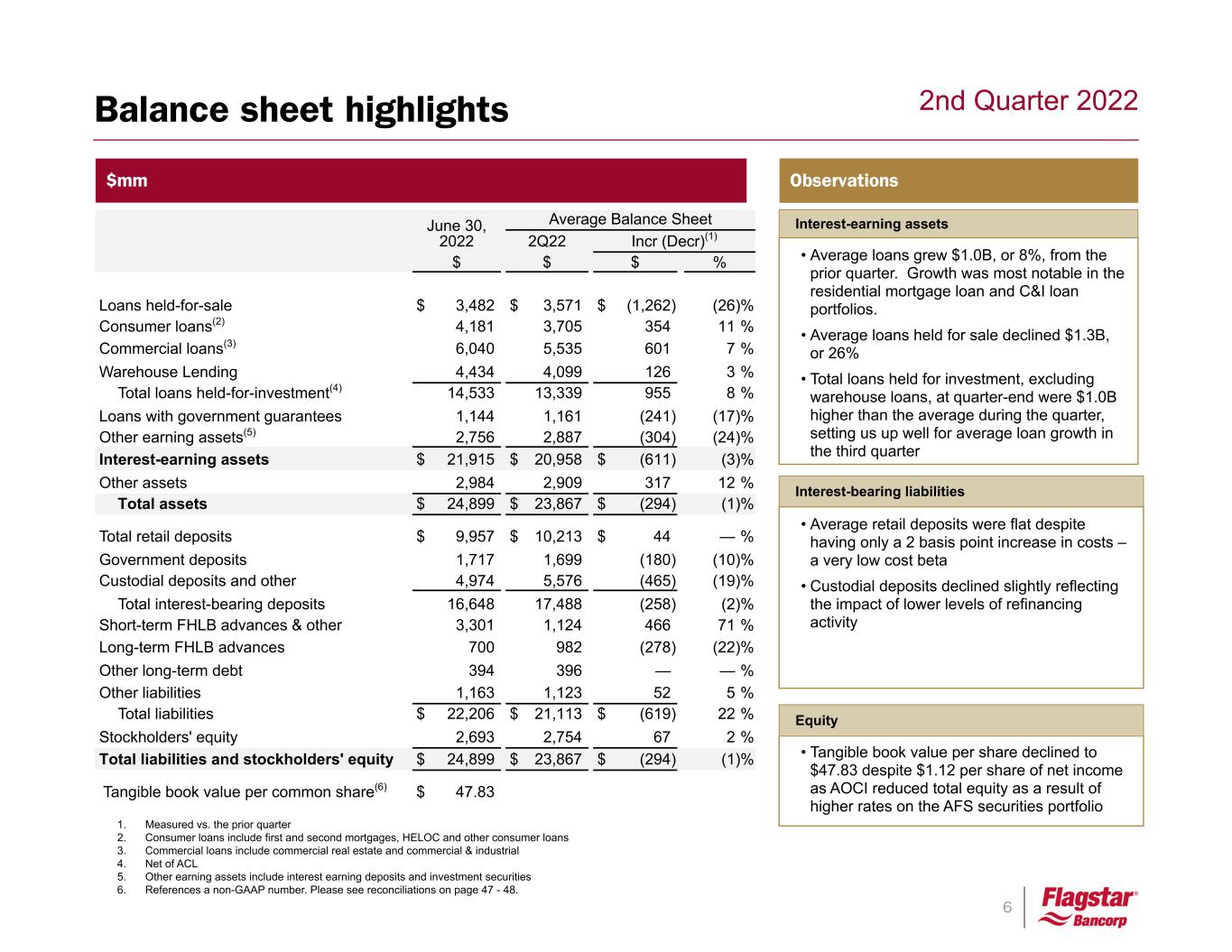 5 2nd Quarter 2022 $mm Observations • Noninterest income decreased $29 million, or 18 percent - Net gain on loan sales was $27 million, driven by a $1.1 billion decline in retail volume. - The mortgage servicing rights portfolio yielded an annualized 16 percent return for the quarter. Noninterest income • Net interest income increased $28 million - Net interest margin was 3.69%, a 58 bp increase largely attributable to our asset sensitivity, hedging strategies and managing deposit pricing. - June’s NIM was 3.88%, a positive sign for the third quarter - Retail deposit costs, including retail DDA, rose only 2bps - Average earning assets decreased $0.6 billion, or 3 percent Net interest income • Noninterest expense decreased $5 million, or 2% • The ratio of mortgage noninterest expense to closings – our mortgage expense ratio – was 1.14%, a decrease of 10 bps compared to Q1 Noninterest expense Quarterly income comparison 1. Non-GAAP number, please see reconciliations on pages 39 - 40. 2. Rounded to the nearest hundred million 2Q22 1Q22 $ Variance % Variance Net interest income $193 $165 $28 17 % (Benefit) provision for credit losses (9) (4) (5) 125 % Net interest income after PLL 202 169 33 20 % Net gain on loan sales 27 45 (18) (40) % Loan fees and charges 29 27 2 7 % Net return on mortgage servicing rights 22 29 (7) (24) % Loan administration income 33 33 0 — % Other noninterest income 20 26 (6) (23) % Total noninterest income 131 160 (29) (18) % Compensation and benefits 122 127 (5) (4) % Commissions and loan processing 45 47 (2) (4) % Other noninterest expenses 86 84 2 2 % Total noninterest expense(1) 253 258 (5) (2) % Income before income taxes(1) 80 71 9 13 % Provision for income taxes(1) 17 16 1 6 % Net income (1) $63 $55 $8 15 % Diluted income per share(1) $1.17 $1.02 $0.15 14 % Profitability Net interest margin 3.69 % 3.11 % 58 bps Net gain on loan sales / total revenue 8.1 % 13.8 % (5.7) % Fallout adjusted rate lock commitments(2) $7,100 $7,700 $(600) (8) % Mortgage closings(2) $7,700 $8,200 $(500) (6) % Net gain on loan sale margin 0.39 % 0.58 % (19) bps