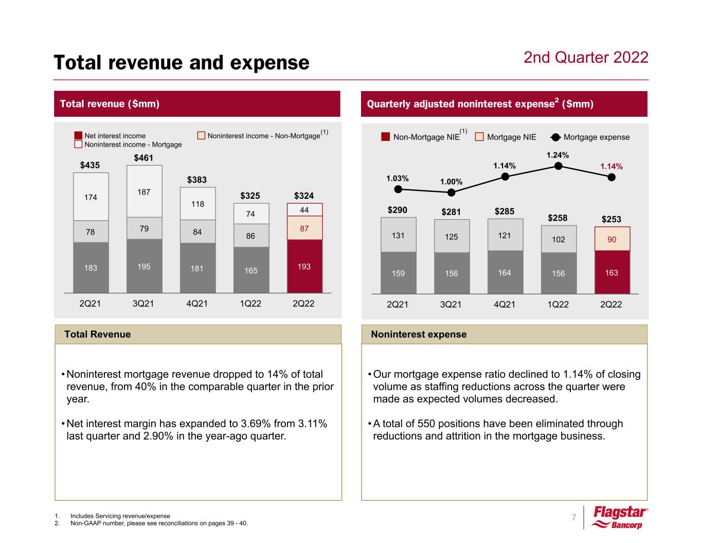 6 2nd Quarter 2022 $mm Observations • Average retail deposits were flat despite having only a 2 basis point increase in costs – a very low cost beta • Custodial deposits declined slightly reflecting the impact of lower levels of refinancing activity Interest-bearing liabilities • Average loans grew $1.0B, or 8%, from the prior quarter. Growth was most notable in the residential mortgage loan and C&I loan portfolios. • Average loans held for sale declined $1.3B, or 26% • Total loans held for investment, excluding warehouse loans, at quarter-end were $1.0B higher than the average during the quarter, setting us up well for average loan growth in the third quarter Interest-earning assets • Tangible book value per share declined to $47.83 despite $1.12 per share of net income as AOCI reduced total equity as a result of higher rates on the AFS securities portfolio Equity Balance sheet highlights June 30, 2022 Average Balance Sheet 2Q22 Incr (Decr)(1) $ $ $ % Loans held-for-sale $ 3,482 $ 3,571 $ (1,262) (26) % Consumer loans(2) 4,181 3,705 354 11 % Commercial loans(3) 6,040 5,535 601 7 % Warehouse Lending 4,434 4,099 126 3 % Total loans held-for-investment(4) 14,533 13,339 955 8 % Loans with government guarantees 1,144 1,161 (241) (17) % Other earning assets(5) 2,756 2,887 (304) (24) % Interest-earning assets $ 21,915 $ 20,958 $ (611) (3) % Other assets 2,984 2,909 317 12 % Total assets $ 24,899 $ 23,867 $ (294) (1) % Total retail deposits $ 9,957 $ 10,213 $ 44 — % Government deposits 1,717 1,699 (180) (10) % Custodial deposits and other 4,974 5,576 (465) (19) % Total interest-bearing deposits 16,648 17,488 (258) (2) % Short-term FHLB advances & other 3,301 1,124 466 71 % Long-term FHLB advances 700 982 (278) (22) % Other long-term debt 394 396 — — % Other liabilities 1,163 1,123 52 5 % Total liabilities $ 22,206 $ 21,113 $ (619) 22 % Stockholders' equity 2,693 2,754 67 2 % Total liabilities and stockholders' equity $ 24,899 $ 23,867 $ (294) (1) % Tangible book value per common share(6) $ 47.83 1. Measured vs. the prior quarter 2. Consumer loans include first and second mortgages, HELOC and other consumer loans 3. Commercial loans include commercial real estate and commercial & industrial 4. Net of ACL 5. Other earning assets include interest earning deposits and investment securities 6. References a non-GAAP number. Please see reconciliations on page 47 - 48.